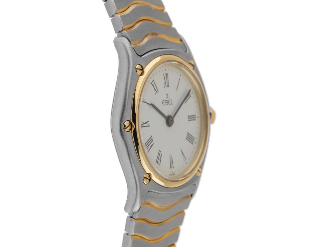 Ebel Sportwave Stahl 18kt Gelbgold Quarz Armband Stahl 18kt GelbgoldGehäuse Edelstahl satiniert, Gehäusedurchmesser ohne Krone 27mm, Gehäusehöhe 5,1mm. Lünette 18kt Gelbgold glatt und poliert, 5-fach verschraubt. Armband Edelstahl / 18kt Gelbgold satiniert, Faltschließe mit Hersteller-Logo. Zifferblatt weiß mit schwarzen römischen Ziffern und schwarzen Zeigern. Uhrwerk quarzgesteuert, Kaliber Ebel 81 mit 9 Edelsteinen. Anzeige von Stunde und Minute über Zeiger aus der Mitte. Saphirglas kratzfest. Krone mit Flankenschutz. Boden Edelstahl 4-fach verschraubt und graviert. Gewicht der Uhr inklusive Armband 45g, Länge des Armbandes inklusive Gehäuse 165mm. Referenznummer: 181908, Baujahr: 1996, ID: KRE27001125RE-2290, Artikelnummer: 10000083111. Mit Gangkontrolle, neuer Batterie und kompletter äußerlicher Aufarbeitung von November 2025. Original Ebel Box. Superschnäppchen. Sehr guter Zustand. Lieferzeit sofort.