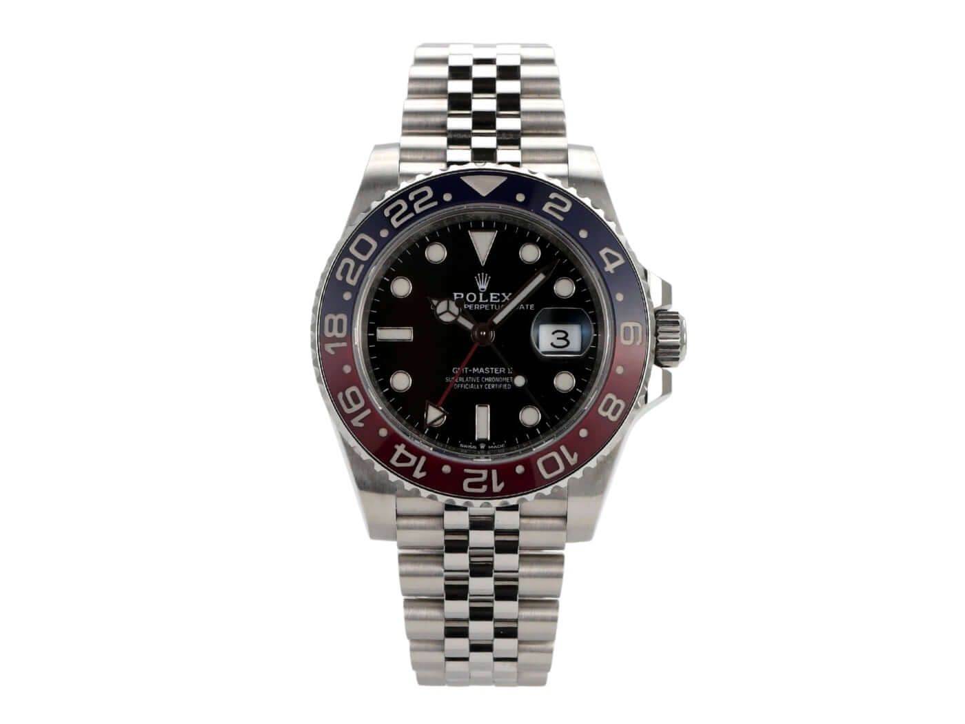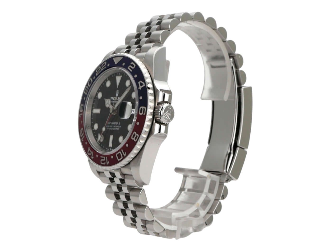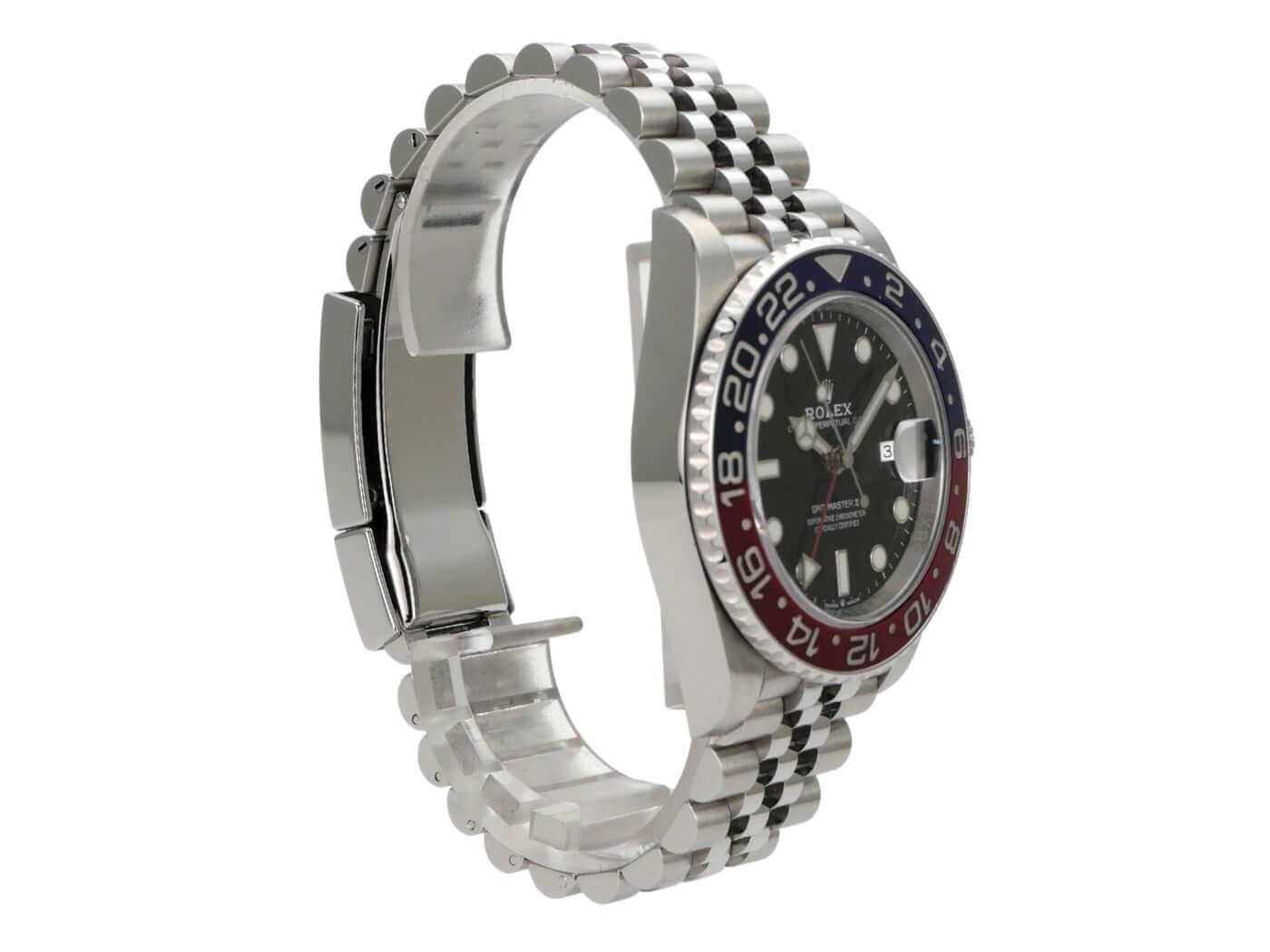 Rolex GMT-Master II stainless steel 126710BLRO from 2020 LC100Polished and satin-finished stainless steel case, case diameter 40 mm, case height 12 mm, stainless steel bezel with fluting and blue/red ceramic insert, 24-hour scale rotatable in both directions, Jubilee stainless steel bracelet polished and satin-finished with safety folding clasp, black dial with applied luminous indices and luminous dots, luminous hands, automatic movement, Rolex manufacture caliber 3285 with 31 jewels, frequency 28,800 A/h, 70-hour power reserve, date display, GMT / second time zone, chronometer, sapphire crystal, screw-down crown with flank protection, screw-down stainless steel case back, water-resistant up to 10 bar.