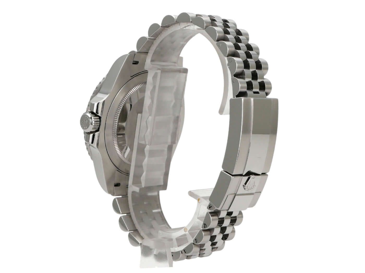 Caixa em aço inoxidável polido e acetinado, diâmetro da caixa 40 mm, altura da caixa 12 mm, bezel em aço inoxidável com ranhuras e inserto cerâmico azul/vermelho, escala de 24 horas rotativa em ambas as direções, bracelete Jubilee em aço inoxidável polido e acetinado com fecho de segurança dobrável, mostrador preto com índices luminosos aplicados e pontos luminosos, ponteiros luminosos, movimento automático, calibre 3285 da manufatura Rolex com 31 rubis, frequência de 28.800 A/h, reserva de marcha de 70 horas, display de data, GMT / segundo fuso horário, cronômetro, cristal de safira, coroa rosqueada com proteção lateral, fundo da caixa em aço inoxidável rosqueado, resistente à água até 10 bar.
