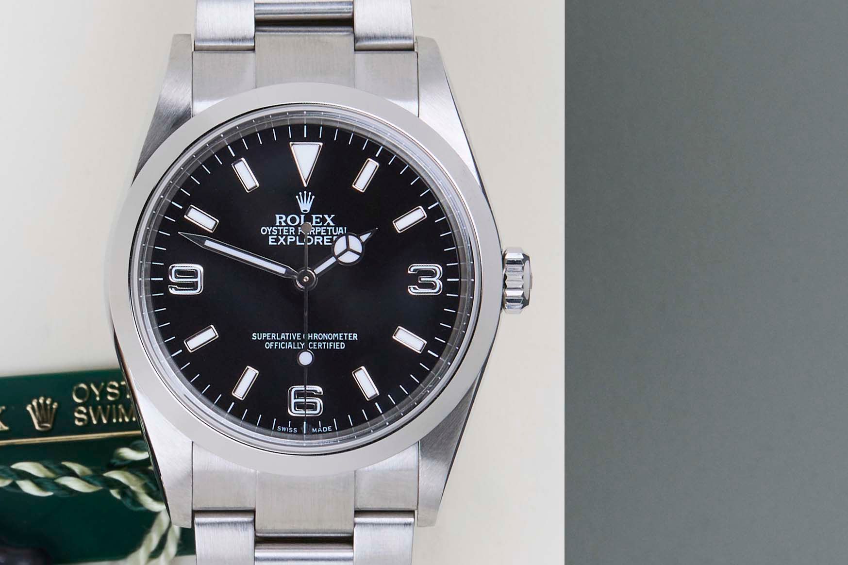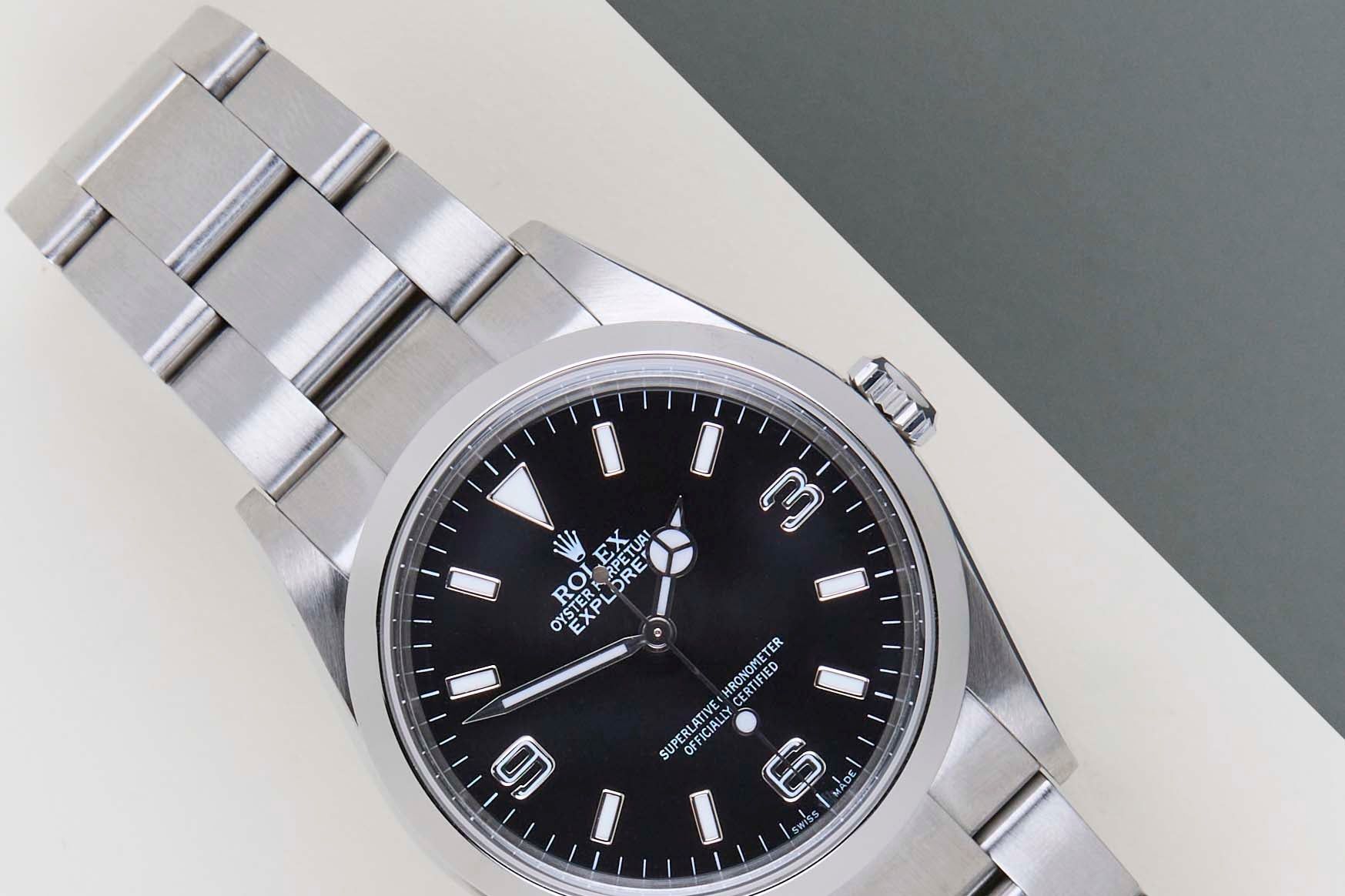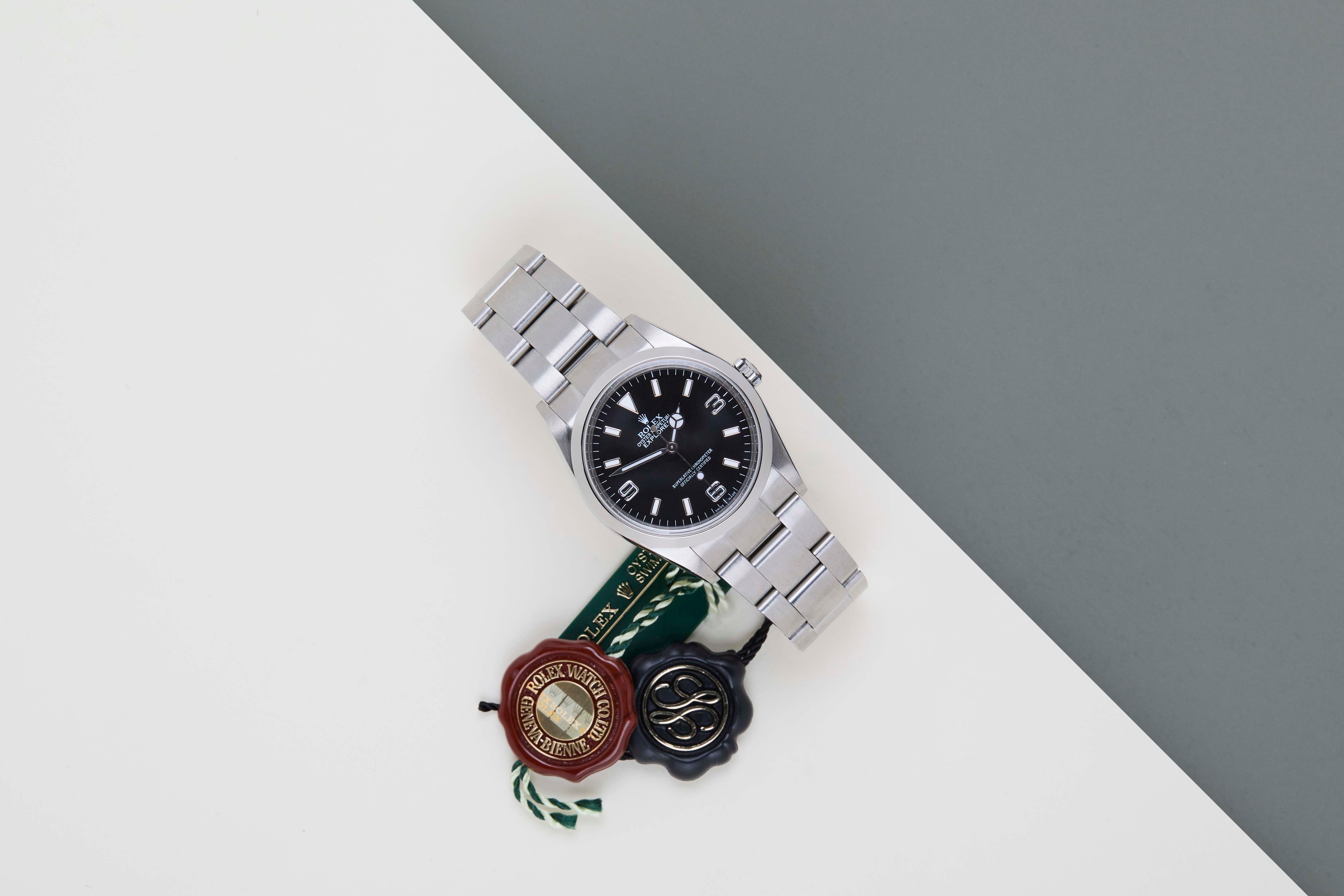 Full Set | Both Swing Tags | Bracelet Code 78690 | Solid End Links | Clasp Code CL9 | Including Rolex Green Tag The Rolex Explorer I was first introduced in 1953, in conjunction with Sir Edmund Hillary and Tenzing Norgay's successful ascent of Mount Everest. The Explorer I marked a significant milestone in the company's commitment to producing reliable and accurate timepieces for adventurers.The original Rolex Explorer I had a 36mm case diameter, which was considered a suitable size for the time. The watch was designed to be rugged, durable, and easily legible. The Explorer I's design was characterized by its simple and clean dial with large Arabic numerals at the 3, 6, and 9 o'clock positions, as well as the distinctive Mercedes hands.The Rolex Explorer I stands as a testament to humanity's unyielding curiosity and the desire to push boundaries. As wrists don this timepiece, they carry forward the stories of mountaineers, adventurers, and those who have always sought to explore the unexplored.This Rolex Explorer I 36 is in Mint condition and comes as a full-set with the original Rolex Warranty Papers and Box from December 2004. Furthermore, the watch has been serviced by our watchmaker, and therefore it comes with one year of Steiner Warranty.