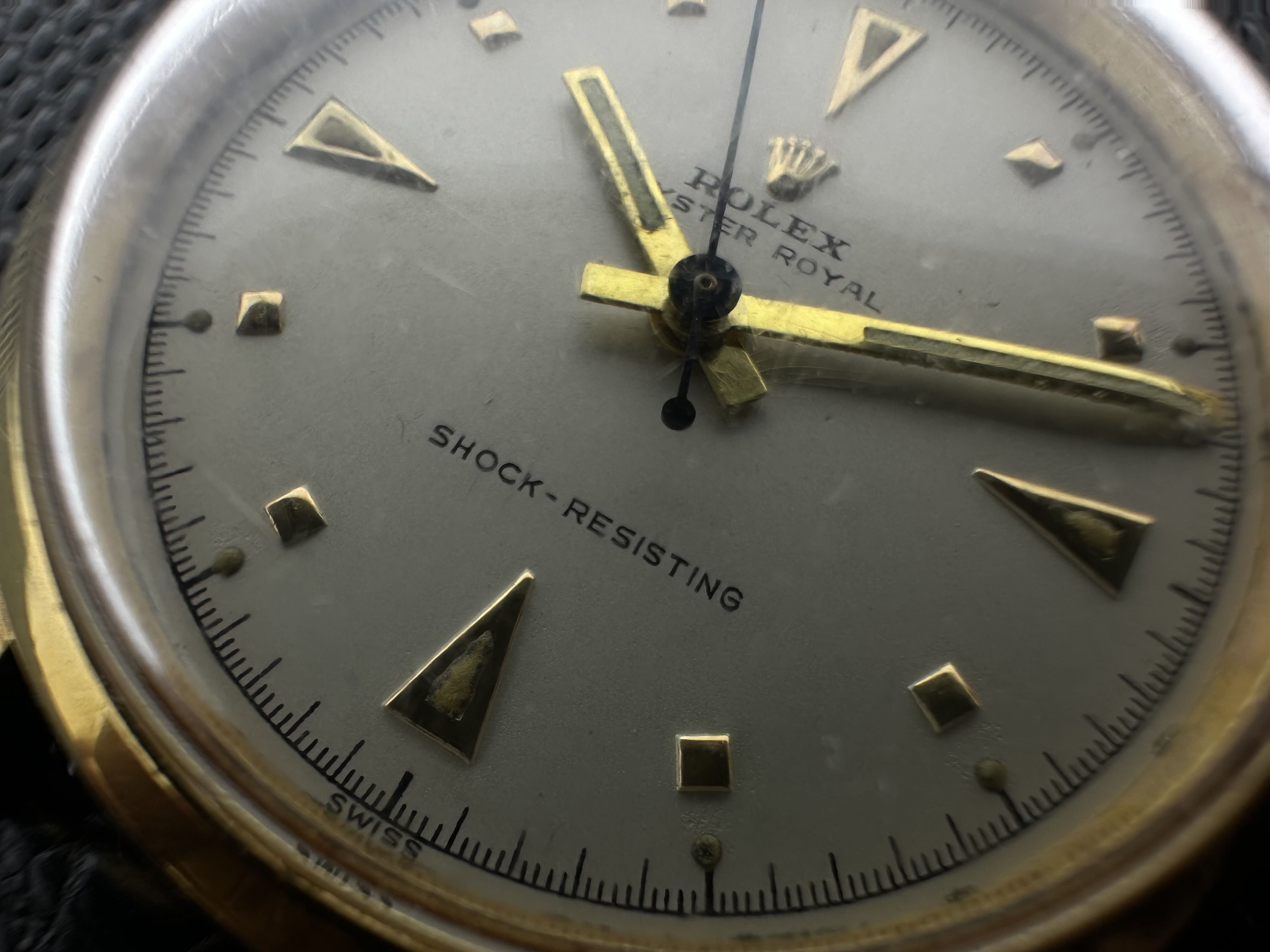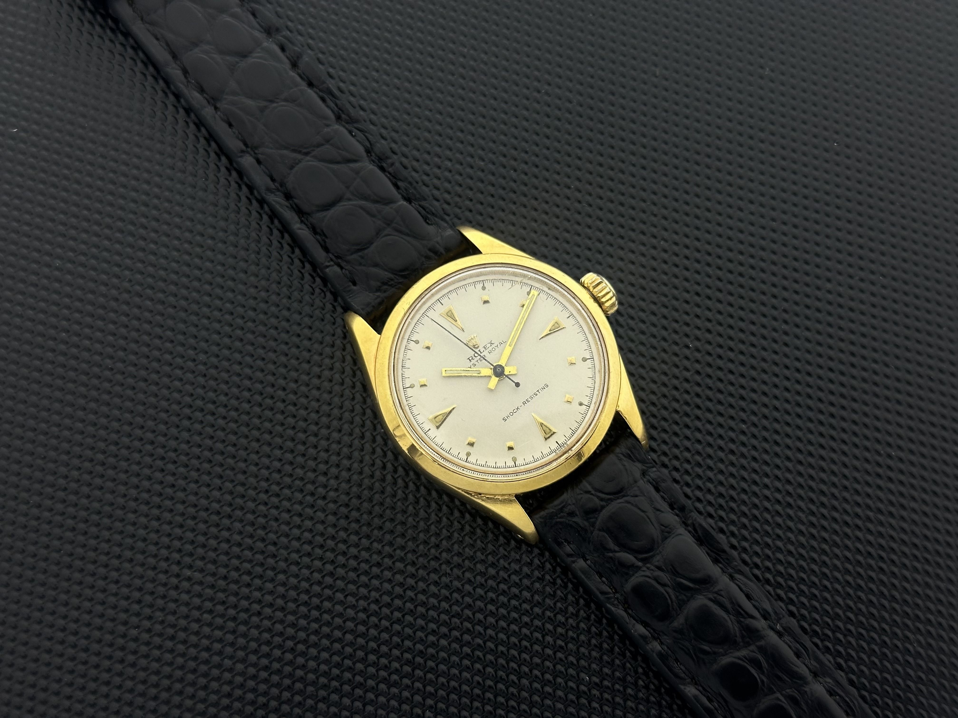 Um relógio Rolex Oyster Royal Shock-Resisting em ouro/ aço dos anos 50. O Rolex tem uma caixa de 32mm em ouro/aço e está equipado com uma pulseira de couro de crocodilo preto. O relógio possui um mostrador prateado com marcadores de hora dourados. O relógio é de 1956 e tem um movimento manual.