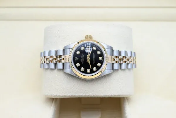 Rolex Lady-Datejust Ref. 69173 com a mostrador de diamante preto de 1996 em excelente estado, incluindo a caixa e os documentos originais. Todos os nossos relógios foram minuciosamente verificados pelo nosso próprio relojoeiro e servidos quando necessário.