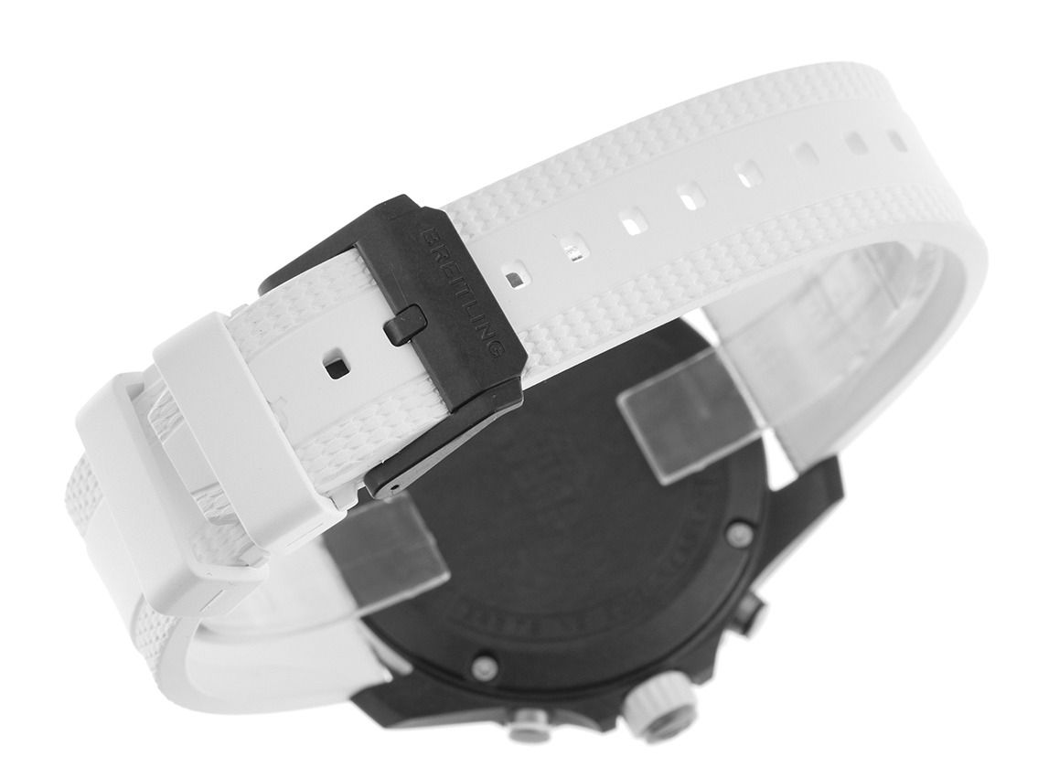 Caixa em Breitlight® satinada, diâmetro da caixa sem coroa 44mm, altura da caixa 12,5mm. Luneta em Breitlight® com rosa dos ventos, giratória dos dois lados. Pulseira de borracha branca, largura da asa 22mm, fecho de pino Breitling em Breitlight® com logotipo do fabricante. Mostrador preto com números árabes aplicados e ponteiros luminosos em aço inoxidável. Movimento Superquartz, mecanismo termocompensado, cronógrafo, calibre Breitling 82 com 4 pedras preciosas. Exibição de horas e minutos através de ponteiros centrais, pequeno segundo com parada de segundos para ajuste preciso da hora às 6 horas, exibição de data com ajuste rápido entre 4 e 5 horas. Vidro de safira resistente a riscos e antirreflexo em ambas as faces. Coroa com proteção lateral e logotipo do fabricante, 2 vedantes. Fundo em Breitlight® com 4 parafusos e gravado. Peso do relógio incluindo a pulseira 61g. À prova d'água até 10 ATM. Número de referência: X82310A71B1S2, ID: ST116049751125H-3600, número do artigo: 10000083364. Caixa original Breitling e documentos de garantia de 2025, além de descrição, conjunto completo. Sem uso. Prazo de entrega imediato.