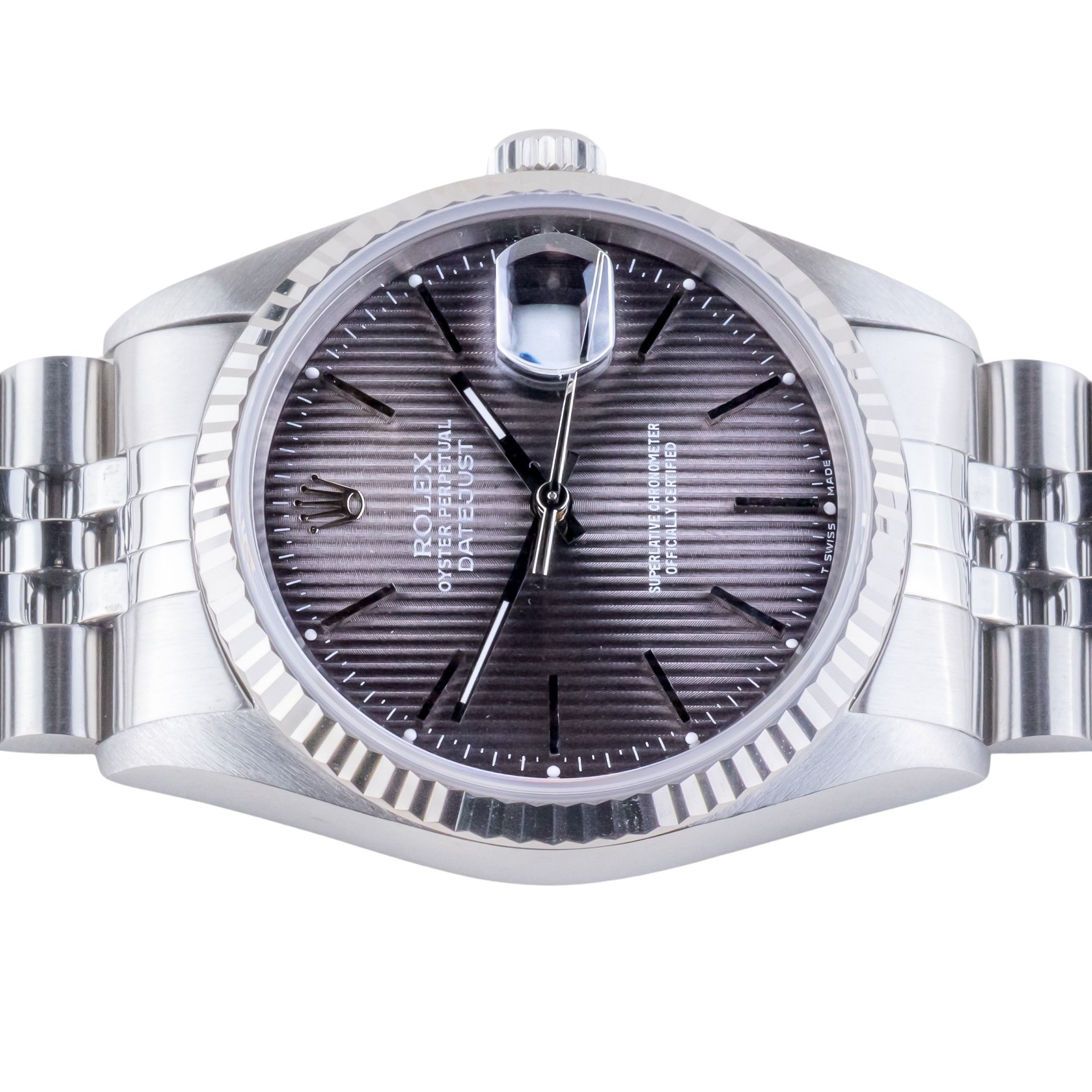 Rolex Oyster Perpetual Datejust referência 16234 de 1998. O Datejust 16234 possui uma caixa de aço inoxidável de 36mm, uma pulseira Jubilee de aço inoxidável e um bezel estriado de ouro branco 18k. Este Datejust 16234 conta com um movimento automático calibre 3135 com função de data rápida, um cristal de safira resistente a arranhões e um mostrador em cinza tapeçado.