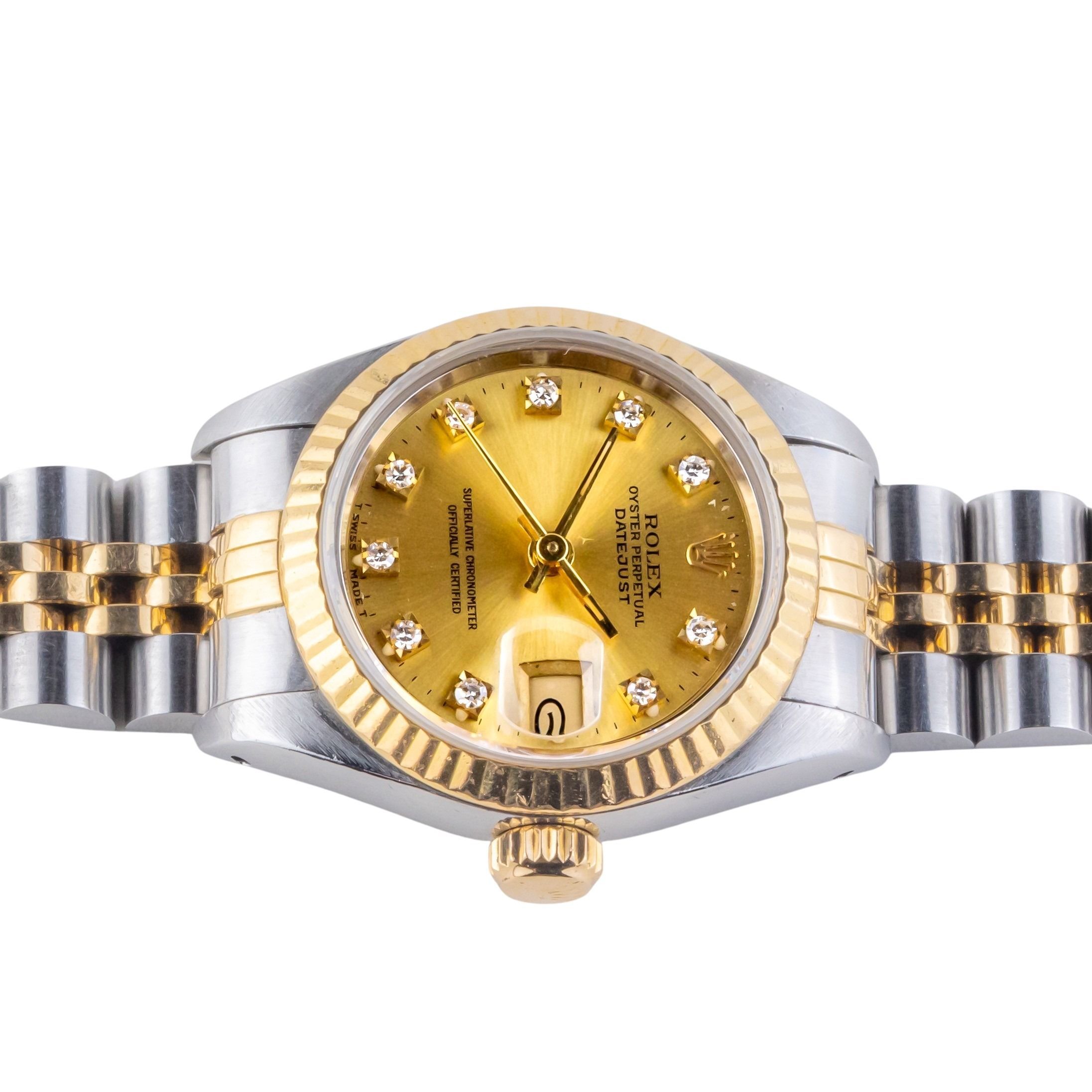Rolex Oyster Perpetual Lady-Datejust Referência 69173 de 1991 com conjunto completo. A Lady-Datejust 69173 mede 26 mm e possui uma caixa em ouro e aço inoxidável, pulseira Jubilee bicolor e bezel estriado em ouro 14k. Esta Lady-Datejust 69173 tem um movimento automático calibre 2135 com função de data Quickset, cristal de safira resistente a arranhões e um mostrador champanhe com índices de diamante.