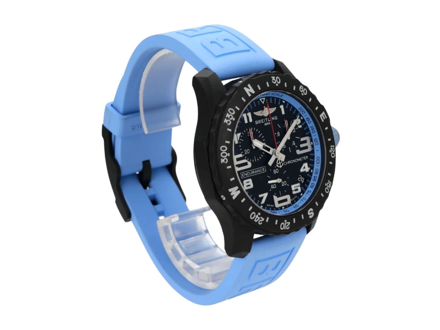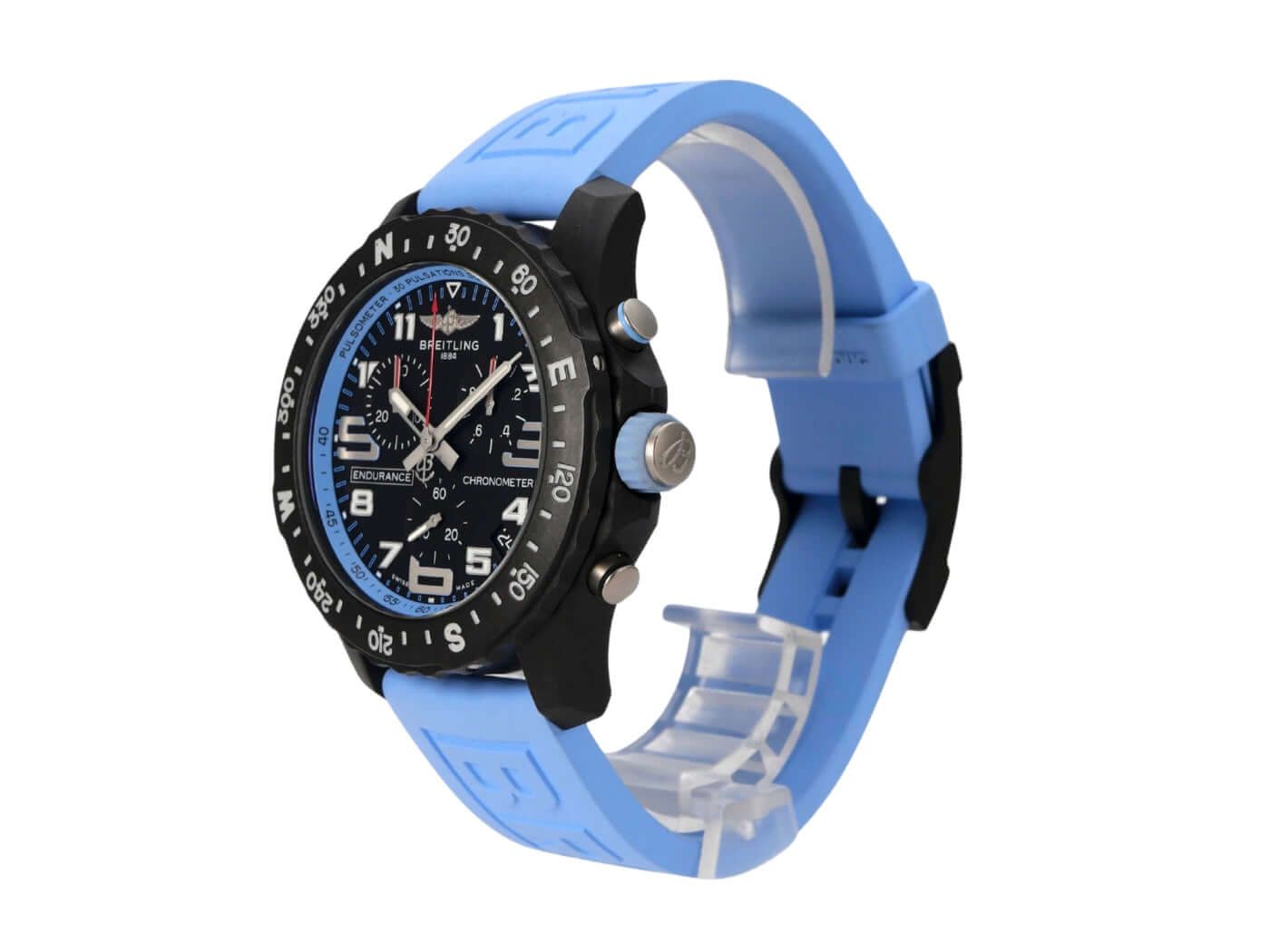 Breitling Endurance Pro X82310281B1S1Case made of Breitlight, case diameter 44 mm, case height 12.5 mm, Breitlight bezel rotatable on both sides, blue rubber strap with pin buckle, black dial with applied luminous numerals and luminous hands, quartz movement, Breitling 82, date display, chronograph, chronometer, sapphire crystal double anti-reflective coating, Breitlight case back, water-resistant up to 10 bar.