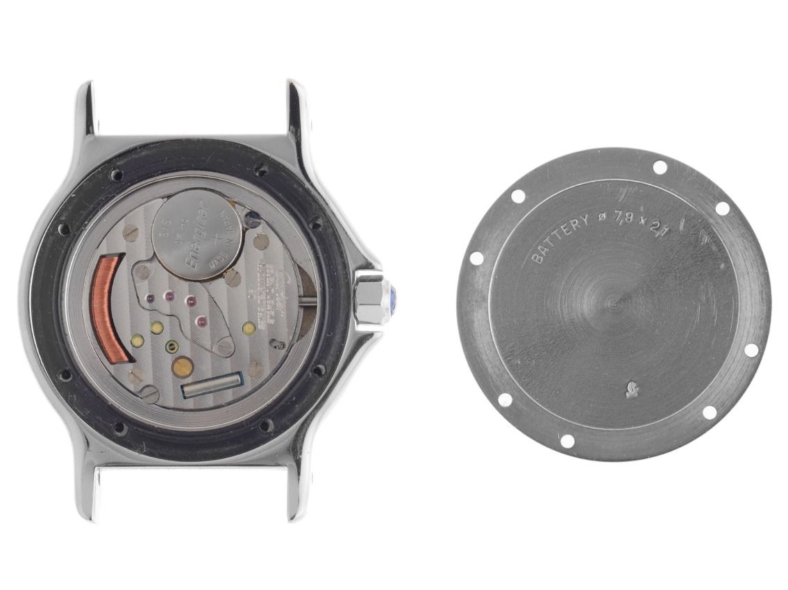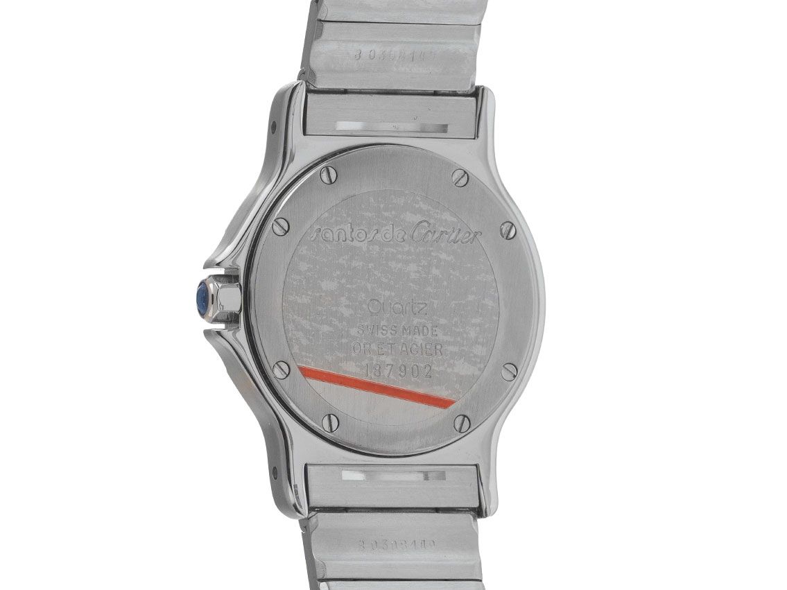 Caixa em aço inoxidável acetinado, diâmetro da caixa sem coroa 30mm, altura da caixa 6,4mm. Luneta em ouro amarelo 18kt octogonal e 8 vezes parafusada e polida. Bracelete em aço inoxidável / ouro amarelo 18kt polido e acetinado, fecho dobrável em aço inoxidável com logotipo do fabricante. Mostrador creme com números romanos pretos e ponteiros azulados. Movimento a quartzo, calibre 87 com 7 pedras preciosas. Exibição de horas, minutos e segundos através de ponteiros centrais com parada de segundos para ajuste preciso do horário, exibição de data com ajuste rápido às 3 horas. Vidro de safira resistente a riscos. Coroa com cabochão de espinela. Fundo em aço inoxidável 8 vezes parafusado e gravado. Peso do relógio incluindo o bracelete 65g, comprimento do bracelete incluindo a caixa 165mm. Número de referência: 187902, número da caixa: 07XXX, ID: P170340181025H-4200, número do artigo: 10000082587. Com controle de precisão, nova bateria e completa reforma externa de novembro de 2025. Caixa original da Cartier e extrato do Watch Register de novembro de 2025, Certificado do Watch Register / sem registro (Banco de dados internacional para relógios perdidos ou roubados). Super oportunidade, investimento com potencial de valorização, peça de colecionador muito rara. Muito bom estado. Prazo de entrega imediato.