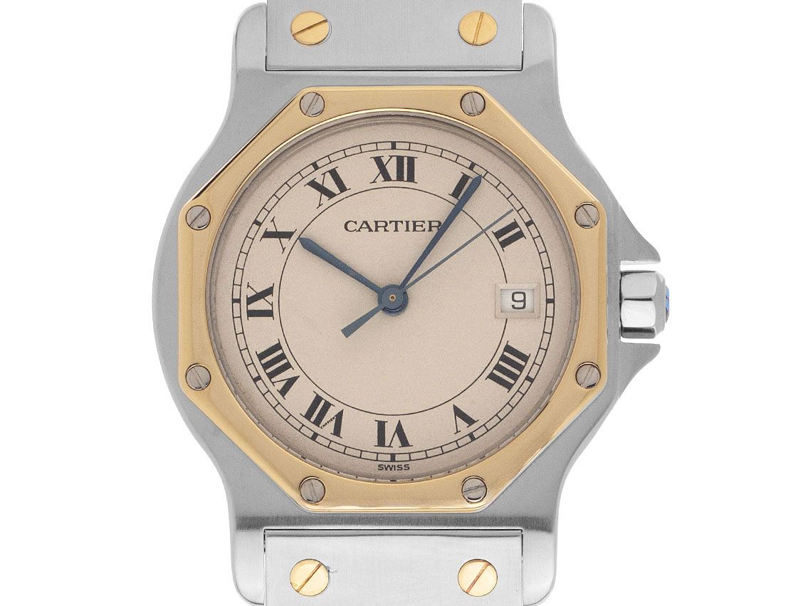 Cartier Santos Octagon GM großes Modell Stahl 18kt Gelbgold Quarz Armband Stahl 18kt GelbgoldGehäuse Edelstahl satiniert, Gehäusedurchmesser ohne Krone 30mm, Gehäusehöhe 6,4mm. Lünette 18kt Gelbgold 8-eckig und 8-fach verschraubt und poliert. Armband Edelstahl / 18kt Gelbgold poliert und satiniert, Faltschließe Edelstahl mit Hersteller- Logo. Zifferblatt cremeweiß mit schwarzen römischen Ziffern und gebläuten Zeigern. Uhrwerk quarzgesteuert, Kaliber 87 mit 7 Edelsteinen. Anzeige von Stunde, Minute und Sekunde über Zeiger aus der Mitte mit Sekundenstopp zur sekundengenauen Einstellung der Uhrzeit, Datumsanzeige mit Schnellverstellung bei 3 Uhr. Saphirglas kratzfest. Krone mit Spinell Cabochon. Boden Edelstahl 8-fach verschraubt und graviert. Gewicht der Uhr inklusive Armband 65g, Länge des Armbandes inklusive Gehäuse 165mm. Referenznummer: 187902, Gehäusenummer: 07XXX, ID: P170340181025H-4200, Artikelnummer: 10000082587. Mit Gangkontrolle, neuer Batterie und kompletter äußerlicher Aufarbeitung von November 2025. Original Cartier Box und Watchregister Auszug von November 2025, The Watch Register Zertifikat / ohne Eintrag (Internationale Datenbank für verlorene oder gestohlene Uhren). Superschnäppchen, Kapitalanlage mit Wertsteigerungspotential, sehr seltenes Sammlerstück. Sehr guter Zustand. Lieferzeit sofort.