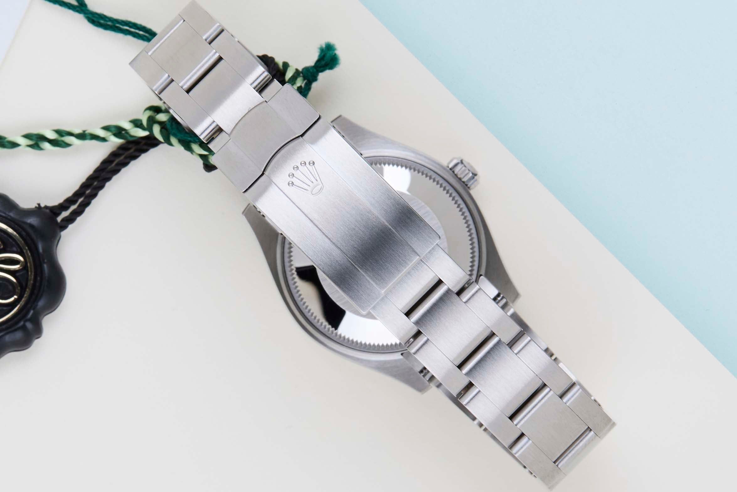 Este Rolex Oyster Perpetual 31 'Mostrador Azul' foi vendido pela primeira vez em Outubro de 2025. O relógio é totalmente feito de aço inoxidável. A Rolex utiliza 904L em seus relógios de aço, que é uma superliga extremamente resistente e altamente polível.