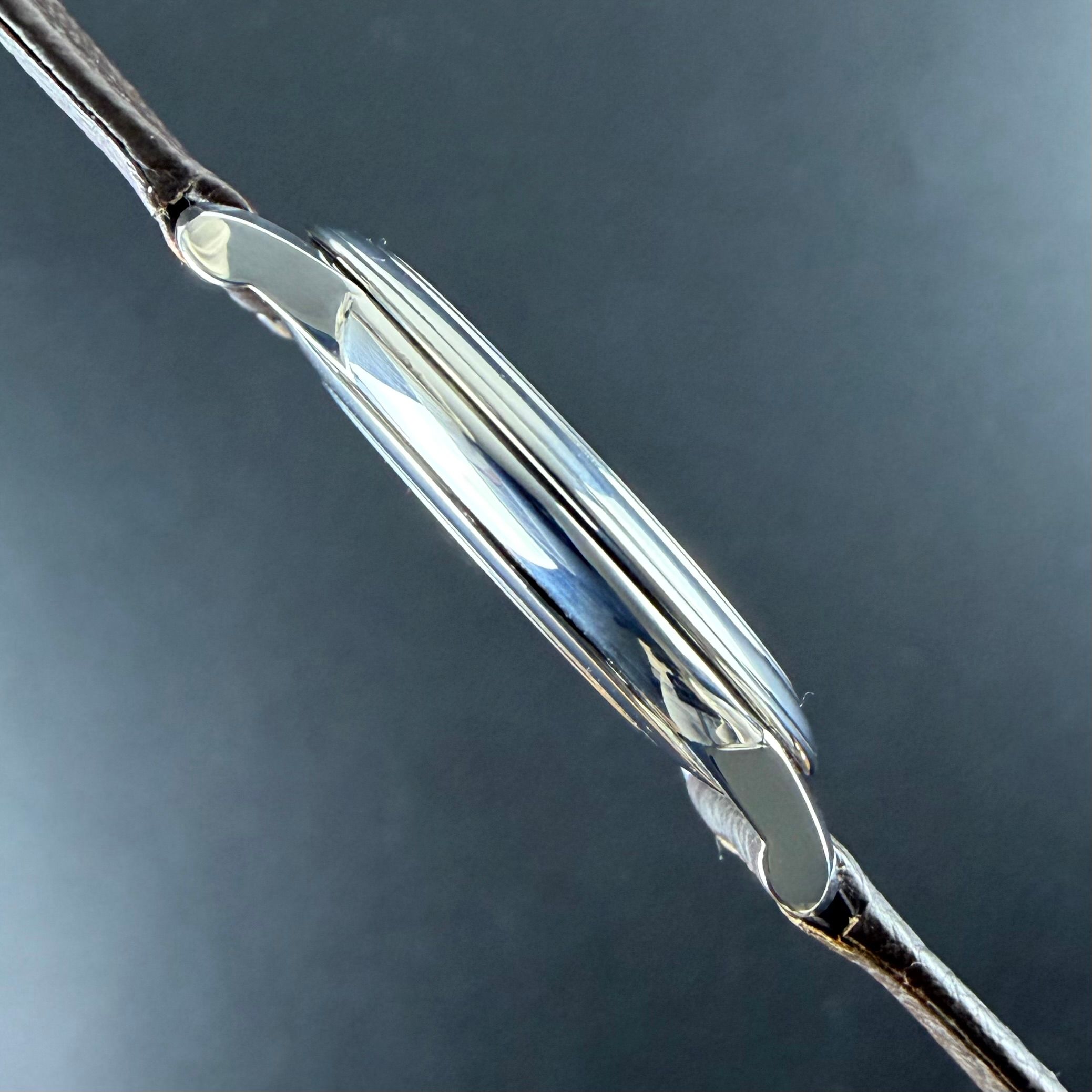 Este Omega De Ville Prestige vintage, produzido em 1993, permanece em condição impecável, com quase nenhum sinal de uso. Seu mostrador está intocado, e o movimento foi revisado em novembro de 2025, agora funcionando e operando perfeitamente. O relógio apresenta um design elegante com uma espessura de apenas 6,4mm. Ele vem com uma pulseira de couro de bezerro marrom em um design afunilado e não acolchoado, para complementar o estilo de vestido sofisticado. O relógio é totalmente original, exceto pela pulseira recém-substituída, e sua condição geral é excelente, quase como novo.