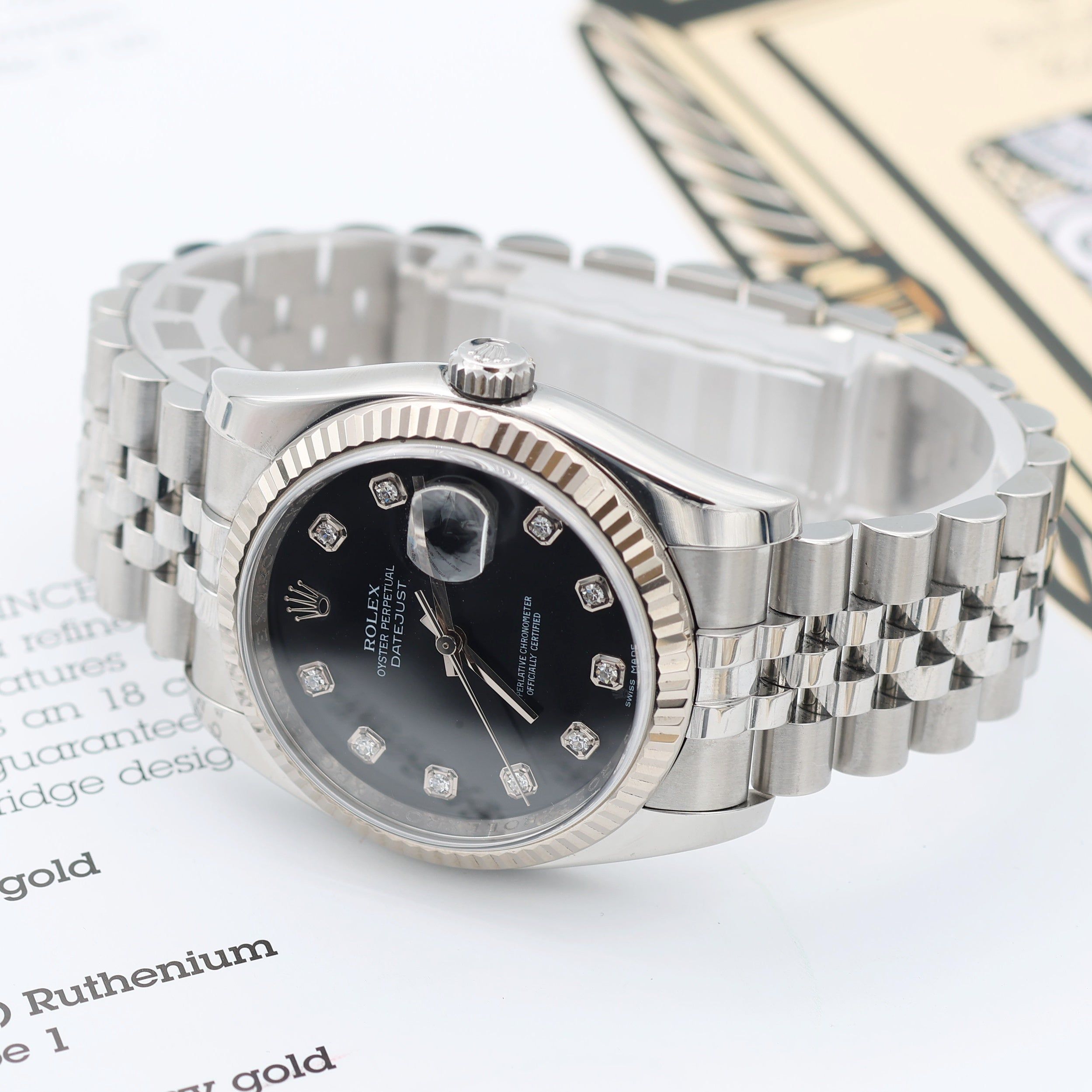 For sale at Debonar Watches: pre-owned Rolex Datejust 116234, in excellent conditions, with a sportive black dial with diamonds, full set.Elevate your watch collection with the Rolex Datejust 116234, a symbol of sophistication and craftsmanship.This exemplar has been paired with a Jubilee bracelet, the most classic option with a Datejust. If you’re only going to be wearing one watch from now on, it needs to be one that you can wear in any situation: the Rolex Datejust 36mm ref 116234. This is the modern descendent of the classic DJs of the 1950s: the one we have here is the classic 36mm size, not the 41mm Datejust II. A bit of its story:Rolex DateJust (inspired by Rolex Bubbleback) was first introduced in 1945 to celebrate the 40th anniversary of Rolex. The Datejust is one of the earliest Rolex models that survives till today.From its debut way back in 1945, a revolutionary launch that put the brand firmly on the map, it has remained at the top of the company’s bestseller list for three quarters of a century. BRAND ROLEX MODEL DATEJUST REFERENCE 116234 CASE MATERIAL STEEL MOVEMENT AUTOMATIC DIMENSION 36 MM DIAL BLACK DIAMONDS BEZEL WHITE GOLD CRYSTAL SAPPHIRE BRACELET TYPE JUBILEE BRACELET MATERIAL STEEL BRACELET LENGHT 18 CM ORIGINAL BOX YES ORIGINAL PAPERS YES YEAR APPROX. '10s CONDITION EXCELLENT