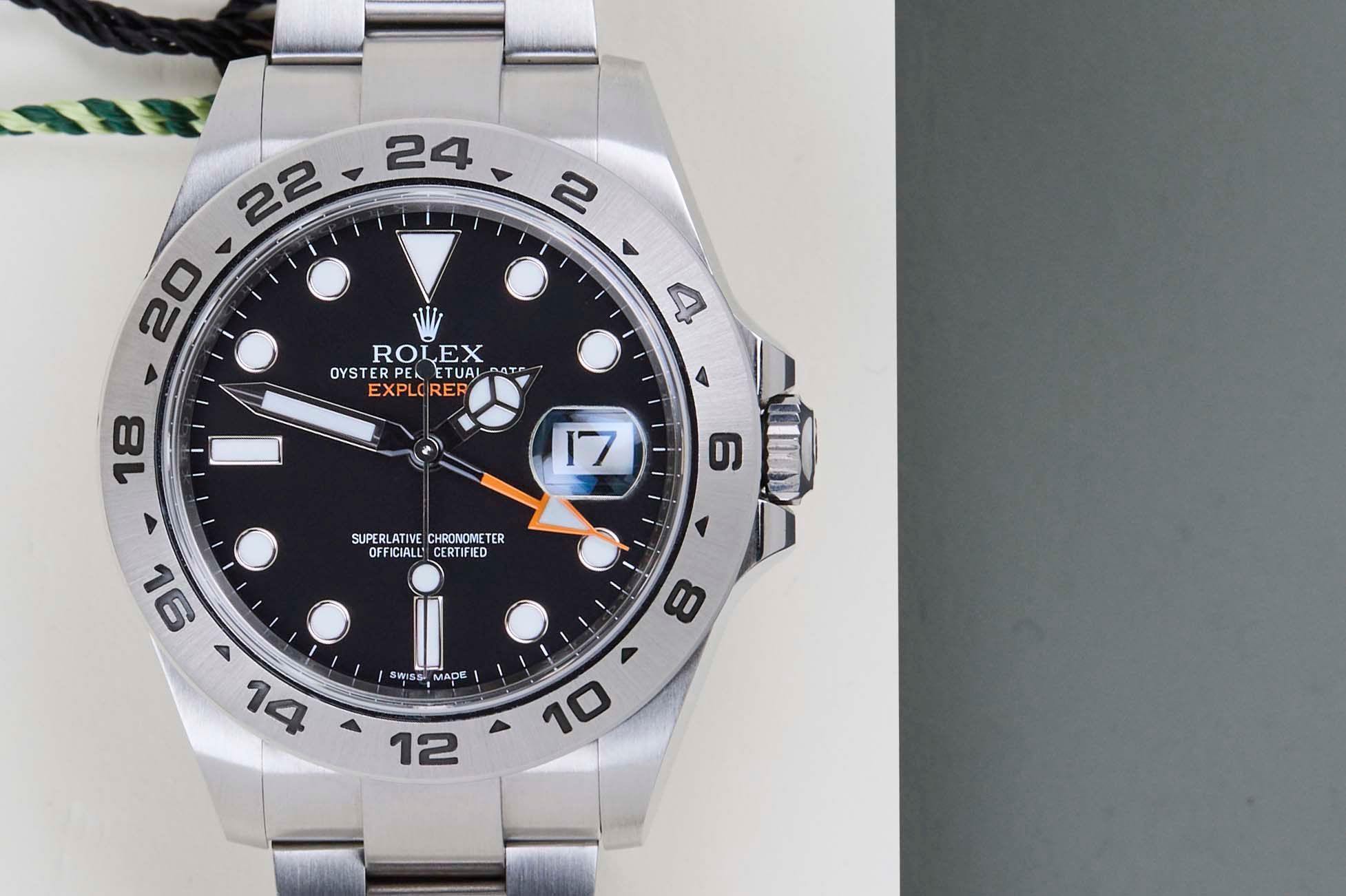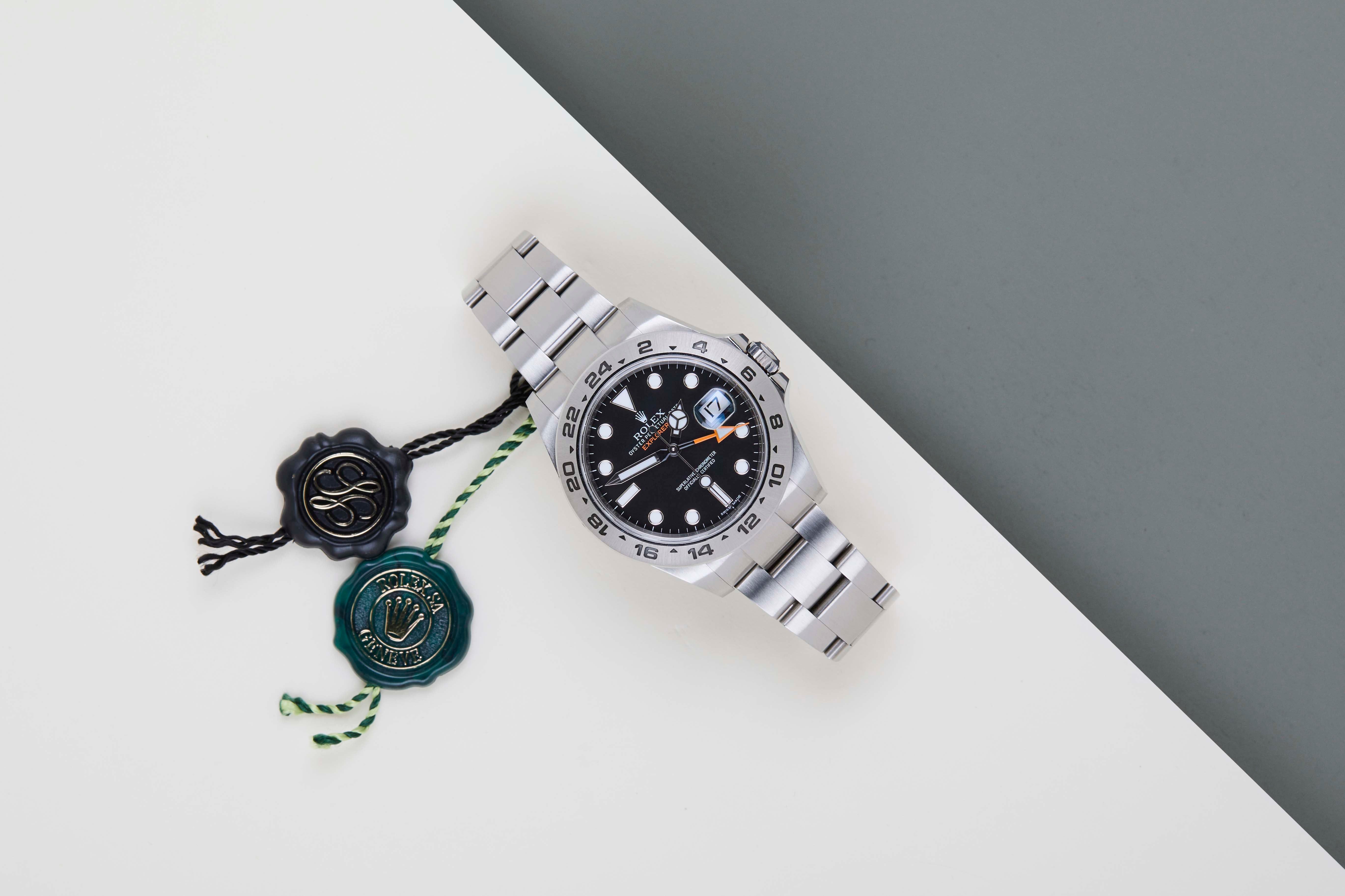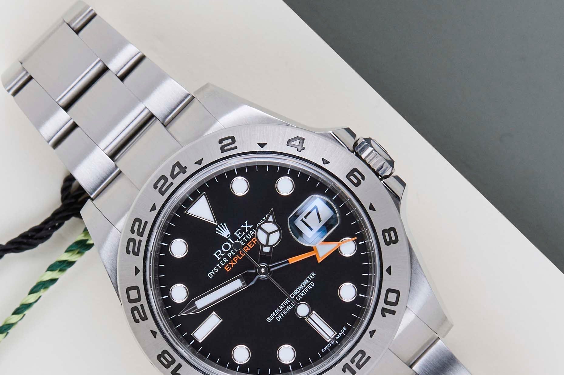 Este Rolex Explorer II 'Mostrador Preto' foi vendido pela primeira vez em janeiro de 2016. O explorador vem equipado com uma pulseira Oyster, que conta com o Easylink. Esta extensão permite ao usuário aumentar ou diminuir a pulseira em 5 milímetros, melhorando a usabilidade e o conforto do relógio.