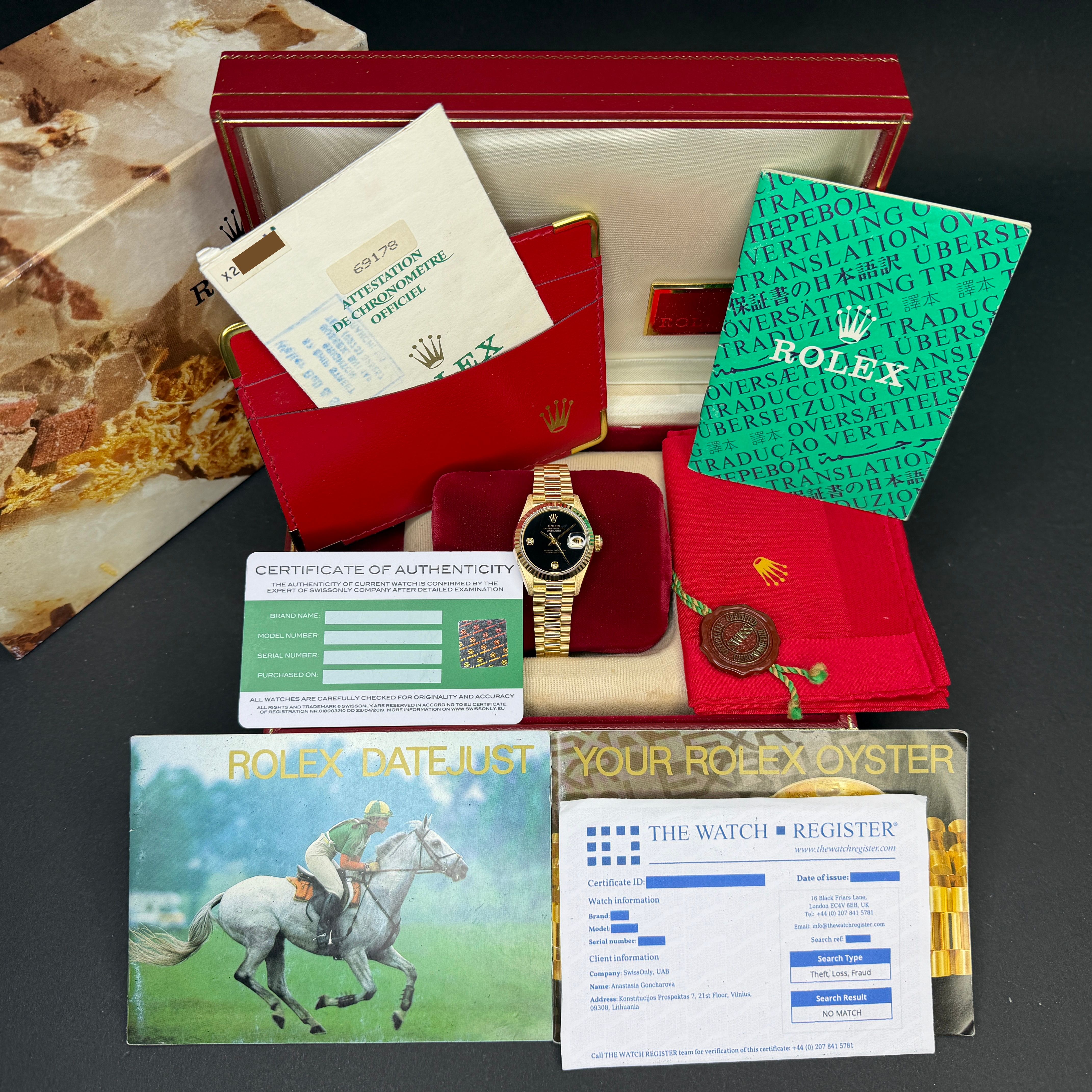 Rolex Lady Datejust, 69178, 26mm, 1991, Yellow gold, Onyx dial, Fullset, 1y warranty