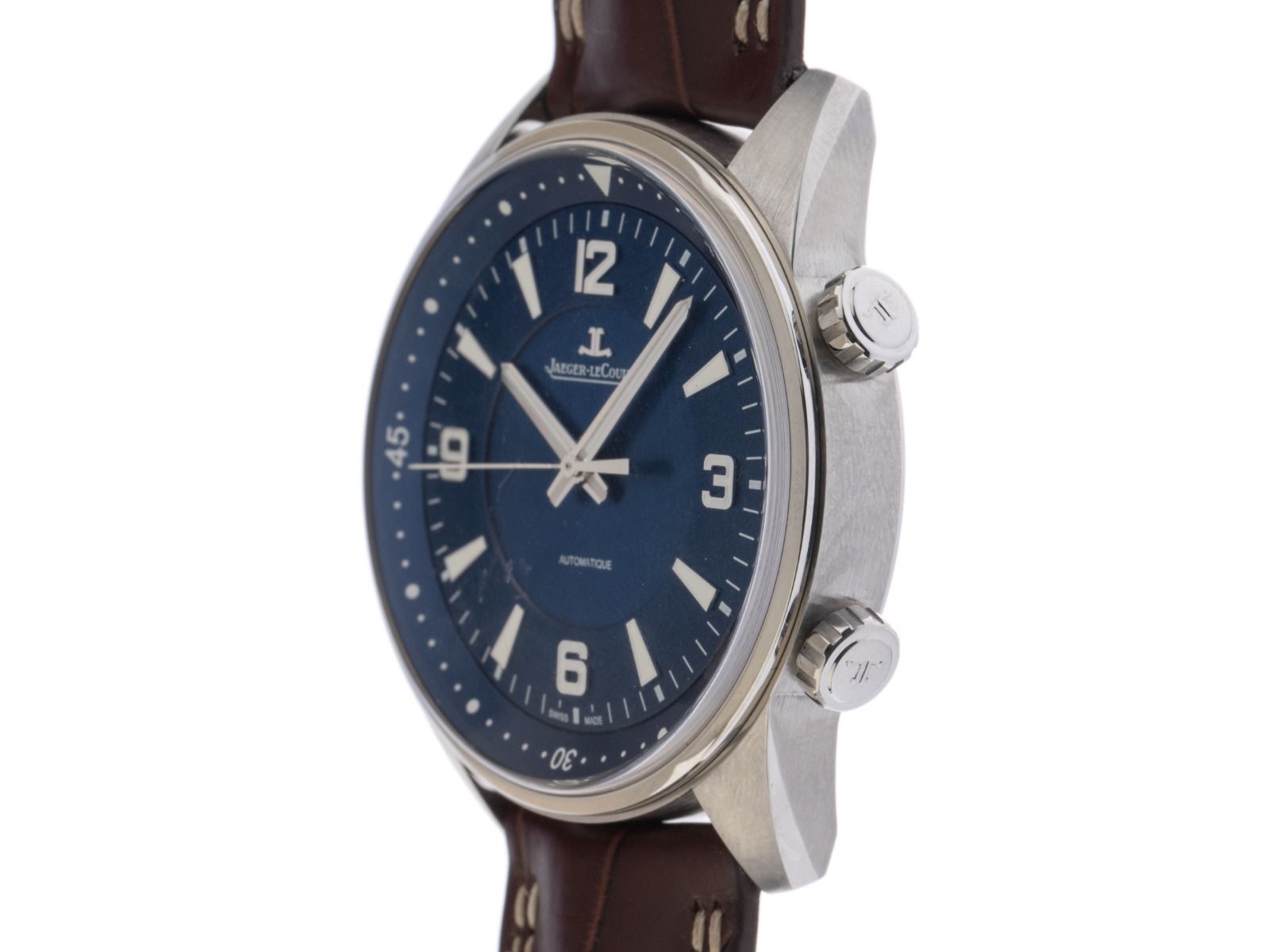 Jaeger-leCoultre Polaris Stahl Automatik Armband Krokoleder FaltschließeGehäuse Edelstahl satiniert und poliert, Gehäusedurchmesser ohne Krone 41mm, Gehäusehöhe 11,2mm. Lünette Edelstahl glatt und poliert, Unterglaslünette mit 60-Minuten Skala, drehbar über Krone bei 2 Uhr. Jaeger-leCoultre Armband Krokoleder braun mit Ziernaht, Anstoßbreite 21mm, Faltschließe Edelstahl mit Hersteller-Logo. Zifferblatt blau mit aufgesetzten arabischen Leuchtziffern und Edelstahl Indexen sowie Edelstahl Leuchtzeigern, rotierender Rehaut, einstellbar über Krone bei 2 Uhr. Uhrwerk Automatik, Chronograph, Kaliber Jaeger-leCoultre 898 mit 30 Edelsteinen. Anzeige von Stunde, Minute und Sekunde über Zeiger aus der Mitte mit Sekundenstopp zur sekundengenauen Einstellung der Uhrzeit. Saphirglas kratzfest und gewölbt. Krone zum Einstellen der Uhrzeit mit Hersteller-Logo bei 4 Uhr. Boden Edelstahl 4-fach verschraubt und graviert mit Saphirglas Sichtfenster. Gewicht der Uhr inklusive Armband 85g. Referenznummer: 841.8.37S, Gehäusenummer: 3498XXX, Baujahr: 2021, ID: P200586001125H-11500, Artikelnummer: 10000083437. Original Jaeger-leCoultre Box mit Umkarton und Watchregister Auszug von November 2025, The Watch Register Zertifikat / ohne Eintrag (Internationale Datenbank für verlorene oder gestohlene Uhren). Wie Neu. Lieferzeit sofort
