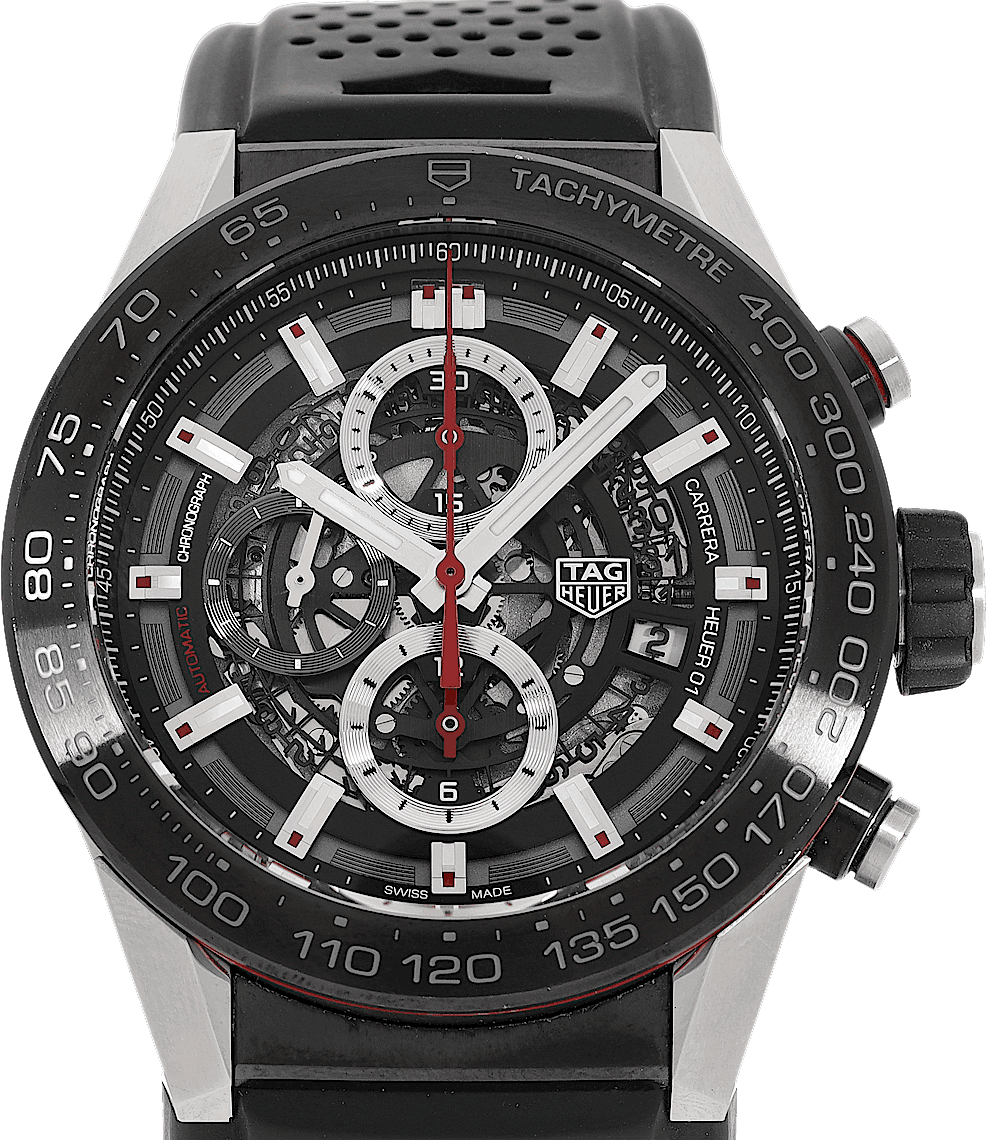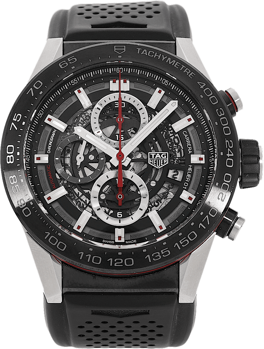 TAG Heuer Carrera, Reference: CAR2A1Z.WWQ7854, Gender: Male, Size: 45mm, Dial color: Transparent, Strap material: Rubber, Movement: Automatic, Year: 2015, Condition: Previously worn with some signs of usage. The movement is flawless and the case has been cleaned. watch tested to ensure full functionality. An inspection by our certified watchmakers guarantees its authenticity., Documents: Original papers, CHRONEXT Certificate