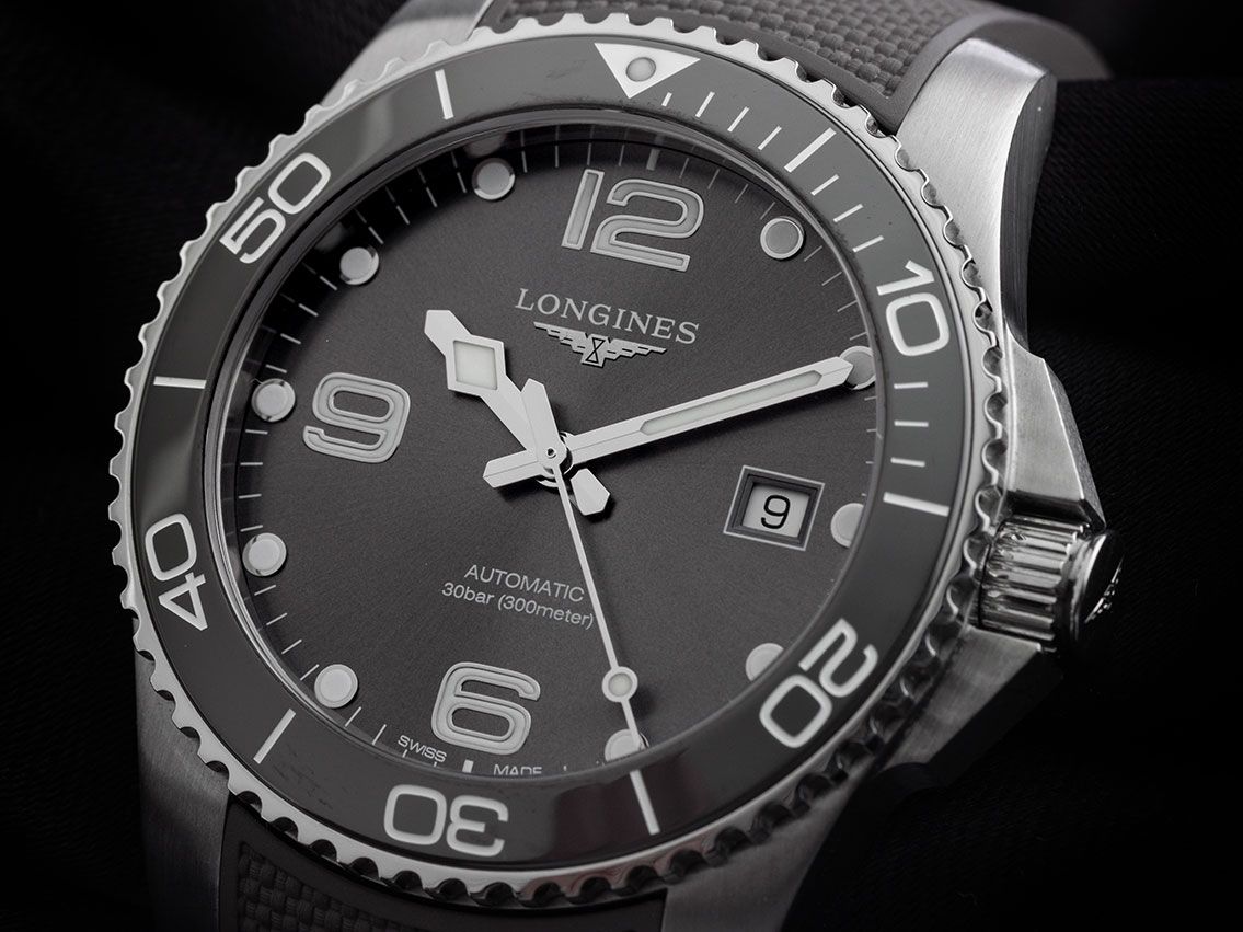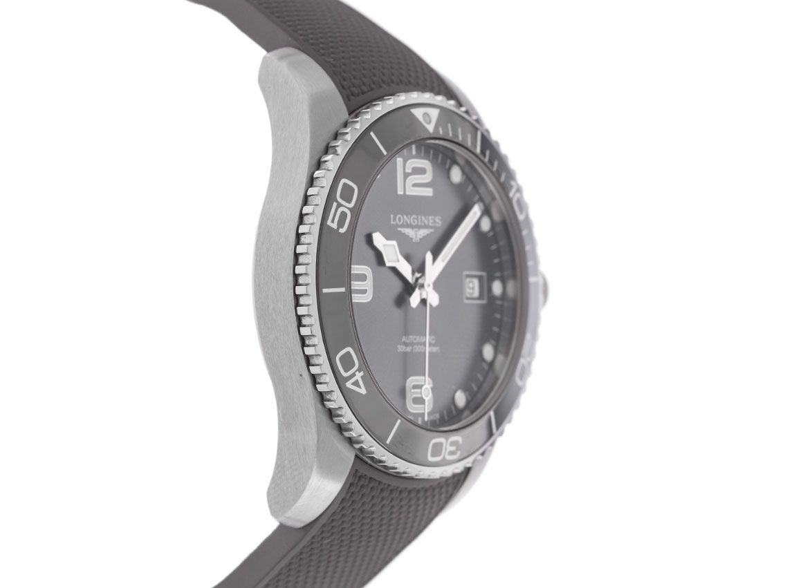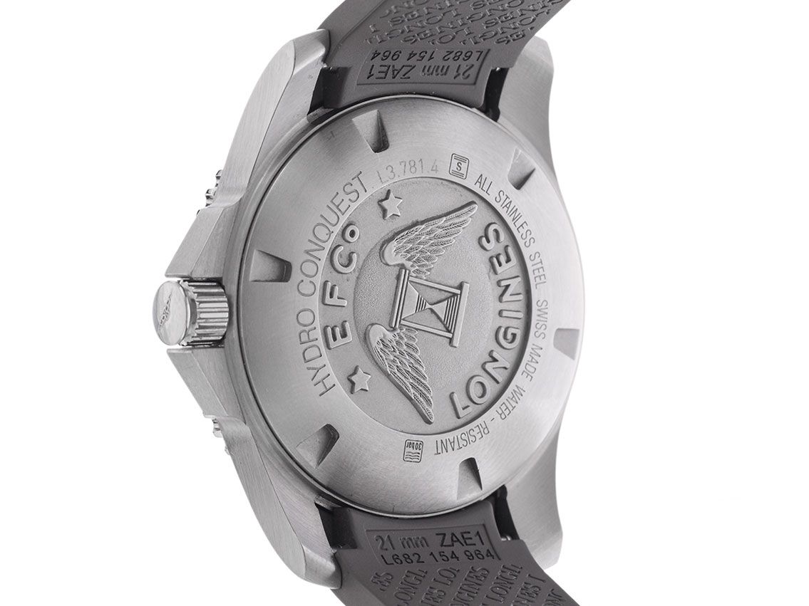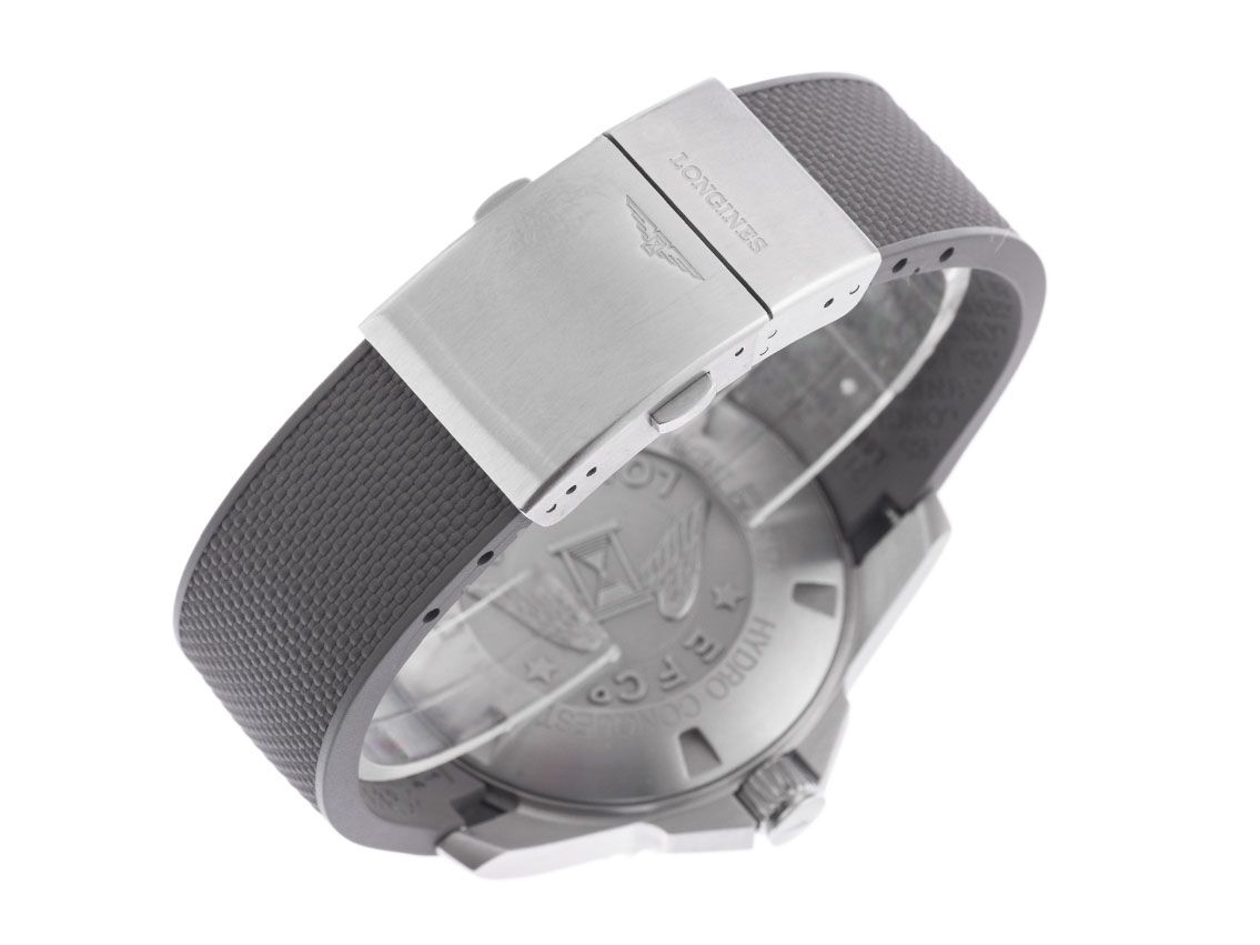 Caixa em aço inoxidável acetinado, diâmetro da caixa sem coroa 43mm, altura da caixa 11,9mm. Luneta em aço inoxidável com inserto de cerâmica cinza e divisão de 60 minutos, unidirecional. Bracelete de borracha cinza, largura da asa 21mm. Fecho de segurança dobrável em aço inoxidável com logotipo do fabricante. Mostrador cinza com índices aplicados, números árabes e ponteiros luminosos em aço inoxidável. Movimento automático, Longines Calibre L888 com 21 rubis, reserva de marcha de aproximadamente 72 horas. Exibição de horas, minutos e segundos através de ponteiros centrais com parada de segundos para ajuste preciso da hora, exibição de data com ajuste rápido às 3 horas. Vidro de safira resistente a riscos. Coroa rosqueada com proteção lateral e logotipo do fabricante. Fundo em aço inoxidável rosqueado e gravado. Peso do relógio incluindo o bracelete 143g. À prova d'água até 30 ATM. Número de referência: L3.782.4.76.9, ID: ST610223401125H-1950, número do artigo: 10000083488. Caixa original Longines com embalagem e documentos de garantia de 2025, Full Set. Sem uso. Prazo de entrega imediato.