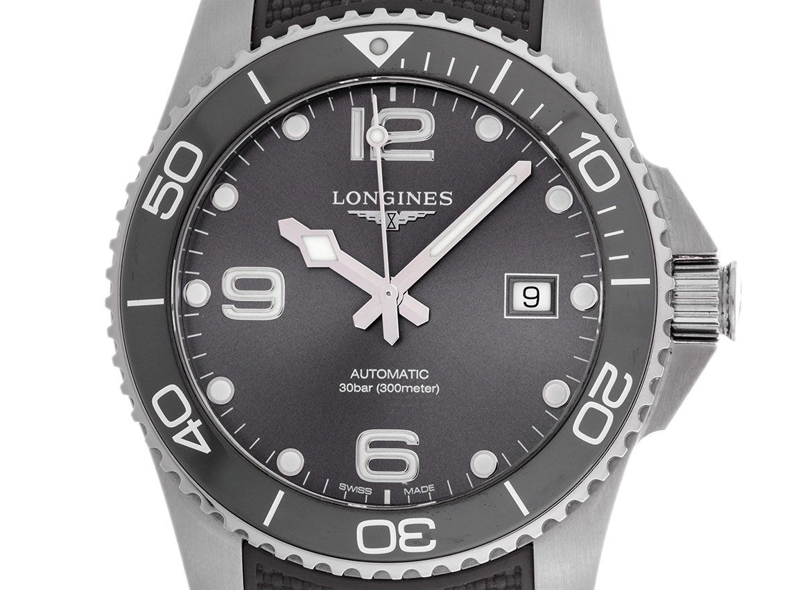 Longines Hydroconquest Stahl Automatik Armband Kautschuk FaltschließeGehäuse Edelstahl satiniert, Gehäusedurchmesser ohne Krone 43mm, Gehäusehöhe 11,9mm. Lünette Edelstahl mit grauem Keramik Inlay und 60-Minuten Einteilung, einseitig drehbar. Armband Kautschuk grau, Anstoßbreite 21mm. Sicherheitsfaltschließe Edelstahl mit Hersteller-Logo. Zifferblatt grau mit aufgesetzten Indexen, arabischen Ziffern und Edelstahl Leuchtzeigern. Uhrwerk Automatik, Longines Kaliber L888 mit 21 Edelsteinen, Gangreserve ca. 72 Stunden. Anzeige von Stunde, Minute und Sekunde über Zeiger aus der Mitte mit Sekundenstopp zur sekundengenauen Einstellung der Uhrzeit, Datumsanzeige mit Schnellverstellung bei 3 Uhr. Saphirglas kratzfest. Krone verschraubbar mit Flankenschutz und Hersteller-Logo. Boden Edelstahl verschraubt und graviert. Gewicht der Uhr inklusive Armband 143g. Wasserdicht bis 30 ATM. Referenznummer: L3.782.4.76.9, ID: ST610223401125H-1950, Artikelnummer: 10000083488. Original Longines Box mit Umkarton und Garantie Papiere von 2025, Full Set. Ungetragen. Lieferzeit sofort.