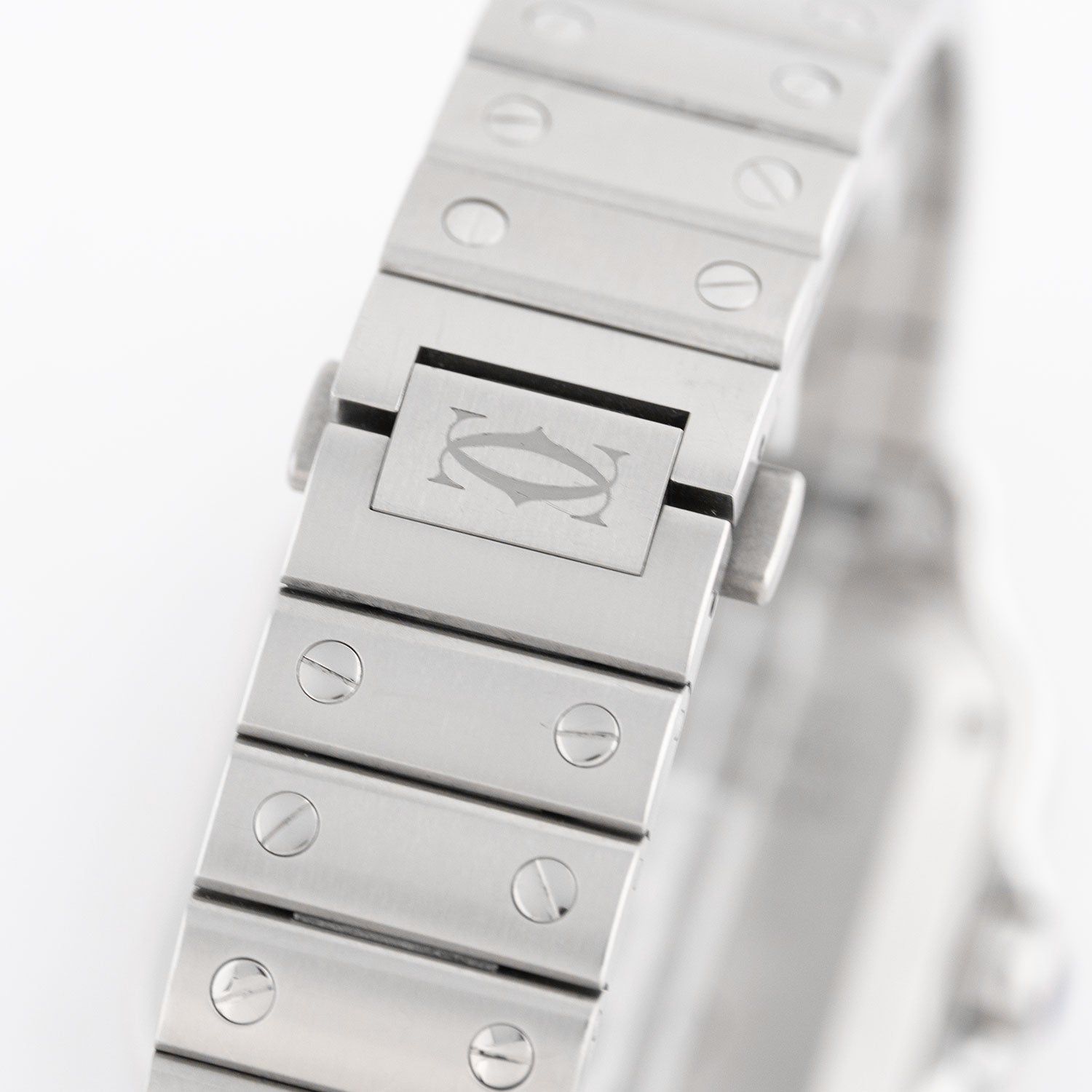 Cartier Santos de Cartier Medium ModelDie Cartier Santos de Cartier Medium Model mit braunem Zifferblatt ist eine beeindruckende Neuinterpretation eines zeitlosen Klassikers. Das 35,1 mm große Gehäuse aus Edelstahl präsentiert sich mit der charakteristischen quadratischen Lünette von Cartier, die elegant poliert und satiniert ist. Das warme braune Sonnenschliff-Zifferblatt wird durch schwertförmige Zeiger und römische Ziffern stilvoll ergänzt, wodurch eine moderne und zugleich edle Ästhetik entsteht. Im Inneren der Uhr arbeitet das Automatikwerk Cartier 1847 MC, das für präzise Zuverlässigkeit und eine Gangreserve von etwa 42 Stunden sorgt. Ein kratzfestes Saphirglas und eine Wasserdichtigkeit bis 100 Meter machen diese Uhr zu einem robusten Begleiter für den Alltag. Dieses Modell verfügt über einen QuickSwitch-Mechanismus. Wir geben ein Jahr Gewährleistung auf die Funktionalität des Uhrwerks. Bitte beachten Sie, dass diese Uhr nach §25 UStG differenzbesteuert ist.