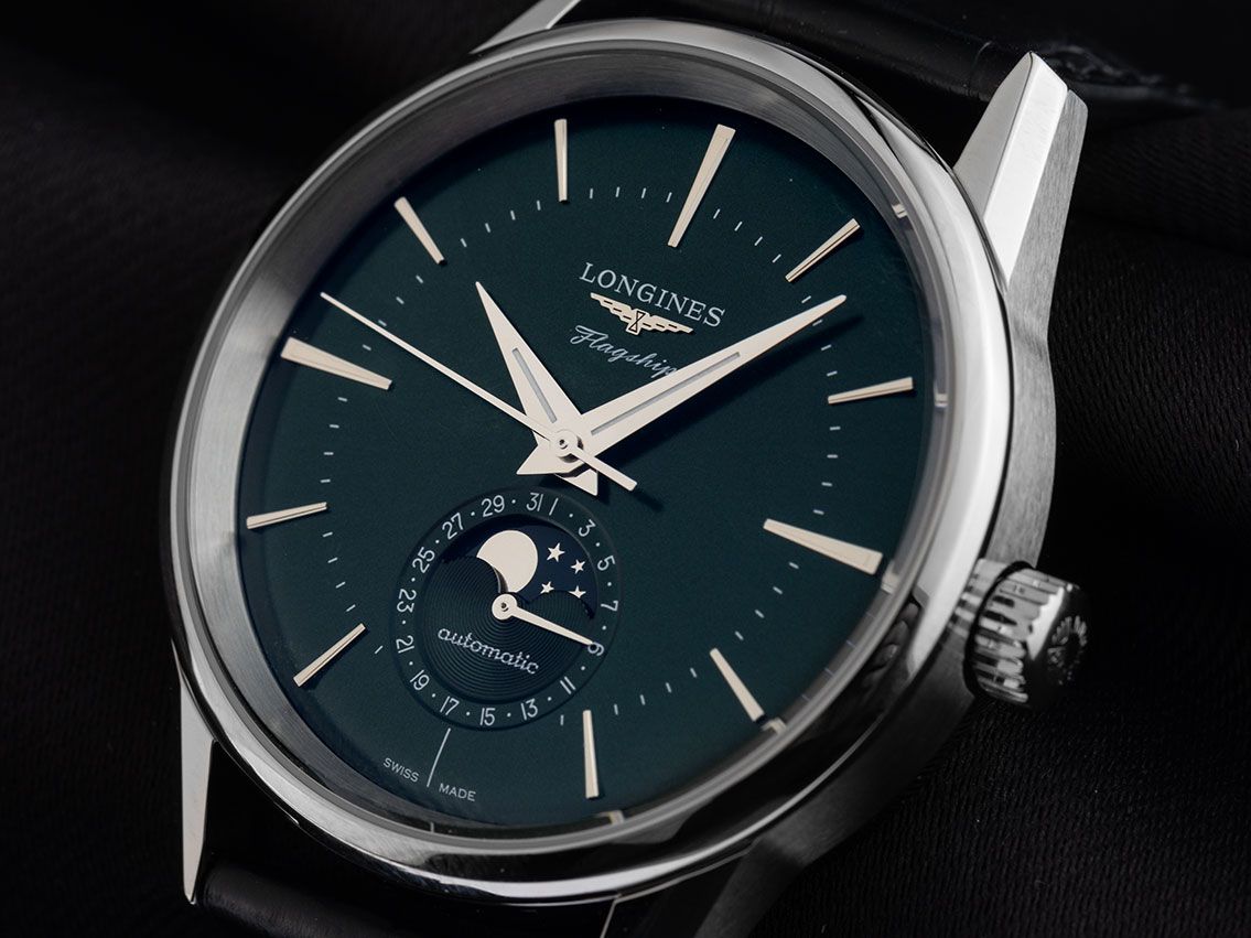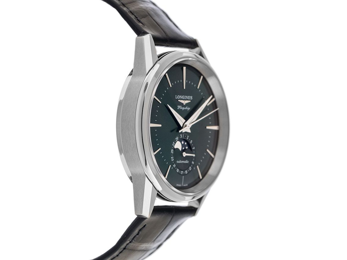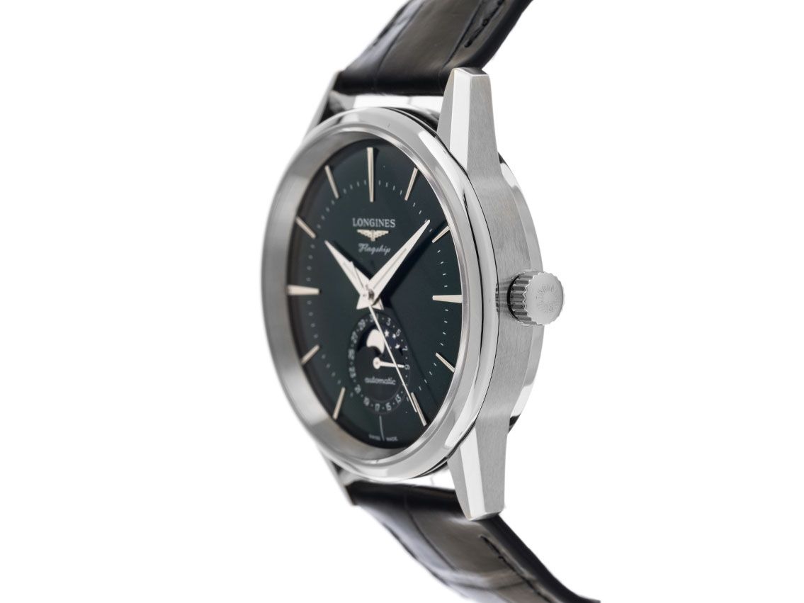 Flagship Heritage Mondphase Automatik Armband LederGehäuse Edelstahl poliert, Gehäusedurchmesser ohne Krone 38mm, Gehäusehöhe 11,8mm. Lünette Edelstahl glatt und poliert. Armband Leder schwarz mit Ziernaht, Anstoßbreite 19mm, Stiftschließe Edelstahl mit Hersteller-Logo. Zifferblatt grün mit aufgesetzten gelbgoldenen Indexen und gelbgoldenen Zeigern. Uhrwerk Automatik, Kaliber Longines L899, Gangreserve ca. 72 Stunden, Anzeige von Stunde, Minute und Sekunde über Zeiger aus der Mitte, Datumsanzeige mit Schnellverstellung über Zeiger bei 6 Uhr, Mondphaseanzeige bei 6 Uhr. Saphirglas kratzfest. Krone geriffelt mit Hersteller-Logo. Boden Edelstahl verschraubt und graviert. Gewicht der Uhr inklusive Armband 73g. Ref:L4.815.4.02.2, ID: ST610240801125RE-3400, Artikelnummer: 10000083501. Original Longines Box mit Umkarton und Garantie Papiere von 2025 sowie Beschreibung, Full Set. Ungetragen. Lieferzeit sofort.