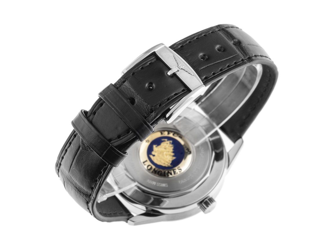 Caixa em aço inoxidável polido, diâmetro da caixa sem coroa 38mm, altura da caixa 11,8mm. Bezel em aço inoxidável liso e polido. Pulseira de couro preto com costura decorativa, largura da alça 19mm, fecho de pino em aço inoxidável com logotipo do fabricante. Mostrador verde com índices em ouro amarelo aplicados e ponteiros em ouro amarelo. Movimento automático, calibre Longines L899, reserva de marcha de aproximadamente 72 horas, indicação de horas, minutos e segundos através de ponteiros centrais, exibição da data com ajuste rápido através de ponteiro às 6 horas, indicação da fase da lua às 6 horas. Vidro de safira resistente a riscos. Coroa estriada com logotipo do fabricante. Fundo em aço inoxidável rosqueado e gravado. Peso do relógio incluindo a pulseira 73g. Ref: L4.815.4.02.2, ID: ST610240801125RE-3400, número do artigo: 10000083501. Caixa original Longines com embalagem externa e documentos de garantia de 2025, além de descrição, conjunto completo. Nunca usado. Prazo de entrega imediato.