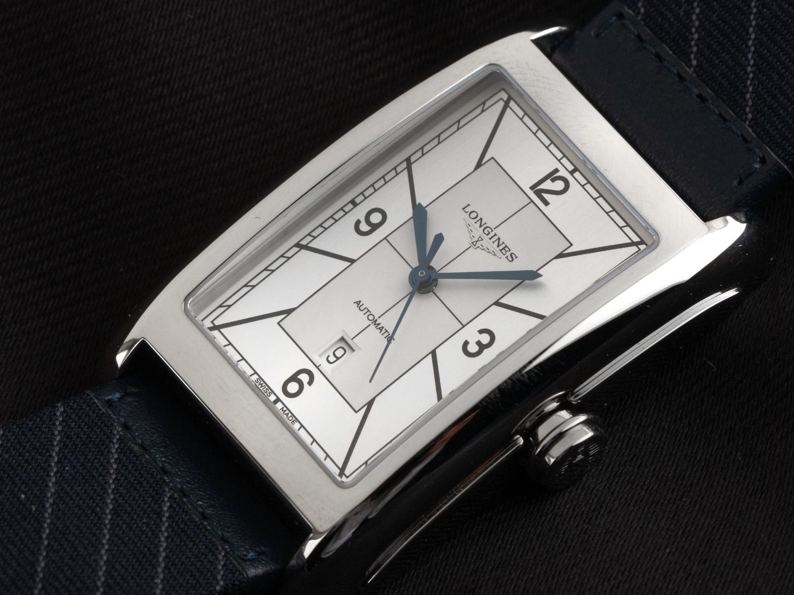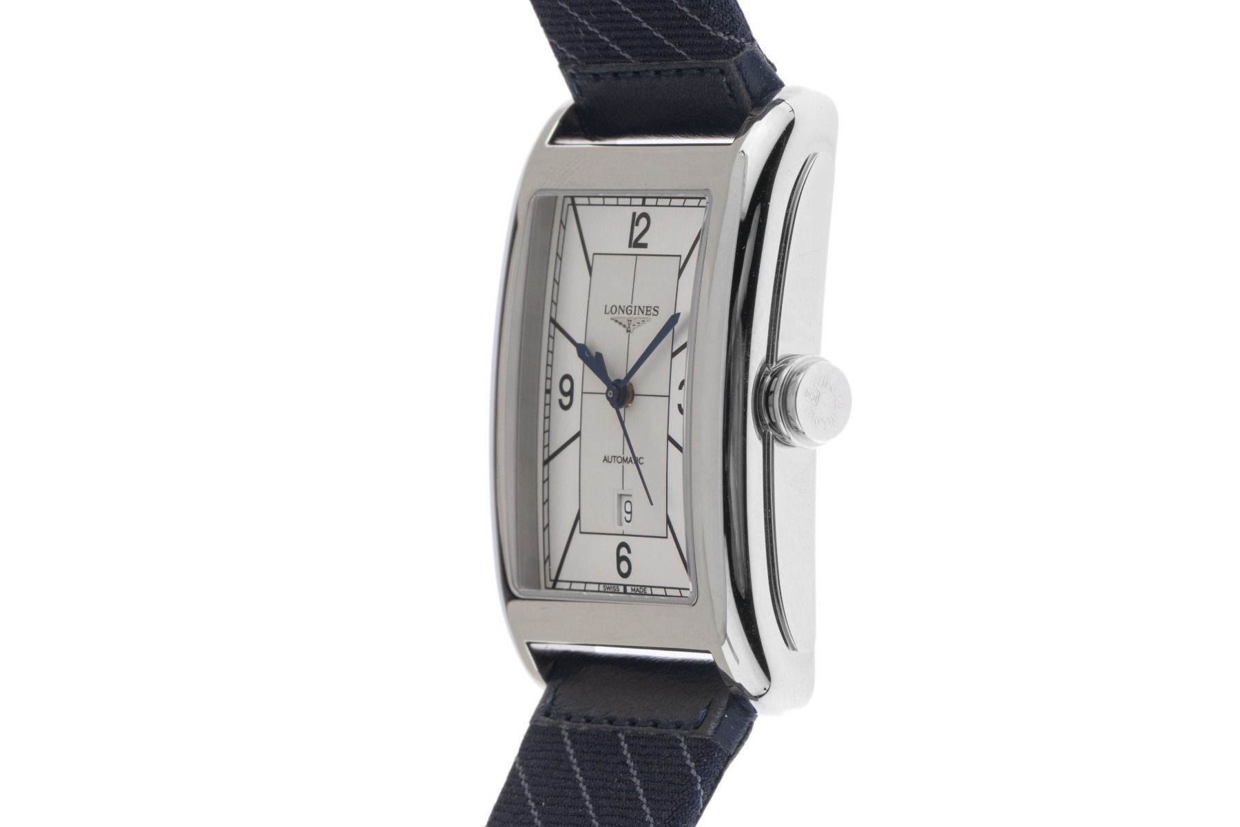 Longines Dolcevita Stahl Automatik Armband TextilGehäuse Edelstahl poliert, rechteckig, Gehäusemaße ohne Krone (L x B x H) 43,8 x 27,7 x 10,1mm. Lünette Edelstahl glatt und poliert. Armband Textil blau mit Streifen, Schnellwechselfunktion, Anstoßbreite 19mm, Stiftschließe Edelstahl mit Hersteller-Logo. Zifferblatt silberfarben mit schwarzen arabischen Ziffern, schwarzen Indexen und gebläuten Zeigern. Uhrwerk Automatik, Longines Kaliber L592. Anzeige von Stunde, Minute und Sekunde über Zeiger aus der Mitte mit Sekundenstopp zur sekundengenauen Einstellung der Uhrzeit, Datumsanzeige mit Schnellverstellung bei 6 Uhr. Saphirglas kratzfest. Krone mit Hersteller-Logo. Boden Edelstahl graviert. Gewicht der Uhr inklusive Armband 60g. Wasserdicht bis 3 ATM. Referenznummer: L5.757.4.73.8, ID: ST610229401125RE-2450, Artikelnummer: 10000083508. Original Longines Box mit Umkarton und Garantie Papiere von 2025 sowie 2 Wechselbänder, Full Set. Ungetragen. Lieferzeit sofort.