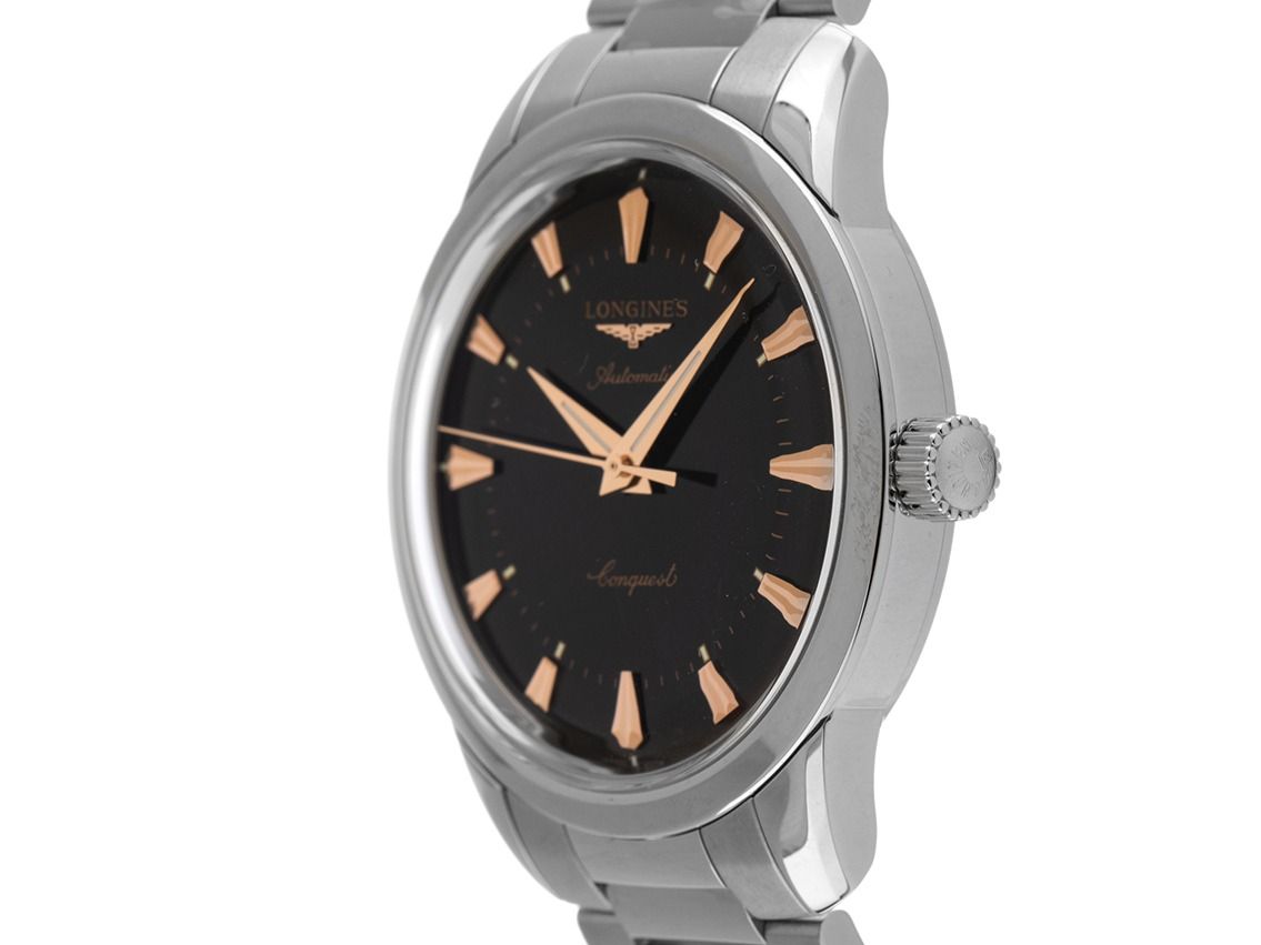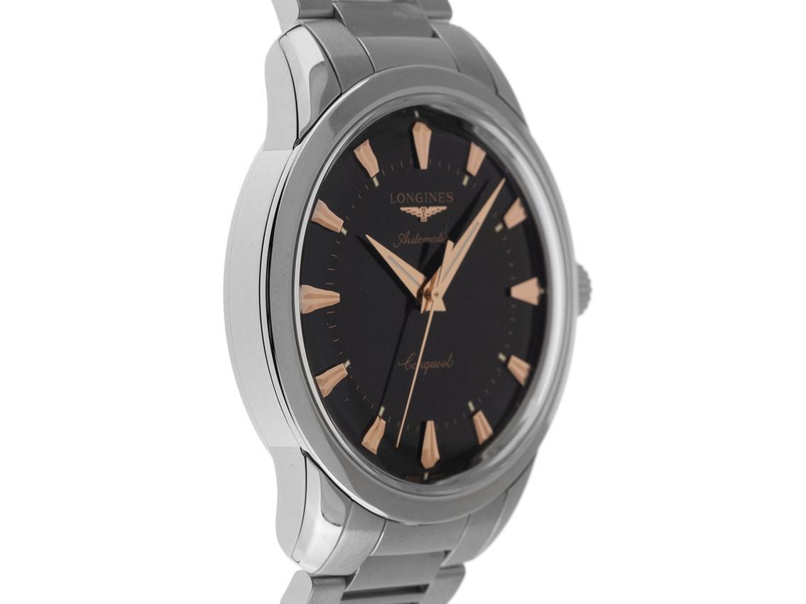 Longines Conquest Heritage Automatik Armband StahlGehäuse Edelstahl poliert, Gehäusedurchmesser ohne Krone 40mm, Gehäusehöhe 11,5mm. Lünette Edelstahl glatt und poliert. Armband Edelstahl poliert und satiniert, Sicherheitsfaltschließe Edelstahl mit Hersteller-Logo. Zifferblatt schwarz lackiert mit aufgesetzten roségoldenen Indexen und roségoldenen Zeigern. Uhrwerk Automatik, Kaliber Longines L888, Gangreserve ca. 72 Stunden, Anzeige von Stunde, Minute und Sekunde über Zeiger aus der Mitte. Saphirglas kratzfest. Krone geriffelt mit Hersteller-Logo. Boden Edelstahl verschraubt und graviert. Gewicht der Uhr inklusive Armband 131g, Länge des Armbandes inklusive Gehäuse 210mm. Referenznummer: L1.650.4.52.6, ID: ST610239601125RE-3300, Artikelnummer: 10000083523. Original Longines Box mit Umkarton und Garantie Papiere von 2025 sowie Beschreibung, Full Set. Ungetragen. Lieferzeit sofort.