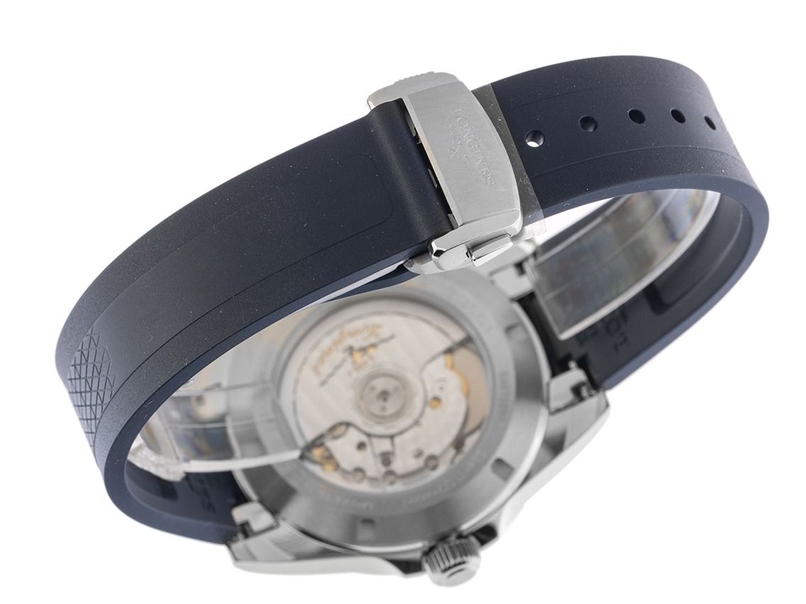 Caixa em aço polido, diâmetro da caixa sem coroa 38mm, altura da caixa 10,9mm. Bezel em aço liso e polido. Pulseira de borracha azul, fecho dobrável de segurança em aço com logotipo do fabricante. Mostrador azul com acabamento sol, índices em aço aplicados e ponteiros luminosos em aço. Movimento automático, calibre Longines L888 com 21 pedras preciosas, reserva de marcha de aproximadamente 72 horas. Exibição de horas, minutos e segundos através de ponteiros centrais com parada de segundos para ajuste preciso da hora, exibição de data com ajuste rápido às 6 horas. Vidro de safira resistente a riscos. Coroa rosqueada com logotipo do fabricante. Fundo em aço rosqueado e gravado com janela de vidro de safira. Peso do relógio incluindo a pulseira 96g. Número de referência: L3.720.4.92.9, ID: ST610225801125H-2150, número do artigo: 10000083525. Caixa original Longines com embalagem e documentos de garantia de 2025, Full Set. Sem uso. Prazo de entrega imediato.