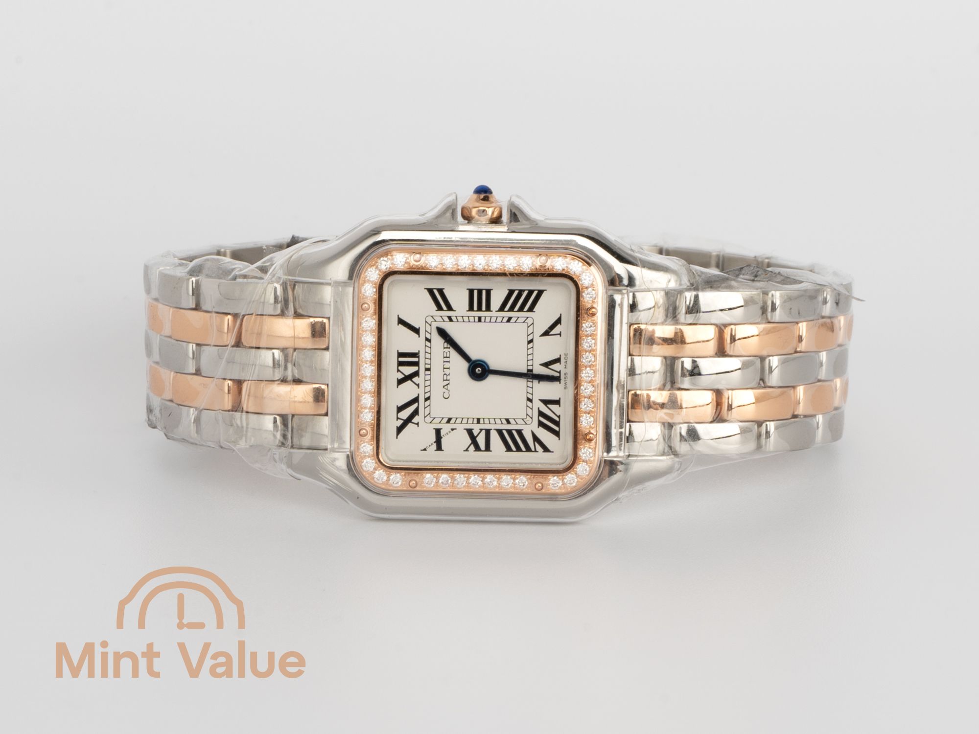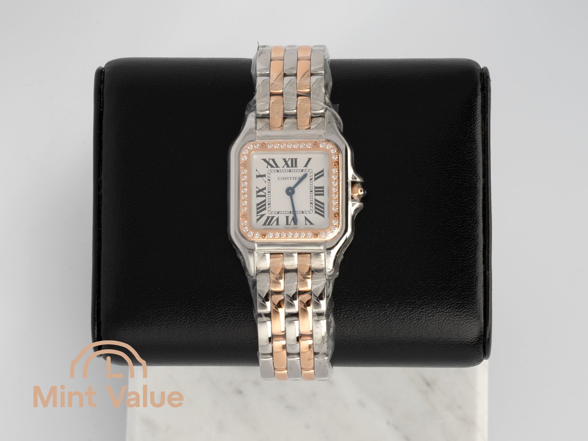 combines the Maison’s iconic design language — born in the 1980s — with contemporary luxury. Executed in 18ct rose gold and stainless steel, this medium-sized piece (approximately 29 × 37 mm, 6 mm thick) features a bezel set with brilliant-cut diamonds, a silvered dial with blued-steel sword-shaped hands, and the signature Panthère chain link bracelet.