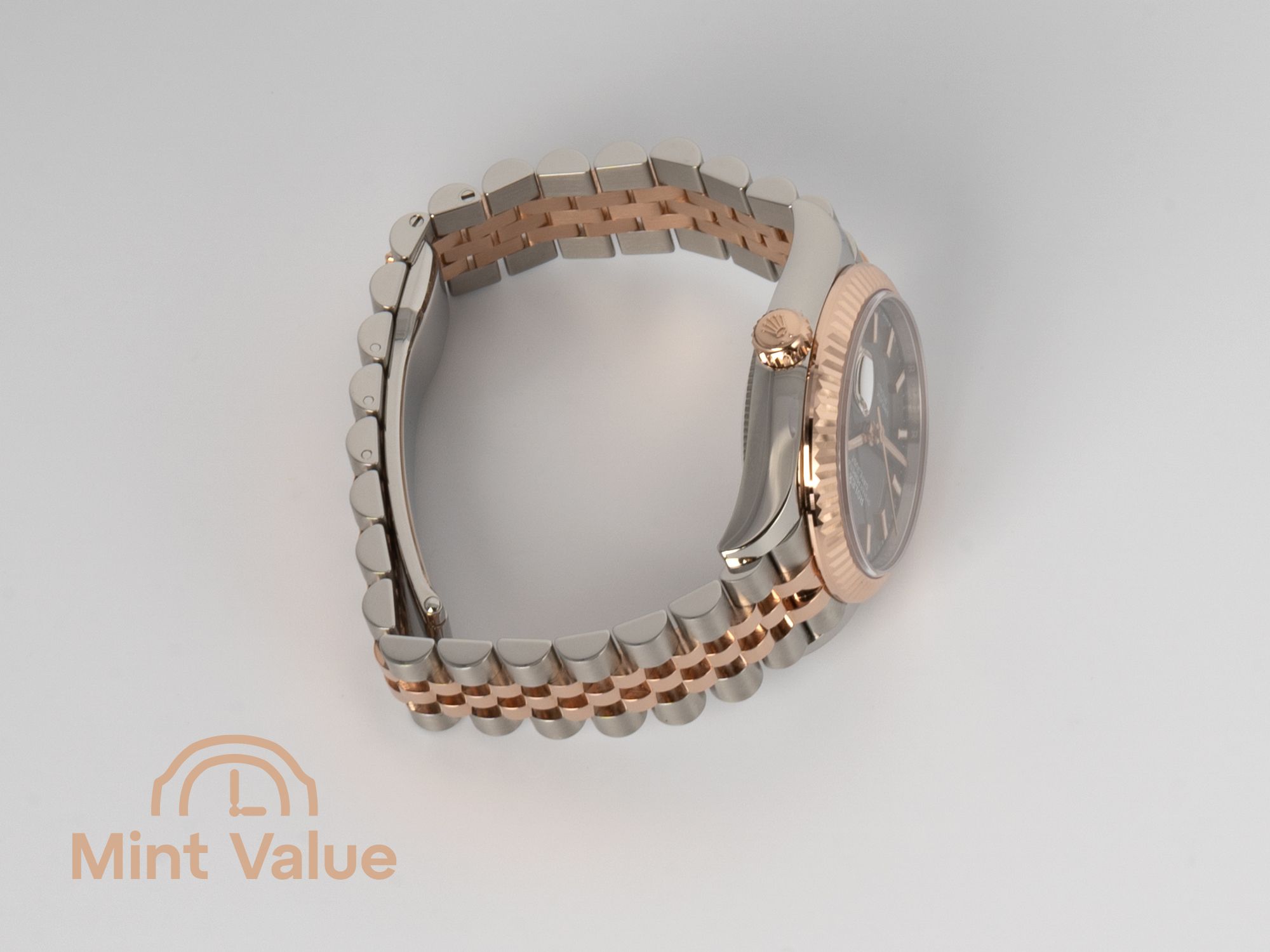 brings together Oystersteel and Everose gold in a balanced, contemporary expression of the classic Datejust silhouette. The slate-grey dial — one of the most refined hues in the collection — shifts subtly under the light, offering depth without embellishment. It's a watch that speaks quietly yet unmistakably.