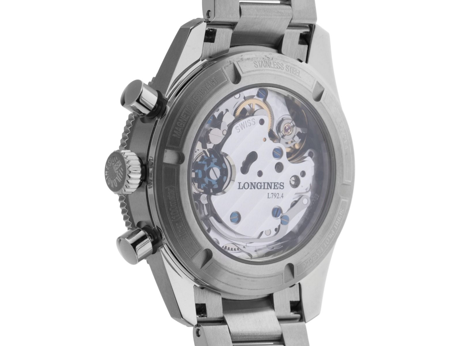 Caixa em aço polido e acetinado, diâmetro da caixa sem coroa 39,5mm, altura da caixa 13,6mm. Bezel em aço com inserto preto, divisão de 60 minutos, unidirecional. Pulseira em aço polido e acetinado, fecho de segurança dobrável em aço com logotipo do fabricante. Mostrador preto com números árabes aplicados e ponteiros luminosos. Movimento manual, cronógrafo flyback, calibre Longines L792 com 23 pedras preciosas, reserva de marcha de aproximadamente 68 horas. Exibição de horas e minutos através de ponteiros centrais, pequeno segundo com parada de segundos para ajuste preciso da hora às 9 horas. Vidro de safira resistente a riscos e curvado. Coroa rosqueada com logotipo do fabricante. Fundo em aço rosqueado e gravado com janela de vidro de safira. Peso do relógio incluindo a pulseira 155g, comprimento da pulseira incluindo a caixa 200mm. À prova d'água até 10 ATM. Número de referência: L3.721.4.53.6, ID: ST610264201225H-5350, número do artigo: 10000083535. Caixa original Longines com embalagem externa e documentos de garantia de 2025, Full Set. Sem uso. Prazo de entrega imediato.