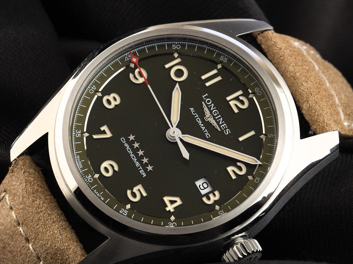 Longines Spirit Stahl Automatik Armband LederGehäuse Edelstahl poliert und satiniert, Gehäusedurchmesser ohne Krone 42mm, Gehäusehöhe 12,2mm. Lünette Edelstahl poliert und satiniert. Armband Leder braun mit heller Ziernaht, Anstoßbreite 22mm, Stiftschließe Edelstahl mit Hersteller-Logo. Zifferblatt grün mit aufgesetzten arabischen Leuchtziffern und weißen Leuchtzeigern. Uhrwerk Automatik, Kaliber L888.4, Gangreserve ca. 72 Stunden. Anzeige von Stunde, Minute und Sekunde über Zeiger aus der Mitte, Datumsanzeige mit Schnellverstellung bei 3 Uhr. Saphirglas kratzfest. Krone verschraubbar mit Hersteller-Logo. Boden Edelstahl 6-fach verschraubt und graviert. Gewicht der Uhr inklusive Armband 92g. Wasserdicht bis 10 ATM. Referenznummer: L3.811.4.03.2, ID: ST610230601125H-2250, Artikelnummer: 10000083538. Original Longines Box mit Umkarton und Garantie Papiere von 2025, Full Set. Ungetragen. Lieferzeit sofort.