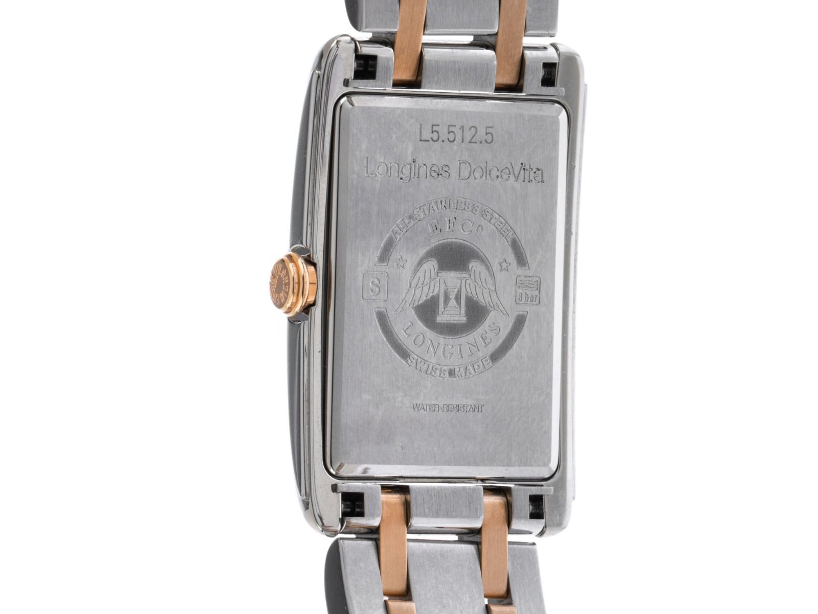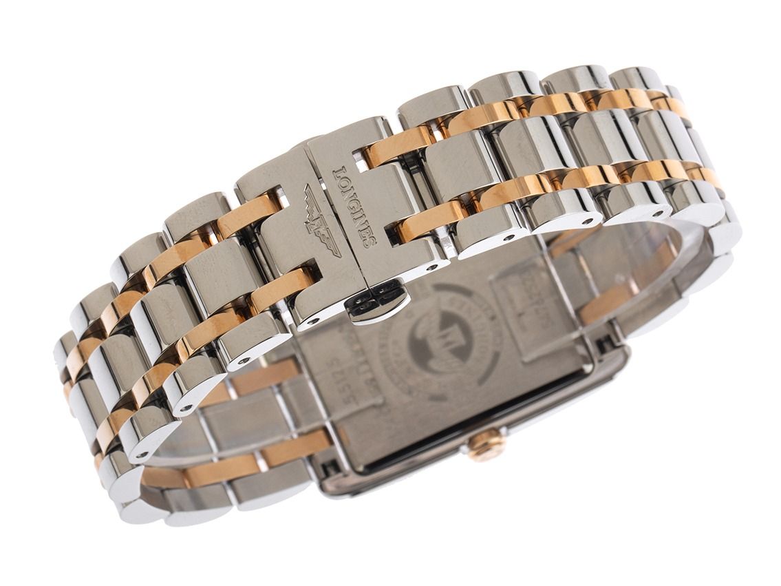 Caixa em aço inoxidável polido, retangular, medidas da caixa sem coroa (L x A x P) 36,7 x 23 x 7mm. Bezel em aço inoxidável liso e polido. Pulseira em aço inoxidável / rosé polido, fecho de segurança dobrável oculto em aço inoxidável com logotipo do fabricante. Mostrador branco com números romanos rosé e ponteiros rosé. Movimento a quartzo, Calibre Longines L176. Exibição de horas e minutos através de ponteiros centrais, pequeno segundo com parada de segundos para ajuste preciso da hora às 6 horas. Vidro de safira resistente a riscos. Coroa estriada. Fundo em aço inoxidável gravado. Peso do relógio incluindo a pulseira 87g, comprimento da pulseira incluindo a caixa 170mm. À prova d'água até 3 ATM. Número de referência: L5.512.5.75.7, ID: ST610227601125H-2300, número do artigo: 10000083539. Caixa original Longines com embalagem e documentos de garantia de 2025, Full Set. Sem uso. Prazo de entrega imediato.