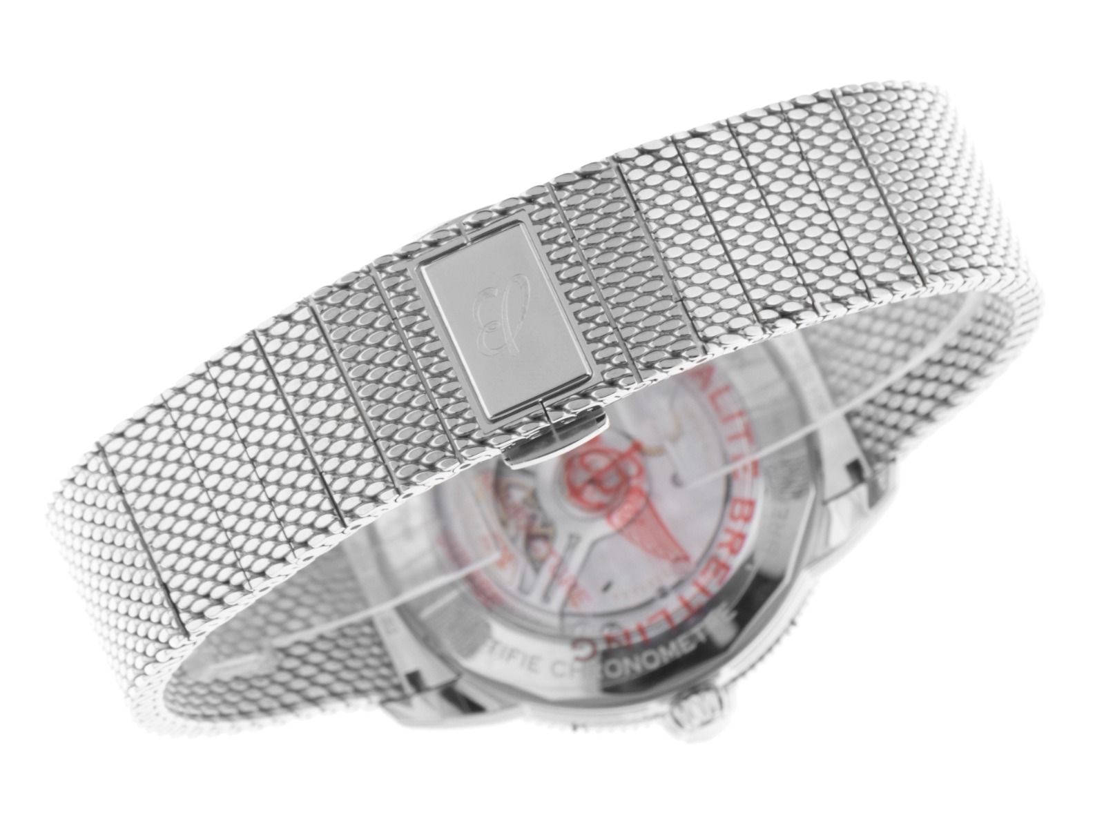 Caixa em aço inoxidável polido, diâmetro da caixa sem coroa 40mm, altura da caixa 12,0mm. Luneta em aço inoxidável com acabamento estriado e inserto de cerâmica preta, giratória de um lado com trava. Pulseira em aço inoxidável, fecho de segurança duplo em aço inoxidável com logotipo do fabricante. Mostrador preto com índices em aço inoxidável aplicados e ponteiros luminosos em aço inoxidável. Movimento automático, cronômetro com certificado, calibre de manufatura Breitling B31 com 26 pedras preciosas, reserva de marcha de aproximadamente 78 horas. Exibição de horas, minutos e segundos através de ponteiros centrais com parada de segundos para ajuste preciso da hora, exibição de data com ajuste rápido às 6 horas. Vidro de safira resistente a riscos, antirreflexo em ambos os lados e abobadado. Coroa rosqueada com logotipo do fabricante, 2 vedantes. Fundo em aço inoxidável rosqueado e gravado com janela de vidro de safira. Peso do relógio incluindo a pulseira 132g, comprimento da pulseira incluindo a caixa 200mm. À prova d'água até 20 ATM. Número de referência: AB3110241B1A1, ID: ST110688361125H-6400, número do artigo: 10000083577. Caixa original da Breitling com embalagem externa e documentos de garantia de 2025, conjunto completo. Sem uso. Prazo de entrega imediato.
