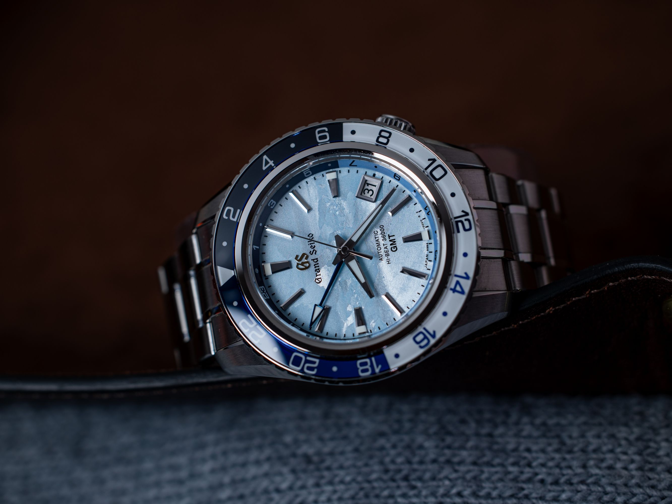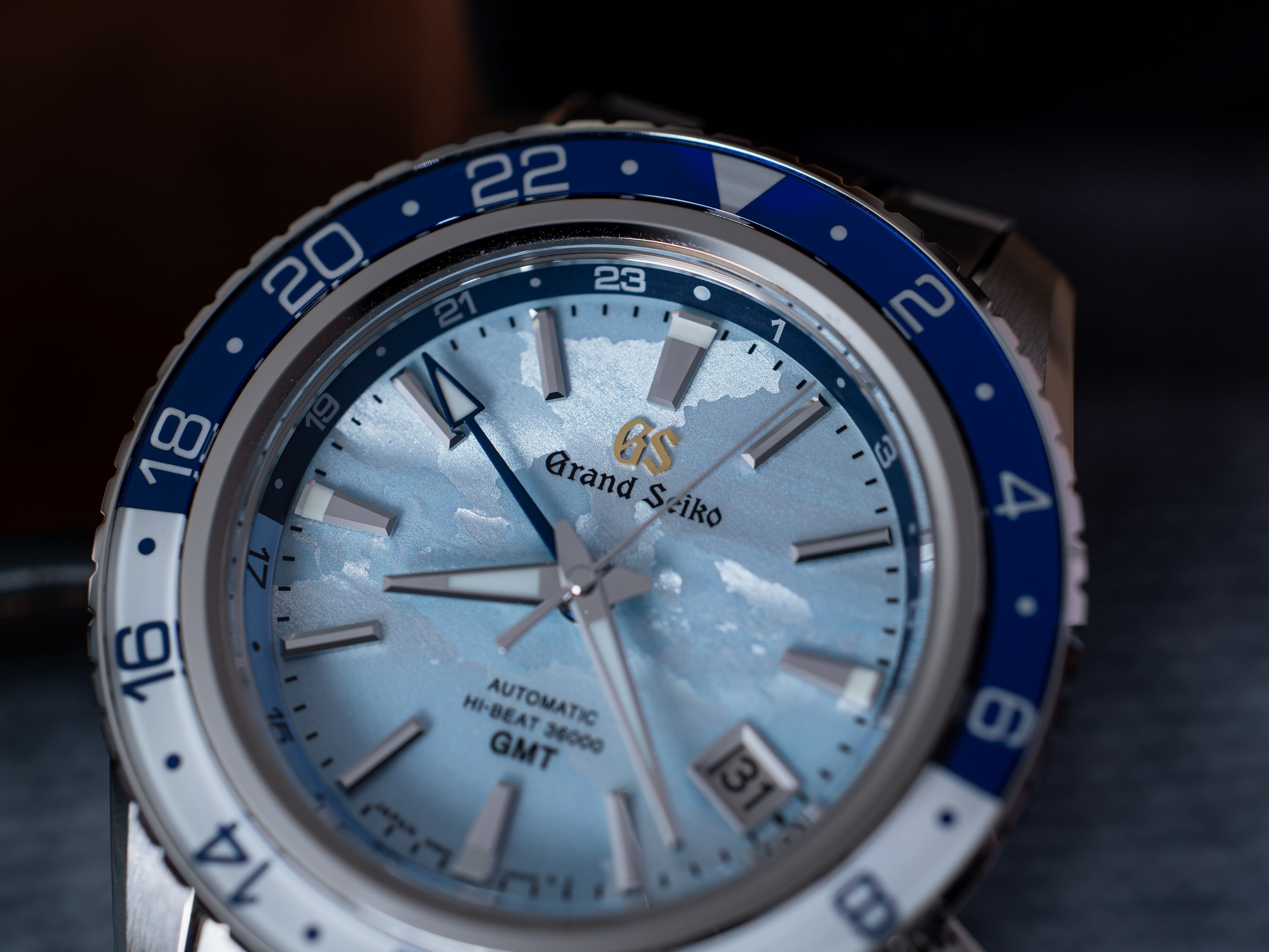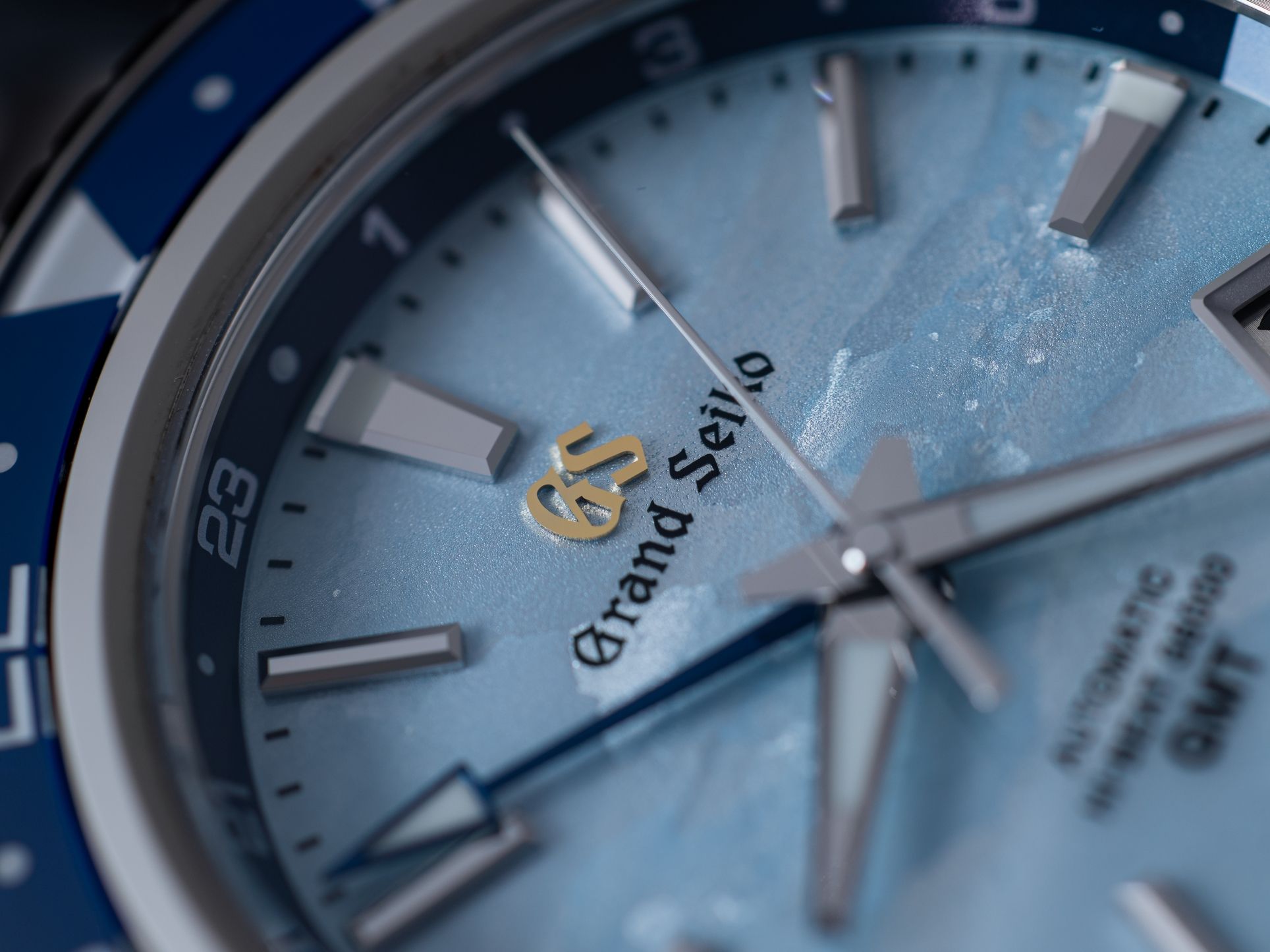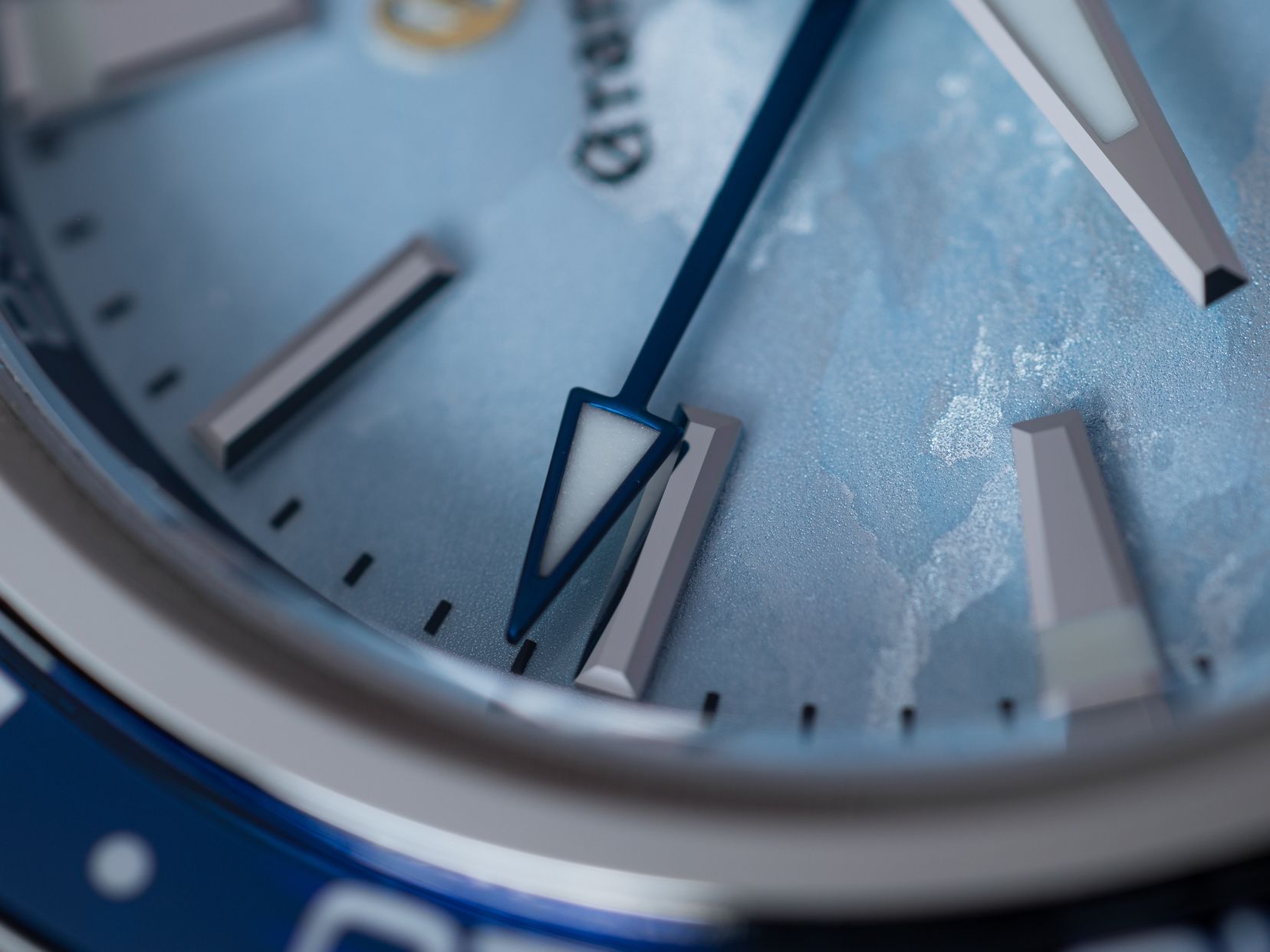 O mostrador apresenta uma textura gelada impressionante que ecoa os picos japoneses cobertos de neve. Sua profundidade e superfície cintilante criam um efeito tridimensional, tornando-o um dos mostradores Grand Seiko mais impressionantes e atmosféricos lançados nos últimos anos.