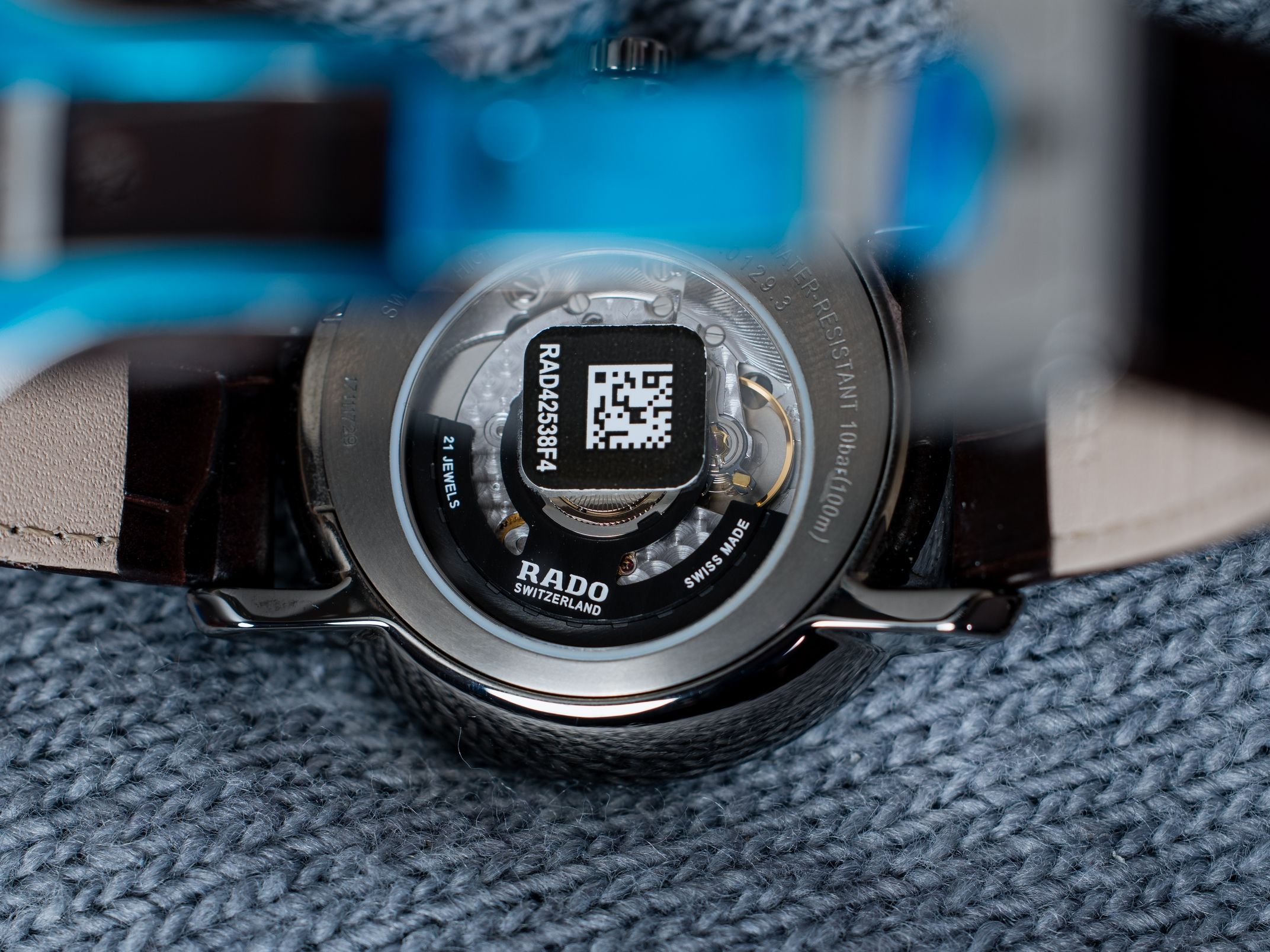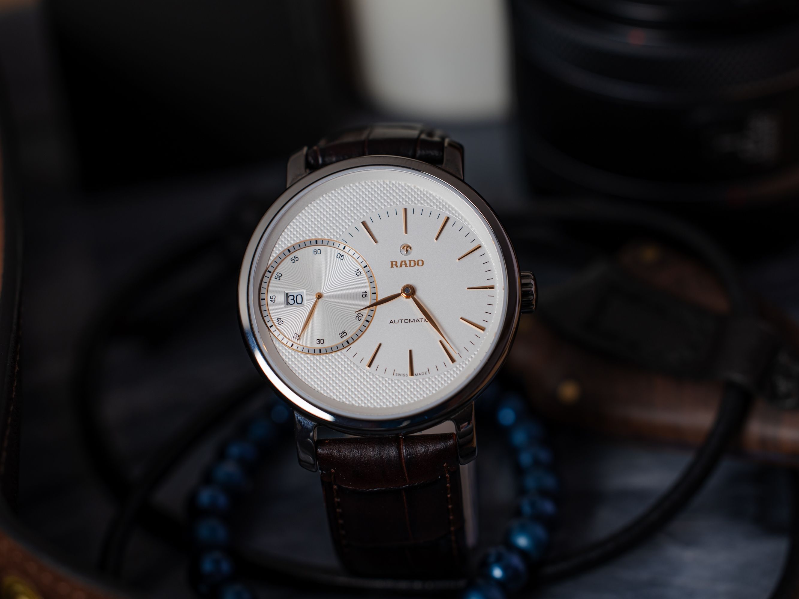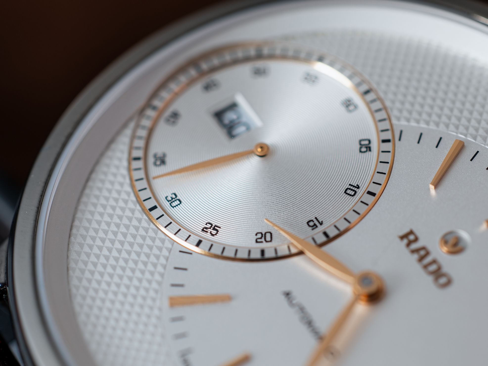 Um relógio de vestir completamente novo e elegante da linha DiaMaster da Rado. O mostrador apresenta um lindo acabamento sunburst que, combinado com os ponteiros em tom de ouro, cria um visual excepcionalmente refinado e luxuoso.