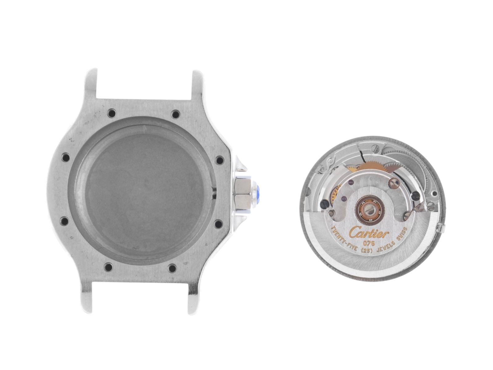 Caixa em aço inoxidável acetinado, diâmetro da caixa sem coroa 25mm, altura da caixa 8,7mm. Luneta em aço inoxidável, 8 vezes parafusada e polida. Bracelete em aço inoxidável acetinado, fecho duplo oculto em aço inoxidável. Mostrador branco com números romanos pretos e ponteiros azulados. Movimento automático, calibre 076 com 25 pedras preciosas. Exibição de horas, minutos e segundos através de ponteiros centrais com parada de segundos para ajuste preciso do horário. Vidro de safira resistente a riscos. Coroa com cabochão de espinela. Fundo em aço inoxidável, 4 vezes parafusado e gravado. Peso do relógio incluindo o bracelete 58g, comprimento do bracelete incluindo a caixa 170mm. Número de referência: 187903, número da caixa: 18XXX, ano de fabricação: 1992, ID: P112630000725H-4100, número do artigo: 10000081107. Com controle de precisão e completa restauração externa em agosto de 2025. Bolsa de veludo original da Cartier e descrição. Super oferta, investimento com potencial de valorização, peça de colecionador muito rara. Em muito bom estado. Prazo de entrega imediato.