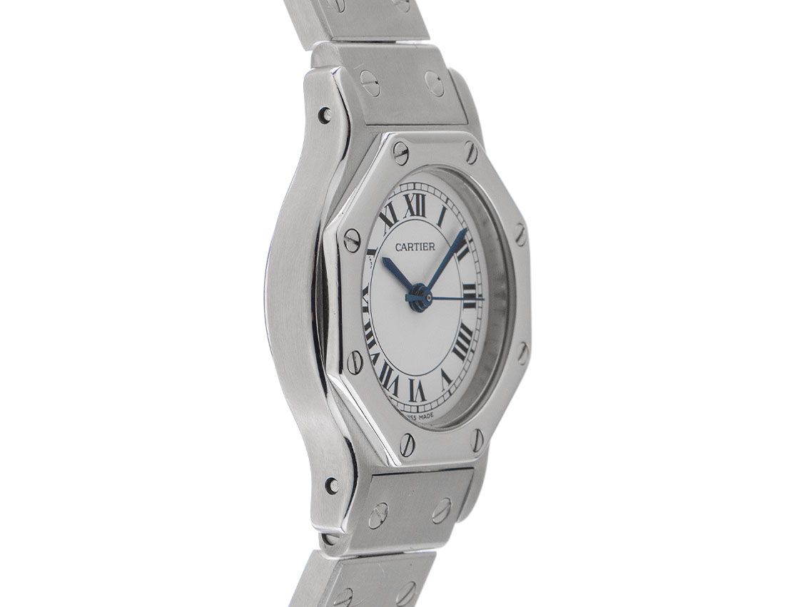 Cartier Santos Octagon PM kleines Modell Stahl Automatik Armband StahlGehäuse Edelstahl satiniert, Gehäusedurchmesser ohne Krone 25mm, Gehäusehöhe 8,7mm. Lünette Edelstahl 8-fach verschraubt und poliert. Armband Edelstahl satiniert, verdeckte Doppelfaltschließe Edelstahl. Zifferblatt weiß mit schwarzen römischen Ziffern und gebläuten Zeigern. Uhrwerk Automatik, Kaliber 076 mit 25 Edelsteinen. Anzeige von Stunde, Minute und Sekunde über Zeiger aus der Mitte mit Sekundenstopp zur sekundengenauen Einstellung der Uhrzeit. Saphirglas kratzfest. Krone mit Spinell Cabochon. Boden Edelstahl 4-fach verschraubt und graviert. Gewicht der Uhr inklusive Armband 58g, Länge des Armbandes inklusive Gehäuse 170mm. Referenznummer: 187903, Gehäusenummer: 18XXX, Baujahr: 1992, ID: P112630000725H-4100, Artikelnummer: 10000081107. Mit Gangkontrolle und kompletter äußerlicher Aufarbeitung von August 2025. Original Cartier Samttasche und Beschreibung. Superschnäppchen, Kapitalanlage mit Wertsteigerungspotential, sehr seltenes Sammlerstück. Sehr guter Zustand. Lieferzeit sofort.