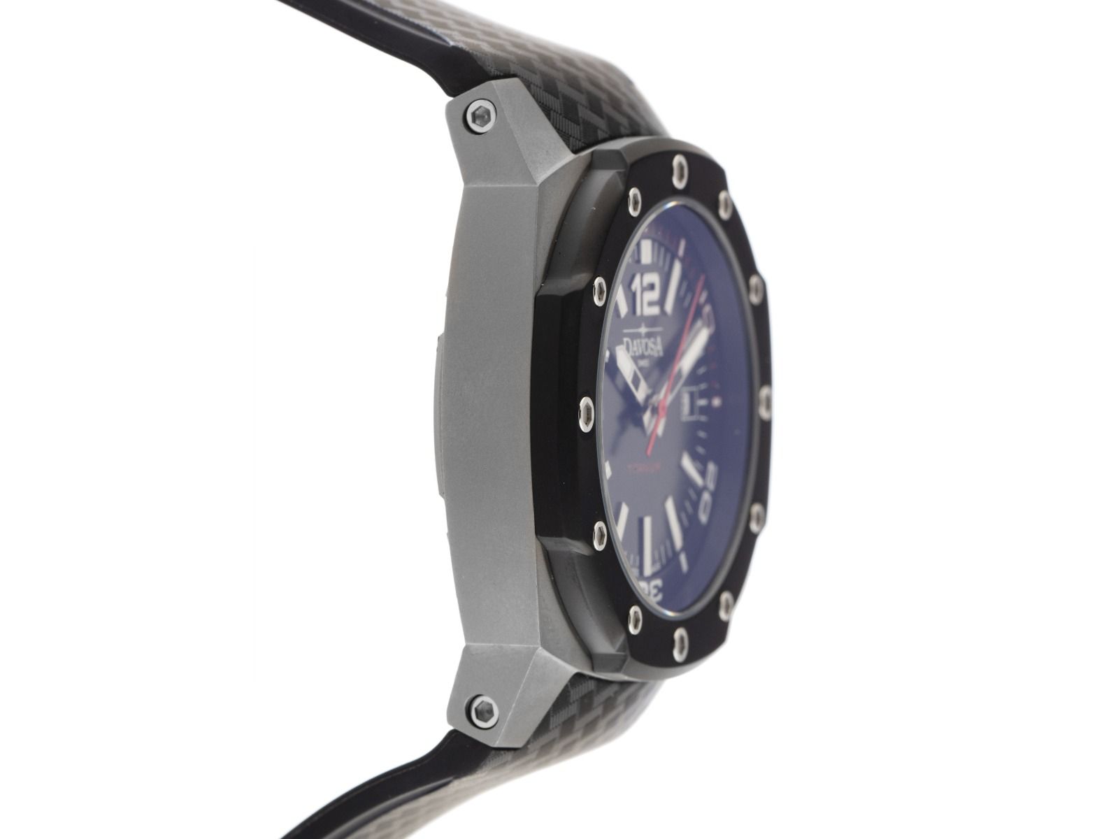 Caixa em titânio acetinado, medidas da caixa sem coroa (C x L x A) 55 x 49 x 13,8mm. Bezel em titânio octogonal e 12 vezes parafusado. Pulseira de borracha preta, largura de encaixe 32mm, fecho de pino duplo em titânio. Mostrador preto com índices aplicados, números árabes 12 e 6 e ponteiros polidos. Movimento automático, calibre Davosa DAV 3021. Exibição de horas, minutos e segundos através de ponteiros centrais com parada de segundos para ajuste preciso da hora, exibição de data com ajuste rápido às 3 horas. Vidro de safira. Coroa rosqueada com proteção lateral e logotipo do fabricante. Fundo em titânio, 8 vezes parafusado e gravado com janela de visualização. Peso do relógio incluindo a pulseira 121g. Número de referência: 16150355, ID: P20158001125H-3100, número do artigo: 10000083451. Caixa original Davosa e documentos de garantia de dezembro de 2024, pulseira de couro intercambiável, ferramenta para troca de pulseira, pano de polimento, descrição e extrato do Watchregister de novembro de 2025, Certificado do Watch Register / sem registro (Banco de dados internacional para relógios perdidos ou roubados), Full Set. Super oferta. Sem uso, vintage. Prazo de entrega imediato.