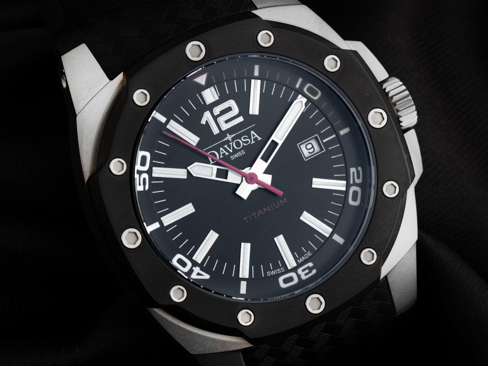 Davosa Titanium Titan Automatik Armband KautschukGehäuse Titan satiniert, Gehäusemaße ohne Krone (L x B x H) 55 x 49 x 13,8mm. Lünette Titan achteckig und 12-fach verschraubt. Armband Kautschuk schwarz, Anstoßbreite 32mm, Doppelstiftschließe Titan. Zifferblatt schwarz mit aufgesetzten Indexen, arabischer Ziffer 12 und 6 und polierten Zeigern. Uhrwerk Automatik, Kaliber Davosa DAV 3021. Anzeige von Stunde, Minute und Sekunde über Zeiger aus der Mitte mit Sekundenstopp zur sekundengenauen Einstellung der Uhrzeit, Datumsanzeige mit Schnellverstellung bei 3 Uhr. Saphirglas. Krone verschraubbar mit Flankenschutz und Hersteller-Logo. Boden Titan 8-fach verschraubt und graviert mit Sichtfenster. Gewicht der Uhr inklusive Armband 121g. Referenznummer: 16150355, ID: P20158001125H-3100, Artikelnummer: 10000083451. Original Davosa Box und Garantie Papiere von Dezember 2024, Leder Wechselband, Bandwechselwerkzeug, Poliertuch, Beschreibung sowie Watchregister Auszug von November 2025, The Watch Register Zertifikat / ohne Eintrag (Internationale Datenbank für verlorene oder gestohlene Uhren), Full Set. Superschnäppchen. Ungetragen Vintage. Lieferzeit sofort.