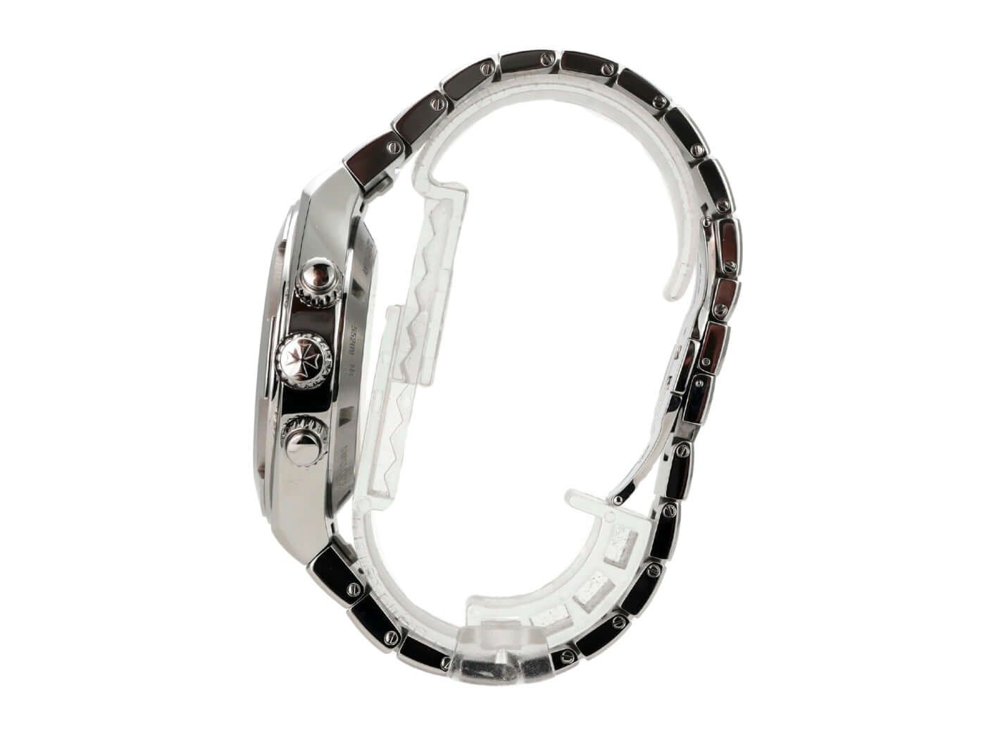 Caixa feita de aço inoxidável polido e acetinado, diâmetro da caixa 42,5 mm, altura da caixa 12,67 mm, bezel polido e acetinado em aço inoxidável, bracelete polido e acetinado em aço inoxidável com fecho dobrável, pulseiras adicionais incluídas, mostrador prateado com índices luminosos aplicados, submostradores pretos, movimento automático, calibre de fabricação 5200 com 54 rubis, frequência 28.800 A/h, reserva de marcha de aproximadamente 60 horas, display de data, cronógrafo, selo de Genebra, cristal de safira resistente a riscos, fundo de caixa rosqueado, resistente à água até 15 bar.