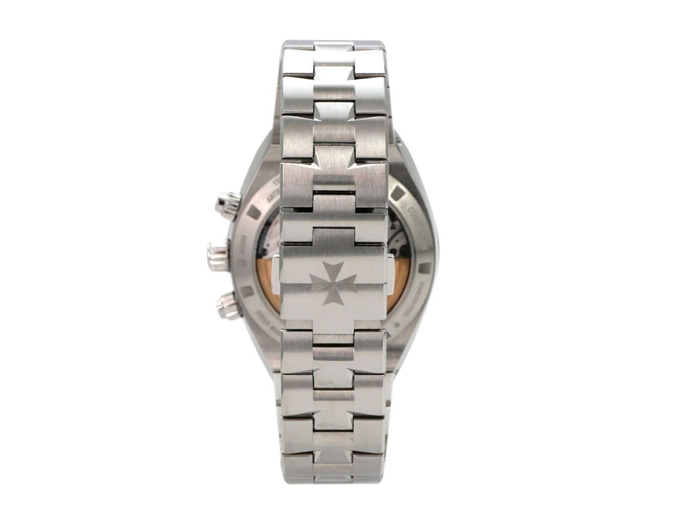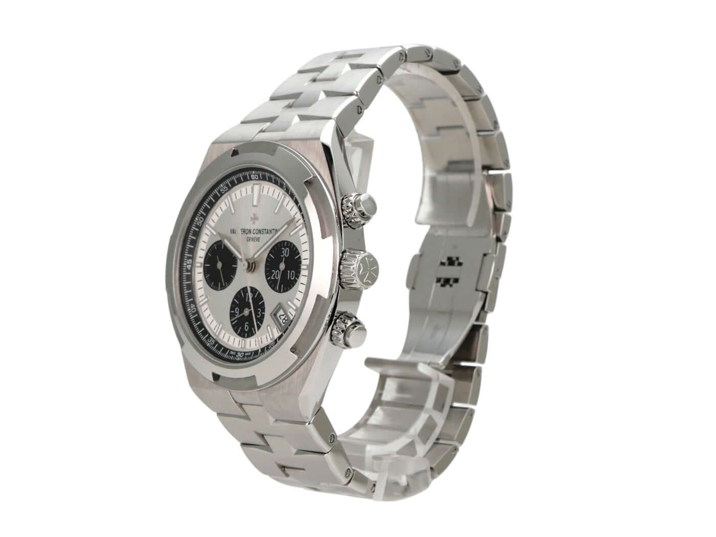 Vacheron Constantin Overseas Chronograph Ref. 5520V/210A-B686Case made of polished and satin-finished stainless steel, case diameter 42.5 mm, case height 12.67 mm, polished and satin-finished stainless steel bezel, polished and satin-finished stainless steel bracelet with folding clasp, additional straps included, silver-colored dial with applied luminous indices, black subdials, automatic movement, manufacture caliber 5200 with 54 jewels, frequency 28,800 A/h, power reserve approx. 60 hours, date display, chronograph, Geneva seal, scratch-resistant sapphire crystal, screwed display back, water-resistant up to 15 bar.