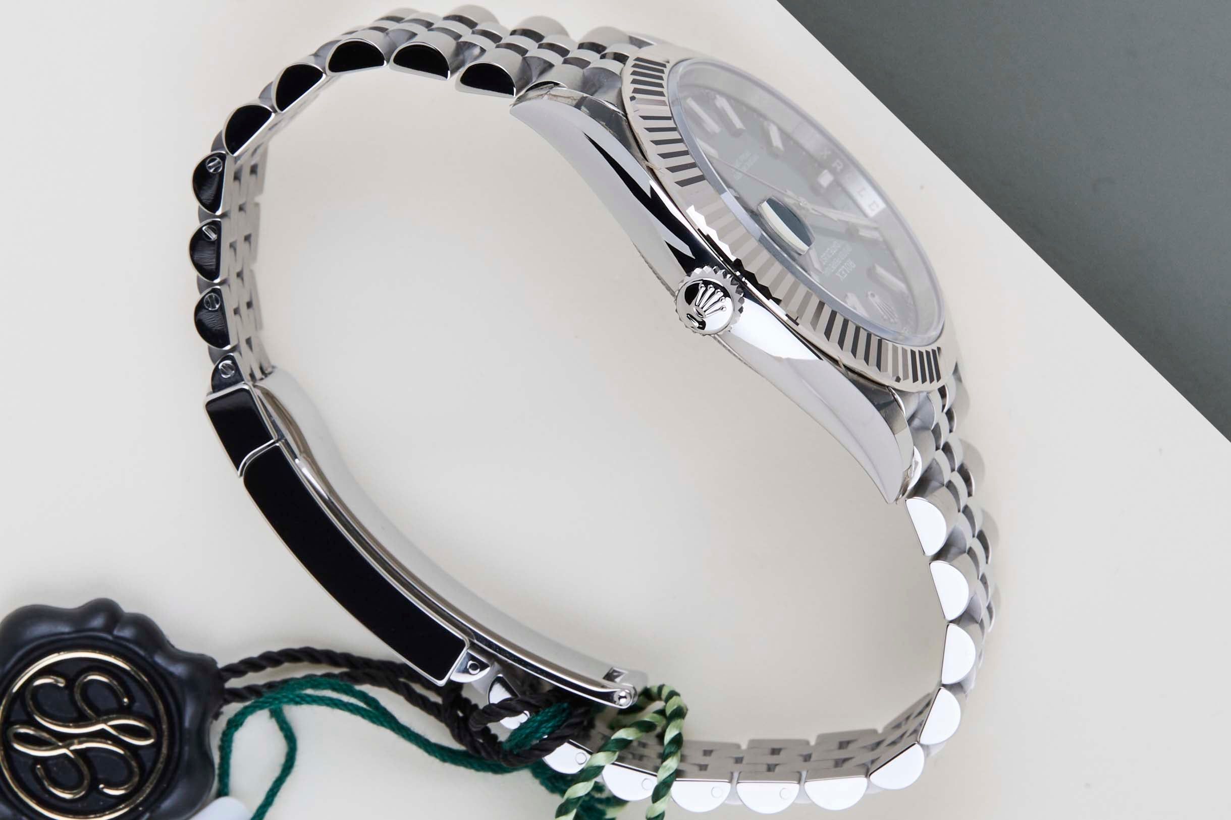 New & Unworn | Full Set | International Rolex warranty until August 2030 | Including Original Rolex White TagRolex introduced the original Datejust in 1945 to celebrate the company's 40th anniversary. Due to the various case sizes and materials, the Datejust has beeningrained in Rolex's history and remains incredibly popular for 75 years.This Rolex Datejust 41 'Mint Green Dial - Jubilee' was sold for the first time in August 2025.This Datejust is made of a combination of 18k White Gold and stainless steel and is fitted with a Jubilee bracelet, which is equipped with the Easylink. This extension, allows the wearer to either extend or shorten the bracelet by 5 millimeters, improving the wearability and usability of the watch.This Rolex Datejust 41 is in New & Unworn condition and comes with the original Rolex Warranty Card and box. Furthermore, the watch still has Worldwide Rolex Warranty until August 2030.
