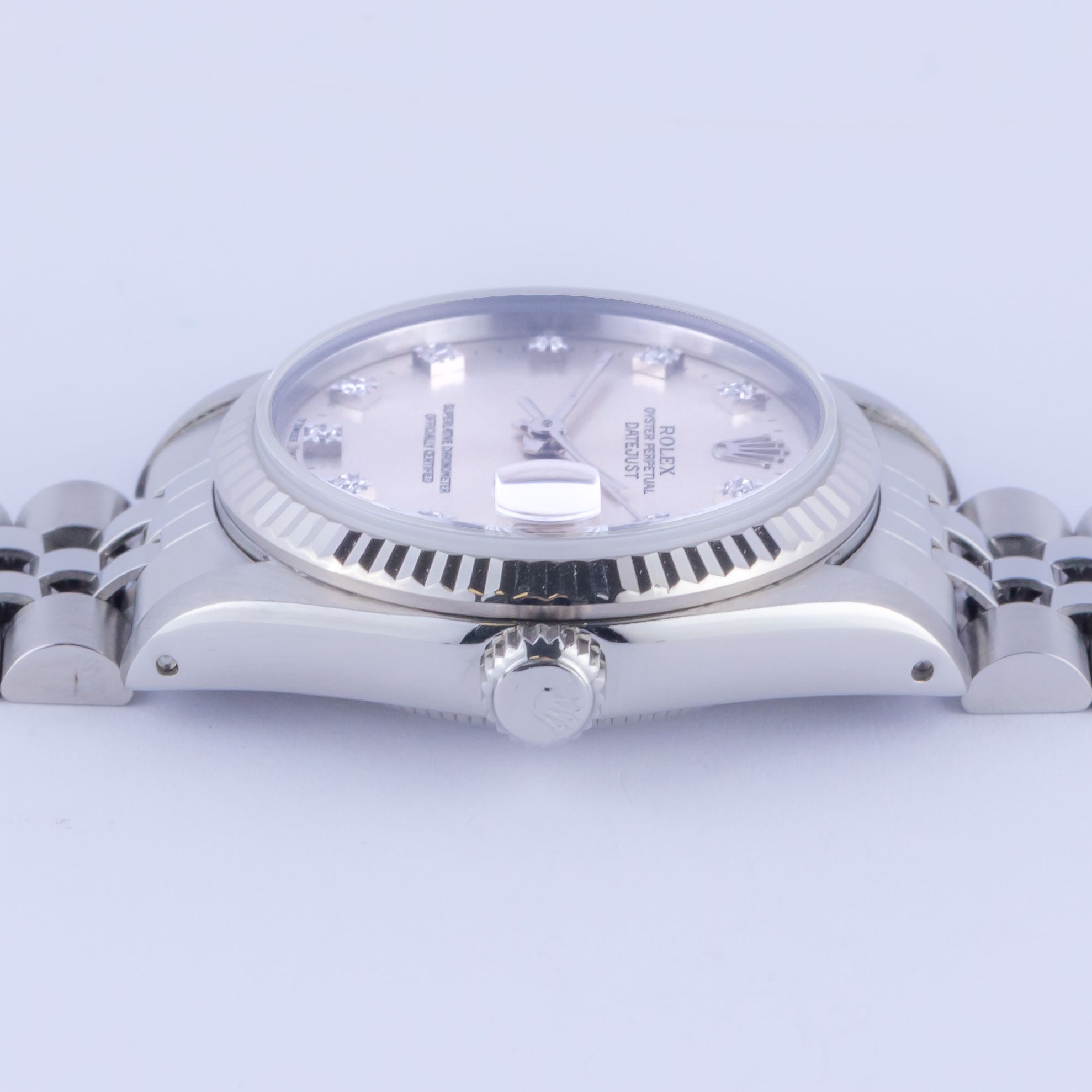 Rolex Oyster Perpetual Datejust Mid-Size referência 68274 de 1989, incluindo conjunto completo. O Datejust 68274 possui uma caixa de aço inoxidável de 31mm, uma pulseira Jubilee de aço inoxidável e um bezel estriado em ouro branco 18k. Este Datejust 68274 conta com um movimento automático calibre 3135 com função de data rápida, um cristal de safira resistente a arranhões e um mostrador prateado com ponteiros de trítio e marcadores de diamante.