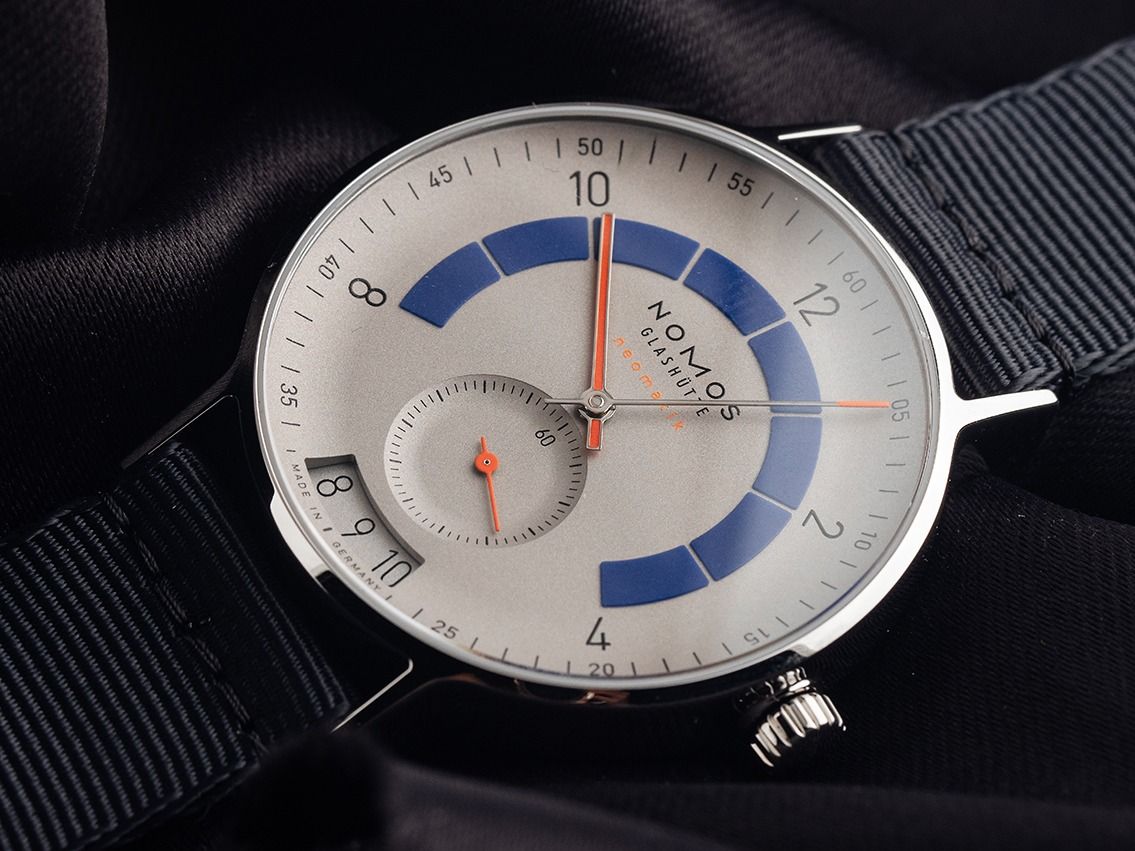 Gehäuse Edelstahl zweiteilig und poliert, Gehäusedurchmesser ohne Krone 41mm, Gehäusehöhe 10,5mm. Armband Textil blauschwarz, Anstoßbreite 20mm, Stiftschließe Edelstahl mit Hersteller-Logo. Zifferblatt grau mit blauem Leuchtring, schwarzen arabischen Ziffern und Edelstahl / neonorangenen Zeigern. Uhrwerk Automatik, Manufakturkaliber Nomos DUW6101 mit 27 Edelsteinen, Gangreserve ca. 42 Stunden. Anzeige von Stunde und Minute über Zeiger aus der Mitte, kleine Sekunde mit Sekundenstopp zur sekundengenauen Einstellung der Uhrzeit bei 6 Uhr, Panoramadatumsanzeige bei 6 Uhr. Saphirglas kratzfest, entspiegelt und gewölbt. Krone mit Hersteller-Logo. Boden Edelstahl verschraubt und graviert mit Saphirglas Sichtfenster. Gewicht der Uhr inklusive Armband 64g. Wasserdicht bis 10 ATM. Referenznummer: 1303, ID: ST116058521225H-4240, Artikelnummer: 10000083746. Original Nomos Box und Garantie Papiere von Dezember 2025, Full Set. Neu. Lieferzeit sofort.