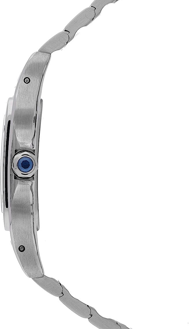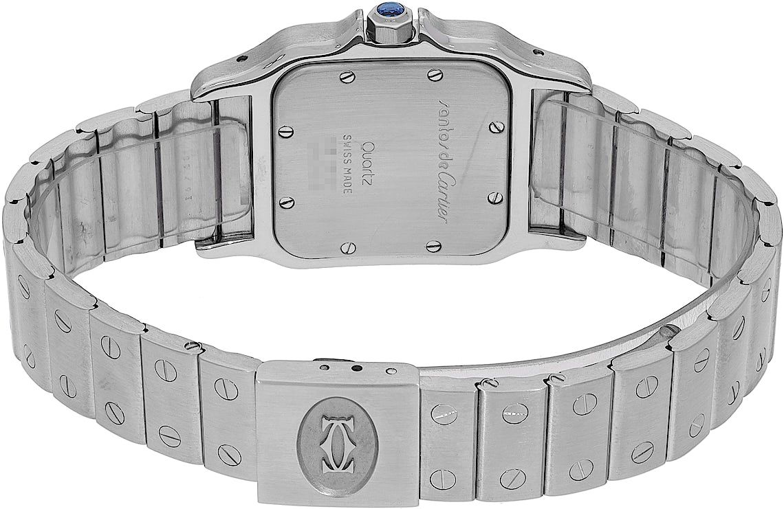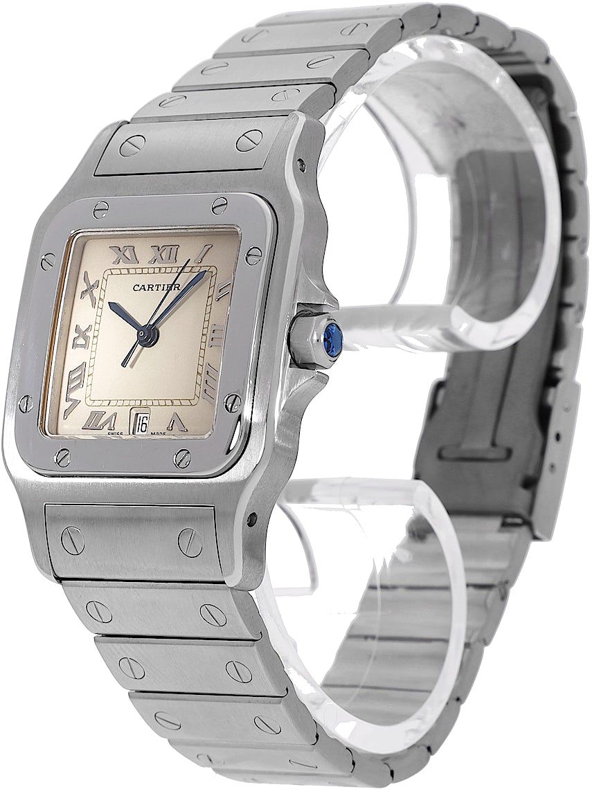 Cartier Santos, Reference: 987901, Gender: Unisex, Size: 29mm, Dial color: Beige, Strap material: Stainless Steel, Movement: Quartz, Condition: Previously worn with some signs of usage. The movement is flawless and the case has been cleaned. watch tested to ensure full functionality. An inspection by our certified watchmakers guarantees its authenticity., Documents: Original papers, CHRONEXT Certificate