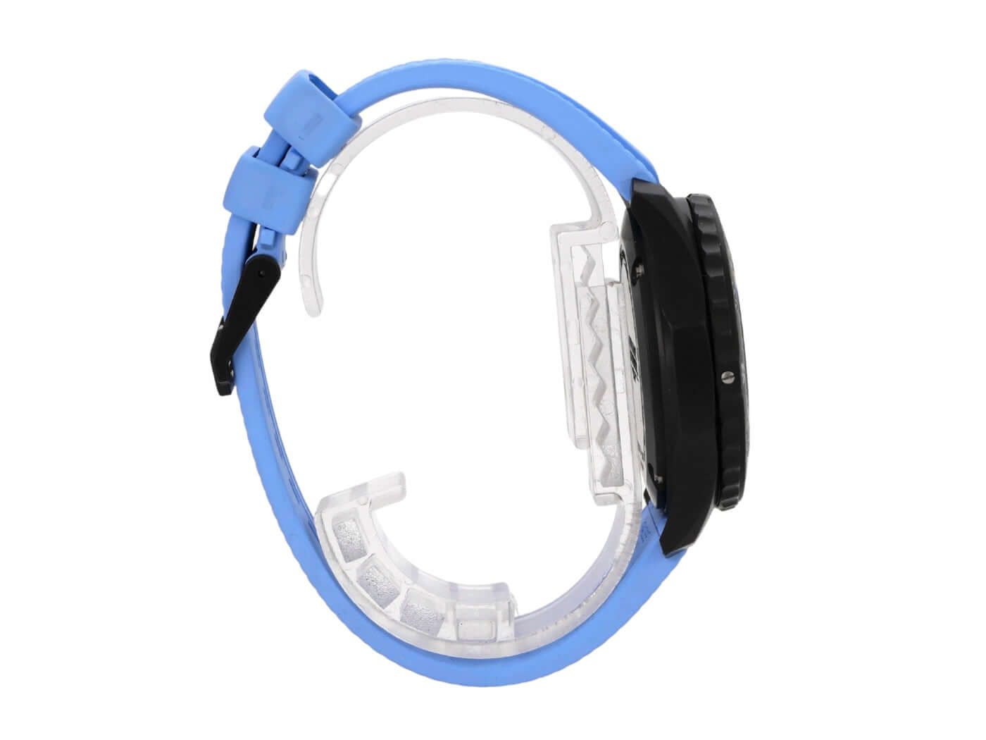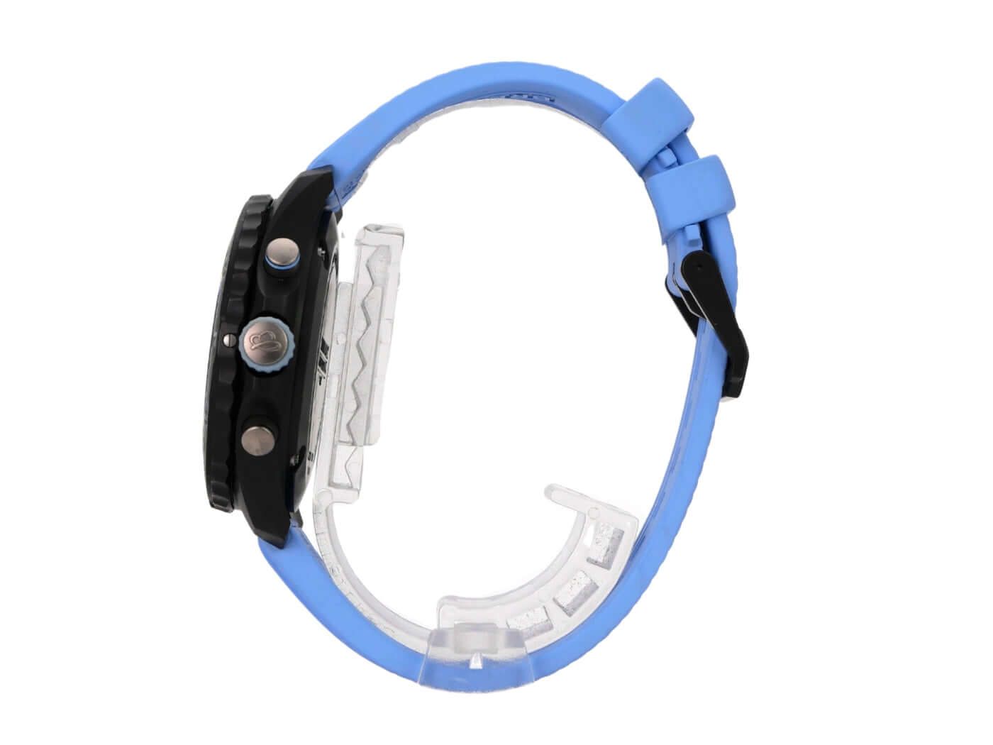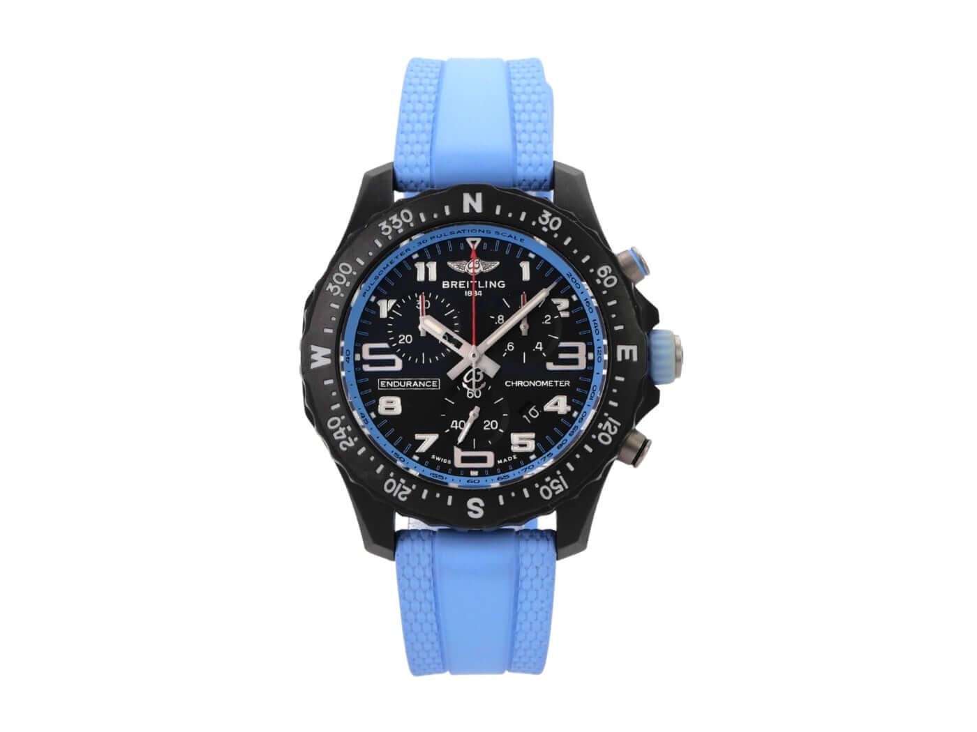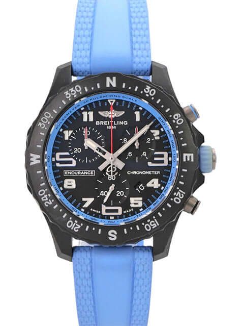 Breitling Endurance Pro 38 X83310281B1S1Case made of Breitlight, case diameter 38 mm, case height 12.1 mm, Breitlight bezel bi-directional rotating, blue rubber strap with pin buckle, black dial with applied luminous numerals and luminous hands, quartz movement, Breitling 83, date display, chronograph, chronometer, sapphire crystal double anti-reflective coating, Breitlight case back, water-resistant up to 10 bar.
