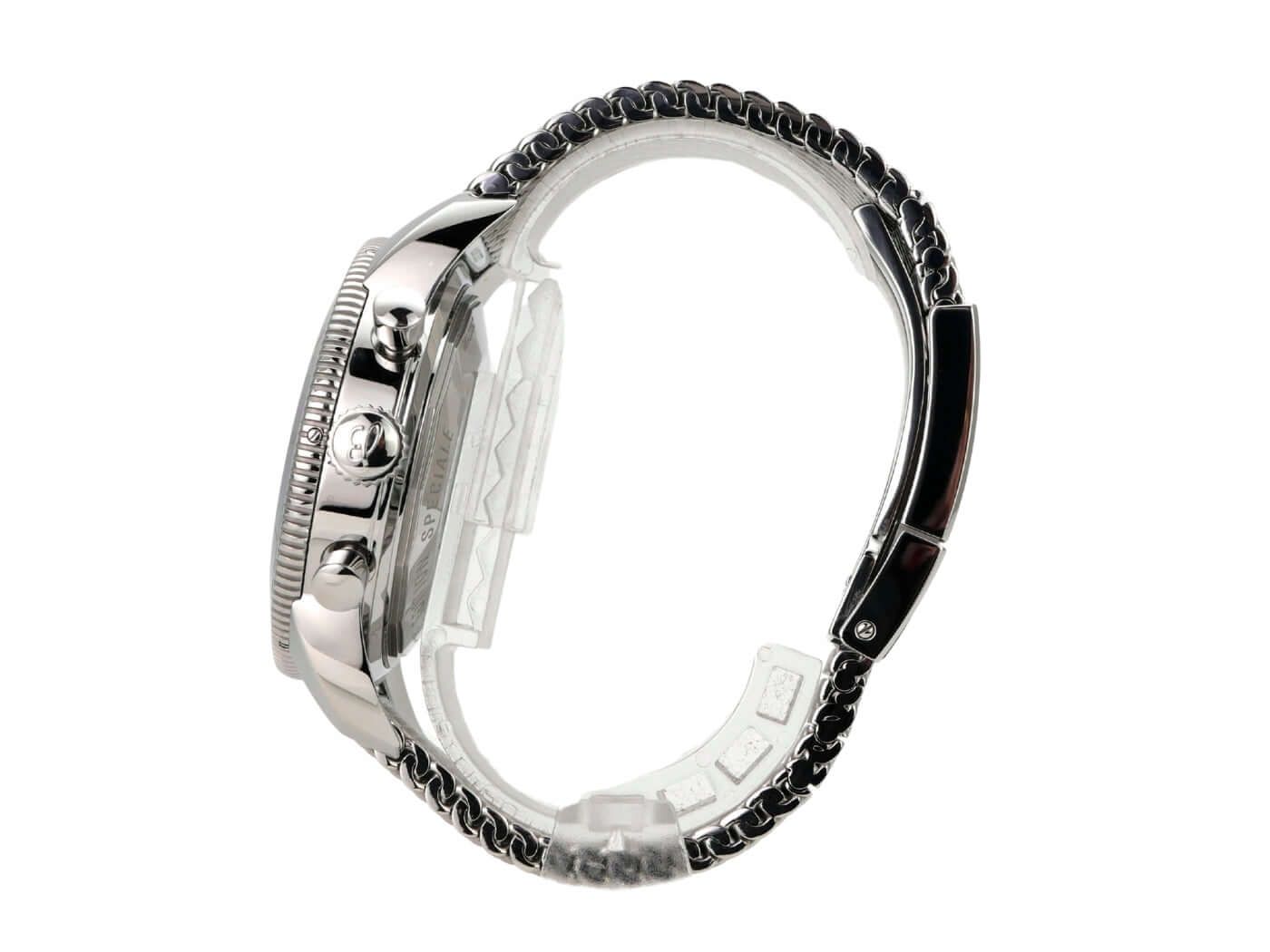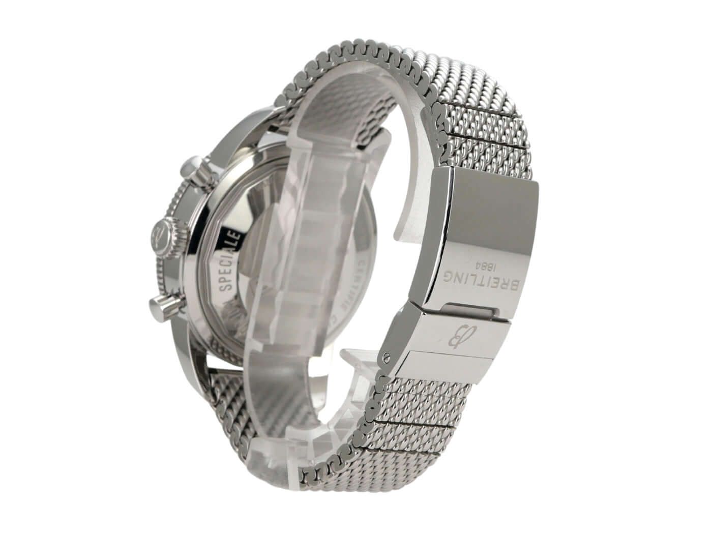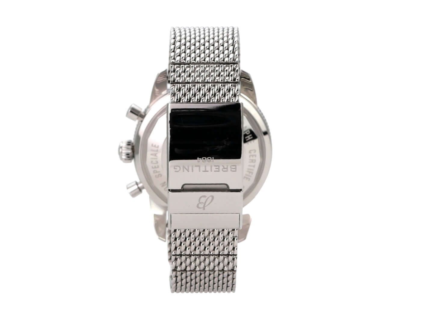 Caixa feita de aço inoxidável polido e acetinado, diâmetro da caixa 44 mm, altura da caixa 15,65 mm, bezel de aço inoxidável com inserto de cerâmica azul, rotativo unidirecional com trava, pulseira de aço inoxidável com fecho dobrável, pulseira de borracha azul Aero Classic com fecho dobrável, mostrador azul com índices luminosos aplicados, ponteiros luminosos, movimento automático, calibre Breitling 13 com 25 rubis, frequência de 28.800 vibrações por hora, reserva de marcha de aproximadamente 42 horas, display de data, cronômetro com certificado, cristal de safira, dupla camada anti-reflexo e coroa rosqueada com 2 gaxetas, fundo da caixa de aço inoxidável rosqueado, resistente à água até 20 bar.