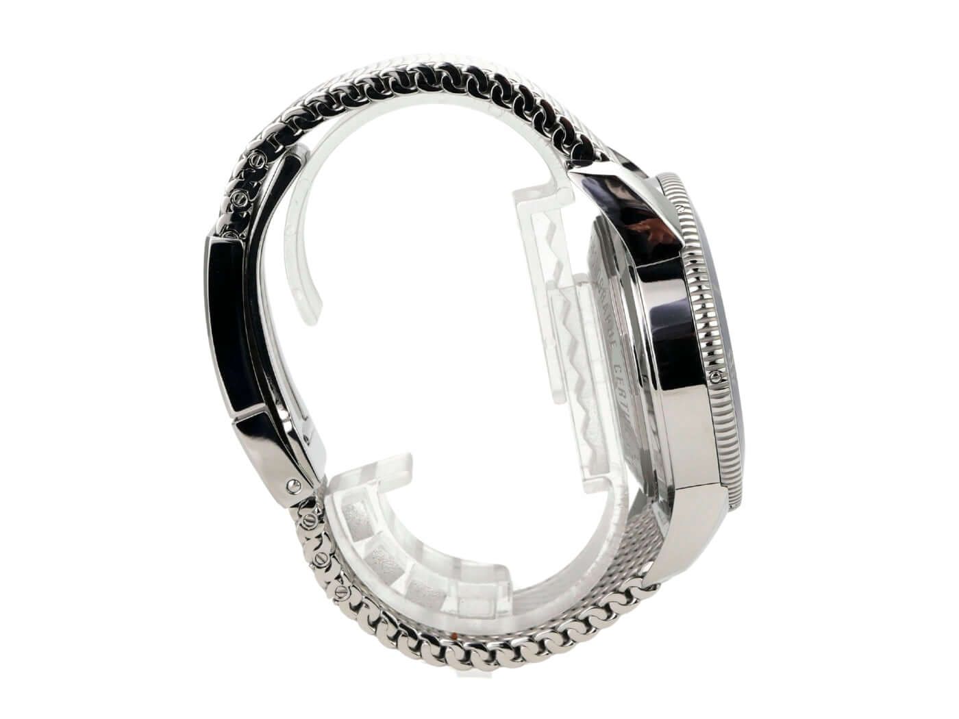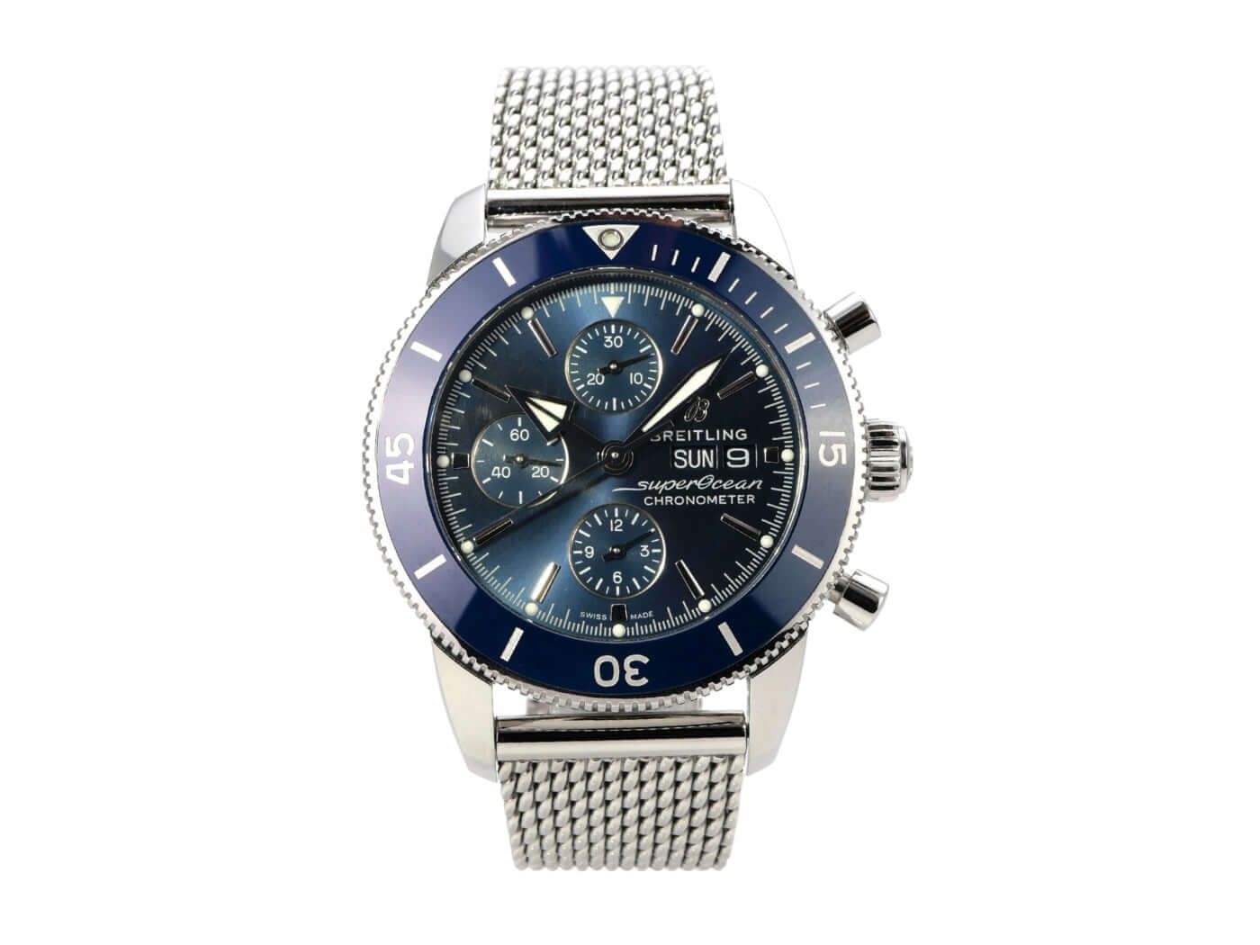 Breitling Superocean Heritage II Chronograph 44 Ref. A13313161C1S1 from 2019Case made of polished and satin-finished stainless steel, case diameter 44 mm, case height 15.65 mm, stainless steel bezel with blue ceramic insert, unidirectional rotating with lock, stainless steel bracelet with folding clasp, blue Aero Classic rubber strap with folding clasp, blue dial with applied luminous indices, luminous hands, automatic movement, Breitling caliber 13 with 25 jewels, frequency 28,800 vibrations per hour, power reserve approx. 42 hours, date display, chronometer with certificate, sapphire crystal, double anti-reflective coating and domed, screw-down crown with 2 gaskets, screwed stainless steel case back, water resistant up to 20 bar.