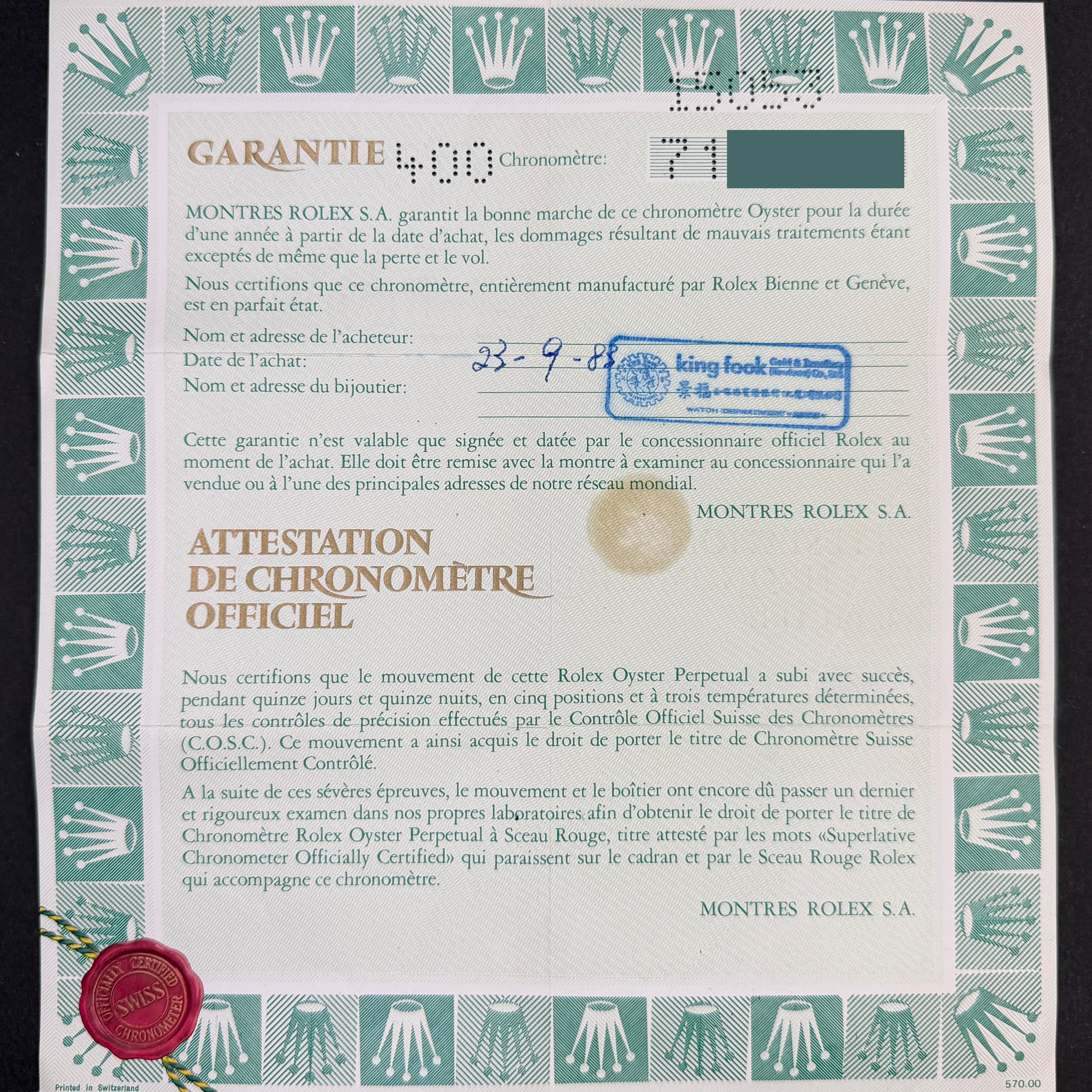 This Rolex Oyster Perpetual Date 15053 features a Blue dial and is crafted from 18K yellow gold and stainless steel, with a production year of 1982.Case No: 718XXXX