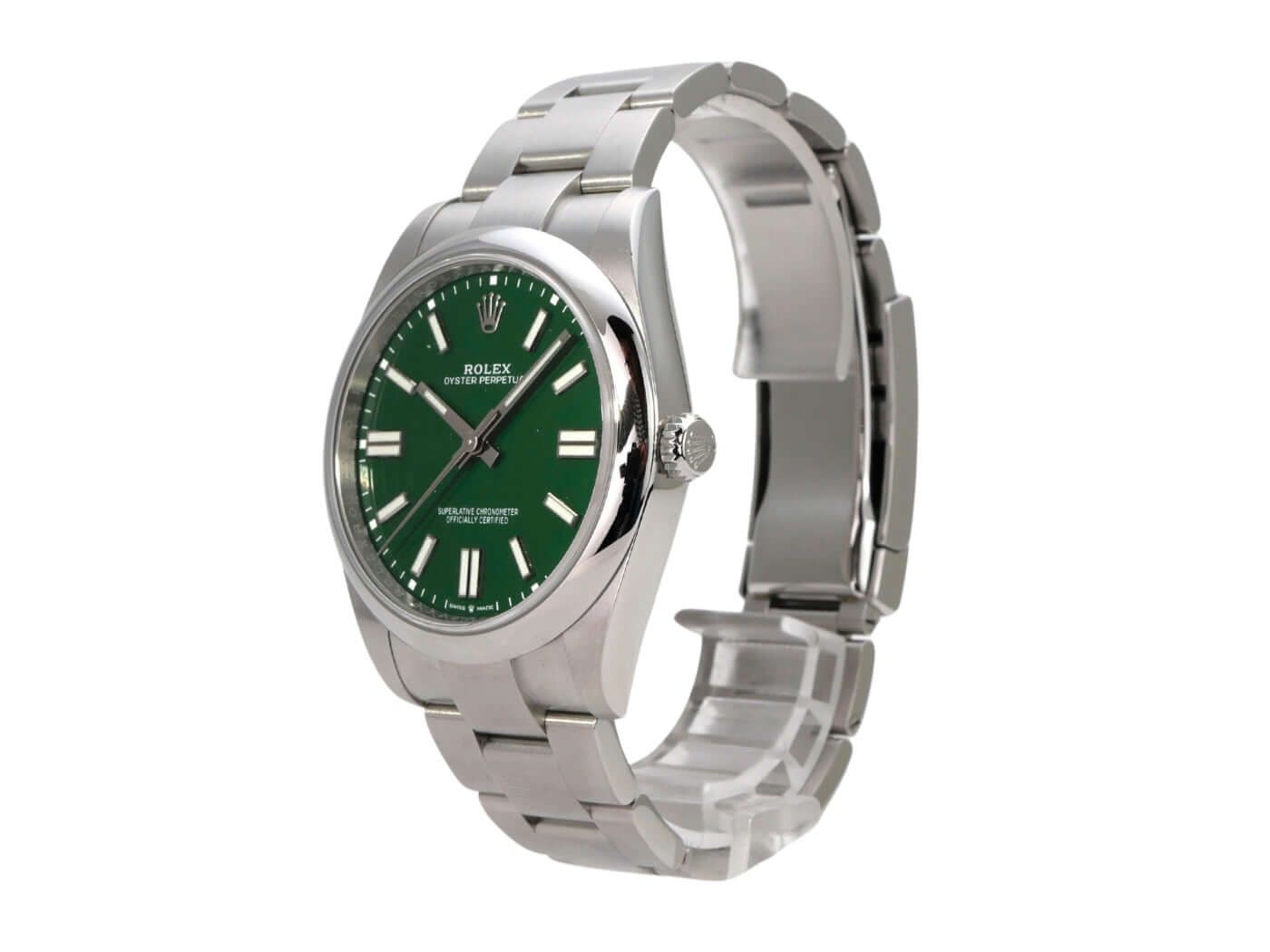 Case made of polished and satin-finished stainless steel, case diameter 41 mm, Oyster stainless steel bracelet with folding clasp, green dial with indices, automatic, Rolex manufacture caliber 3230, power reserve 70 hours, sapphire crystal, water-resistant up to 10 bar.